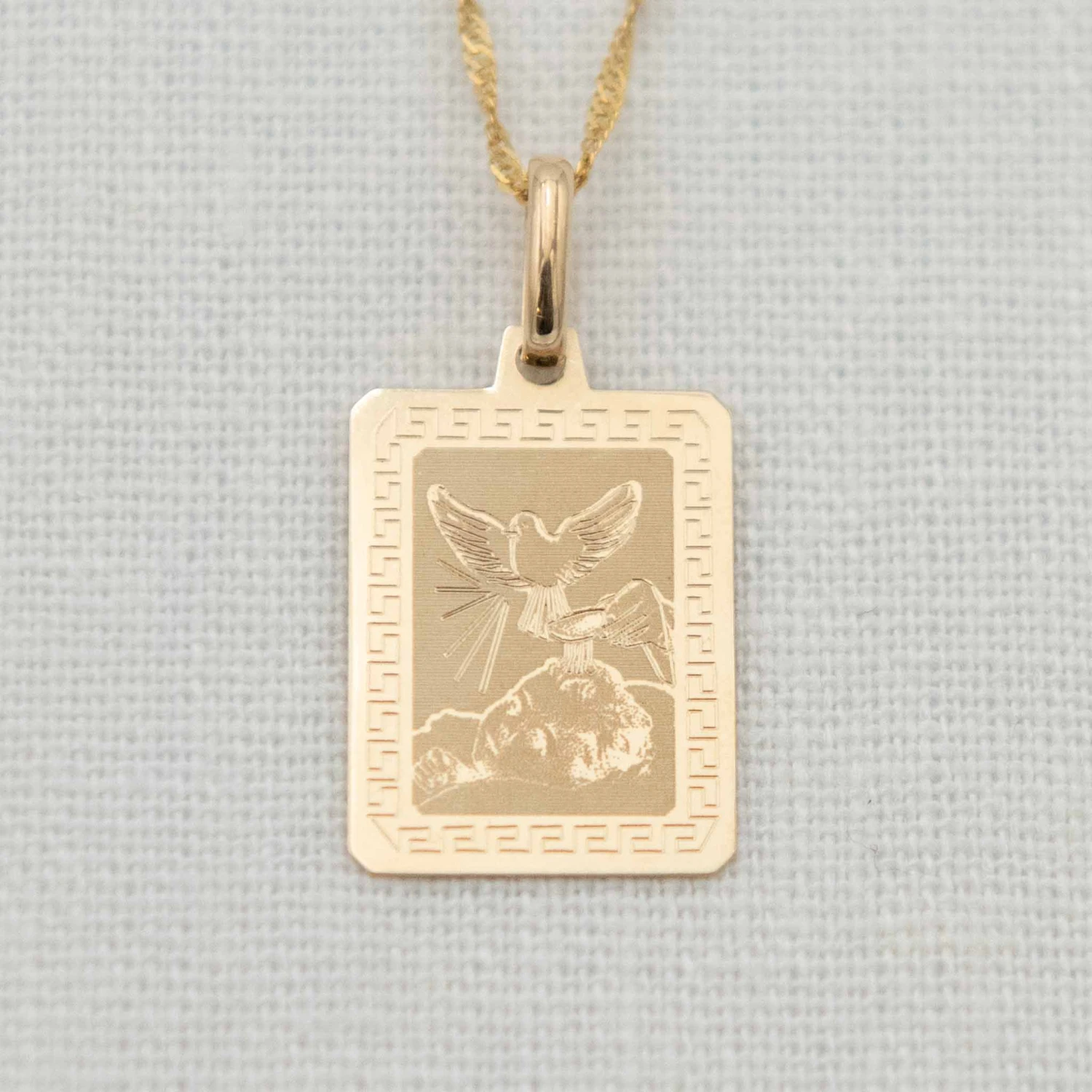 A beautiful necklace for their important day! 14k solid gold rectangle etched blessing charm with 16″ 14k solid gold chain. Charm depicts a baby being blessed and a dove soaring above, with a meander decorative border. Your little one will be able to show their faith proudly with this cherished gift. A perfect addition to an already special day.