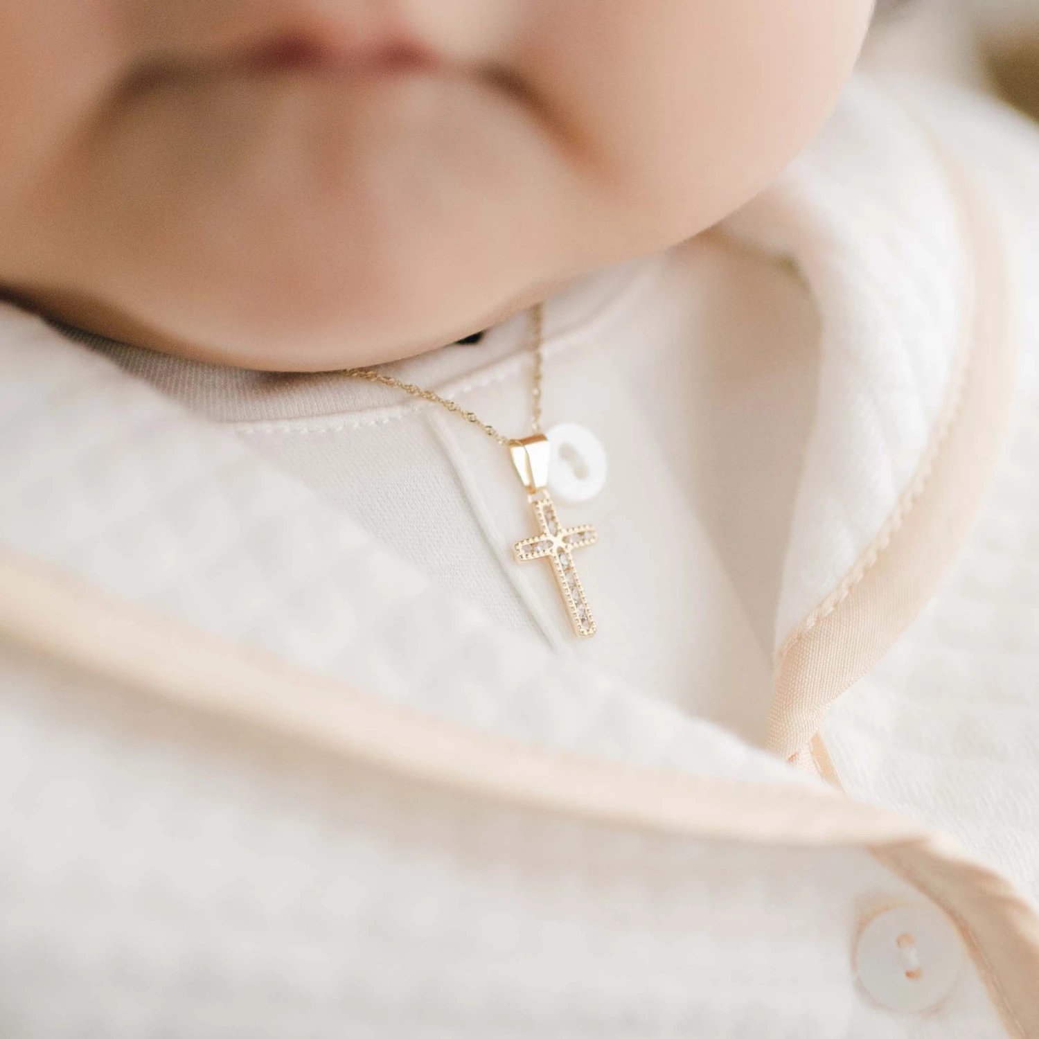 This cross from our Christening jewelry collection is all about the beautiful details. It’s the perfect accessory to elevate any outfit and can be worn for years to come. Made of 14k gold and adorned with sparkling cubic zirconia crystals, the necklace comes with a solid gold chain, making it a timeless and versatile addition to anyone’s jewelry collection. Buy with confidence, knowing that the recipient will undoubtedly love this necklace.