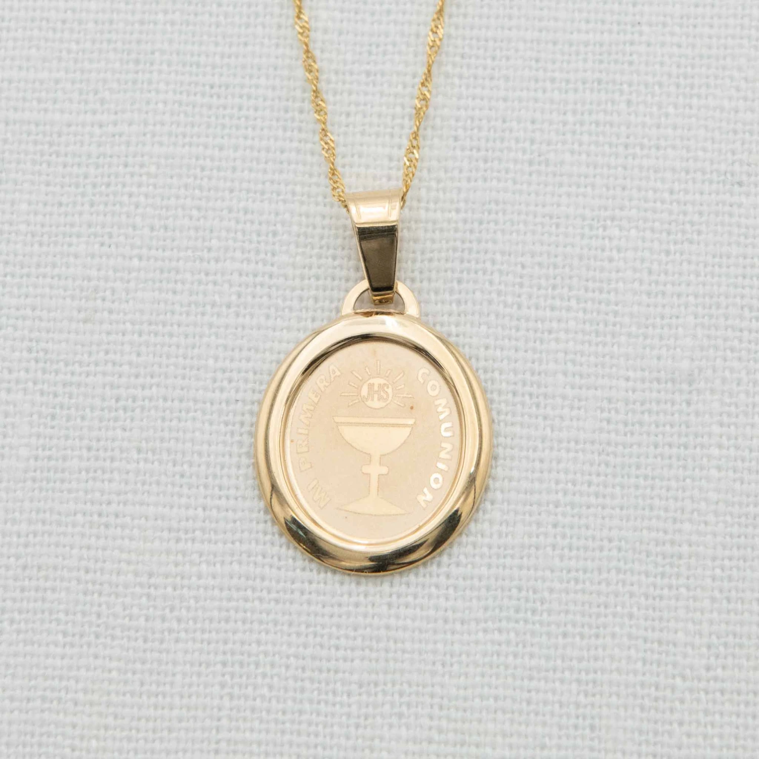 A beautiful necklace for their important day! 14k solid gold oval etched communion charm with 16″ 14k solid gold chain. Charm reads: “Mi Primera Comunion” – “My First Communion” with a beautiful “JHS” above a Holy Chalice scene. Your little one will be able to show their faith proudly with this cherished gift. A perfect addition to an already special day.
