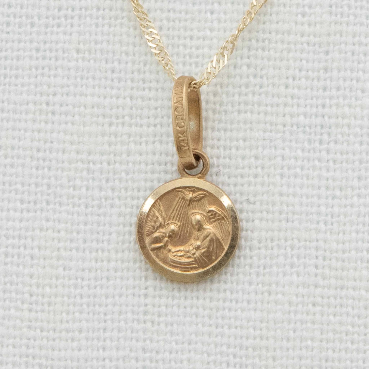 A beautiful gold charm necklace that he will cherish from their Christening day. Made with 14K solid gold, this round gold charm features an intricate religious scene. Includes the solid gold chain necklace that is the perfect length for infants, but will still fit for years to come. A true heirloom Christening gift that will be kept for years.