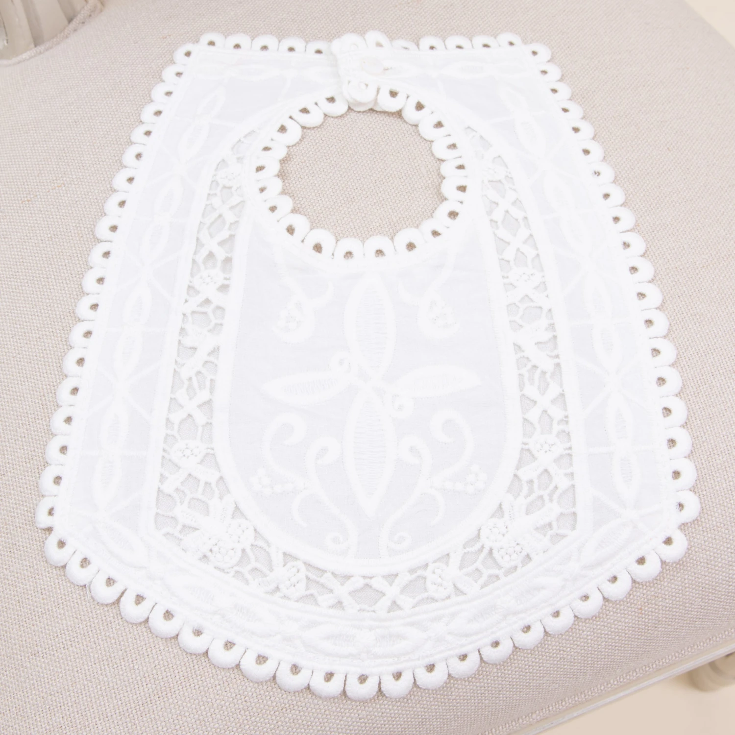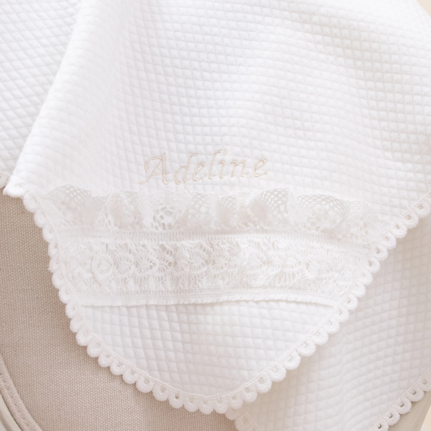 Everything needed to complete your baby girls Adeline Christening gown is available here in this convenient package, and at a discounted price. This Baptism accessory set includes her Ivory lace baby shoes so her designer baptism gown is perfectly styled from head to toe. It also includes her lace Adeline bib to protect her blessing gown from messes, and her personalized quilted blanket with her name embroidered in champagne thread on the corner for a gift she will cherish for years. The darling lace headband is perfect to switch with her bonnet for a more contemporary style at her after christening party. This set is timeless enough that it makes a perfect baby shower gift to pair with any special occasion baby dress. Save 15% over purchasing these pieces separately.