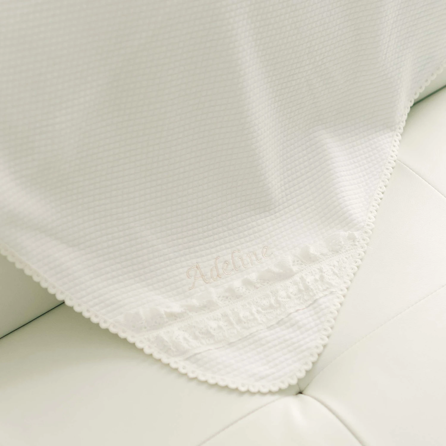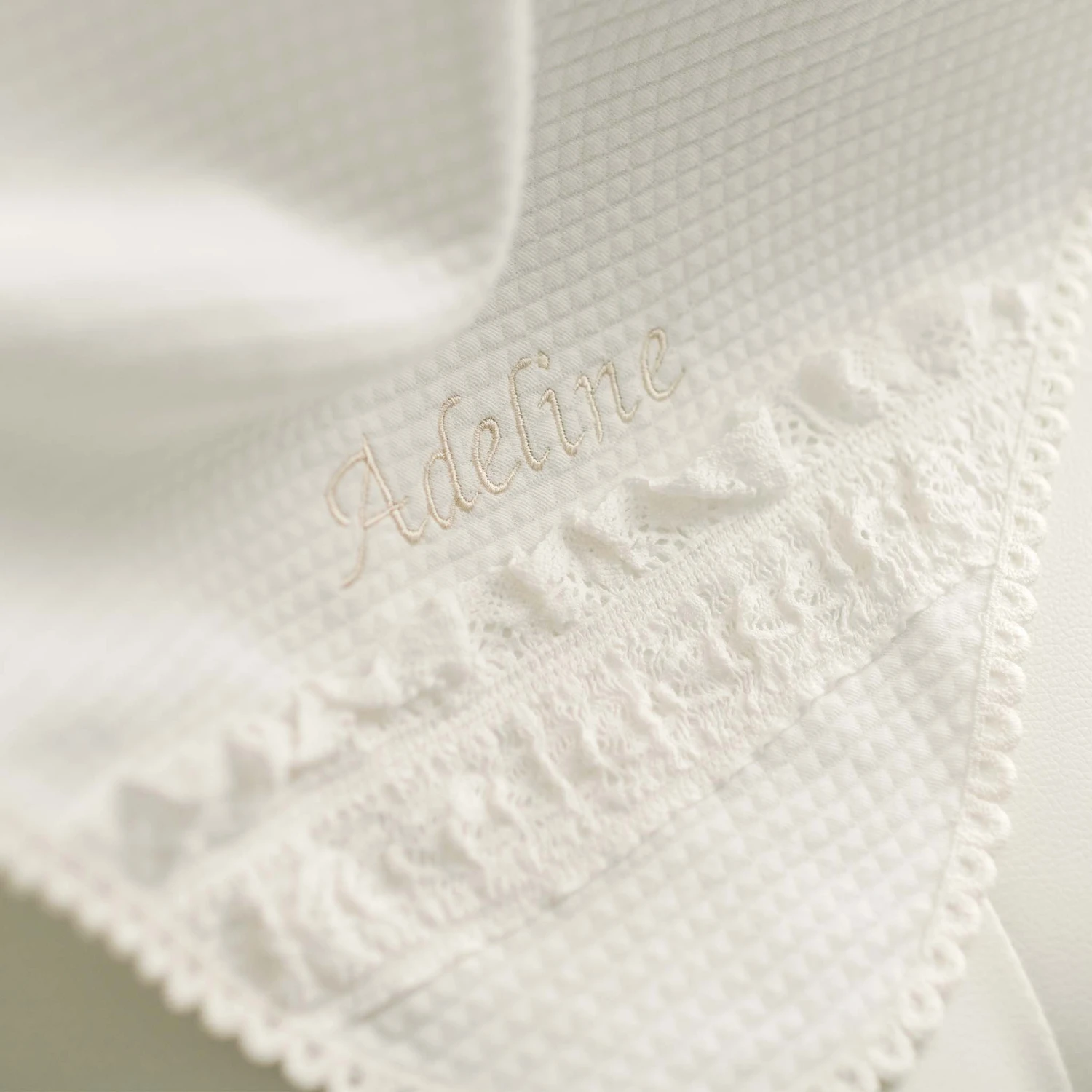 A beautiful blanket for your little one’s special day! Crafted with our soft and plush quilted cotton. One corner of the blanket features a beautiful ivory lace, have baby’s name embroidered on the corner to create a special keepsake.