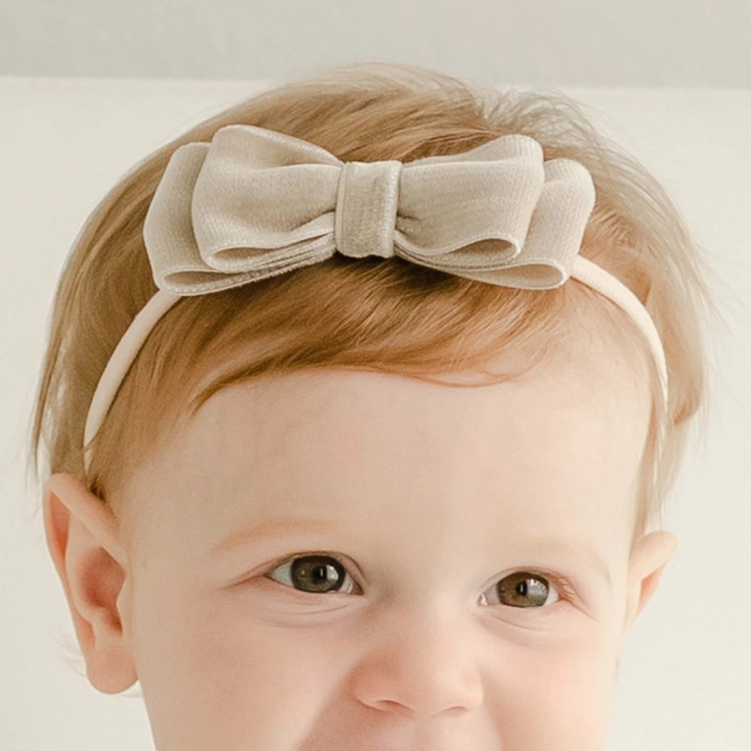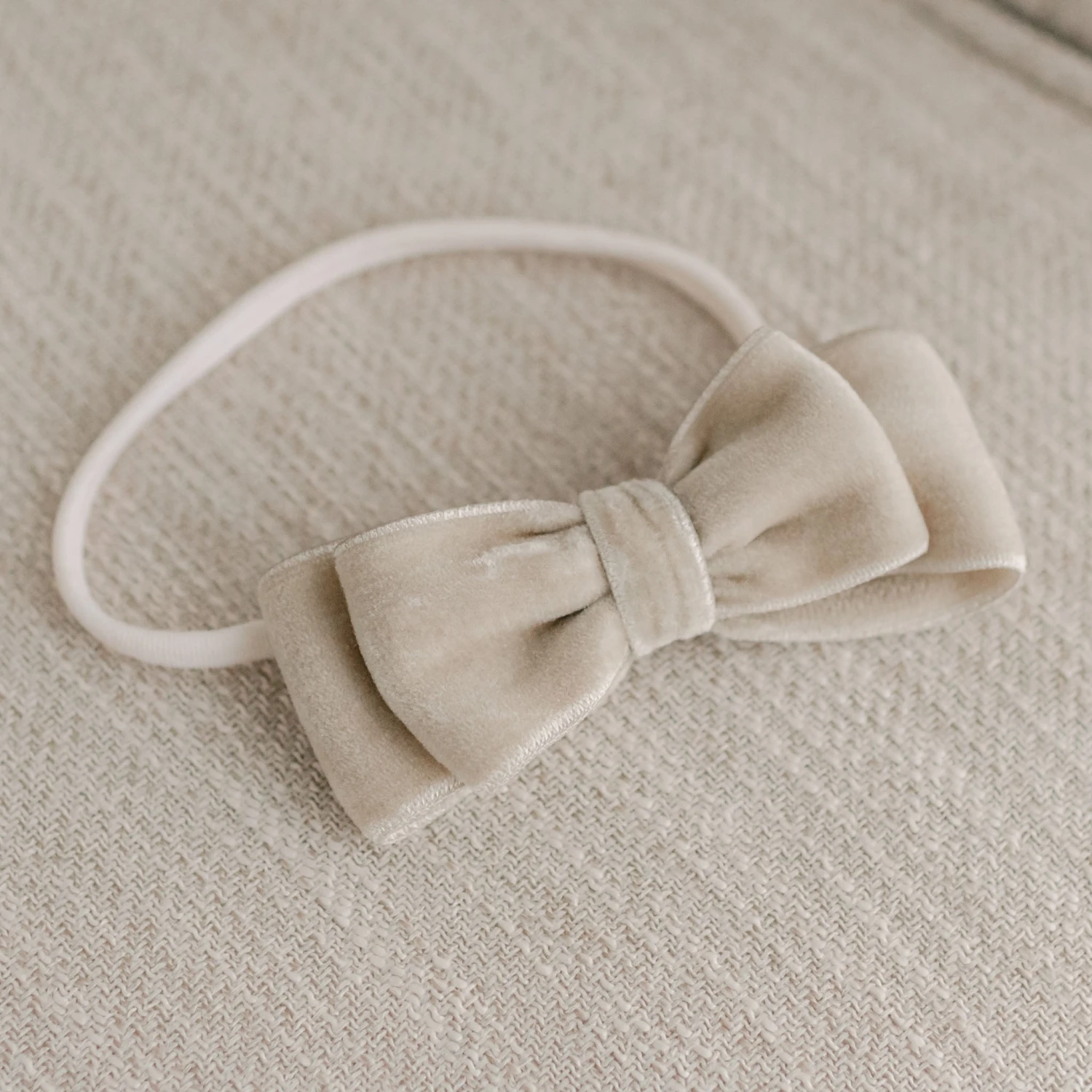 Sweet and chic, made with a super soft velvet ribbon, our tiered double loop velvet bow headband is the perfect finishing touch to her special outfit! A hand-stretched nylon band allows for a comfortable fit that will grow with your little one.