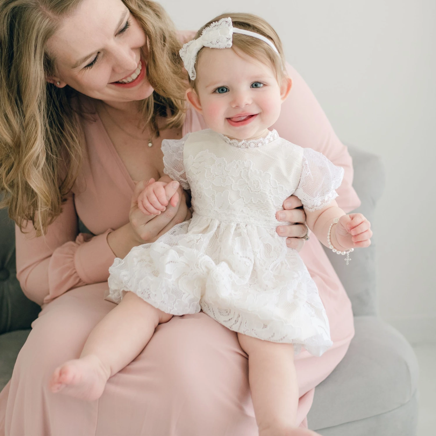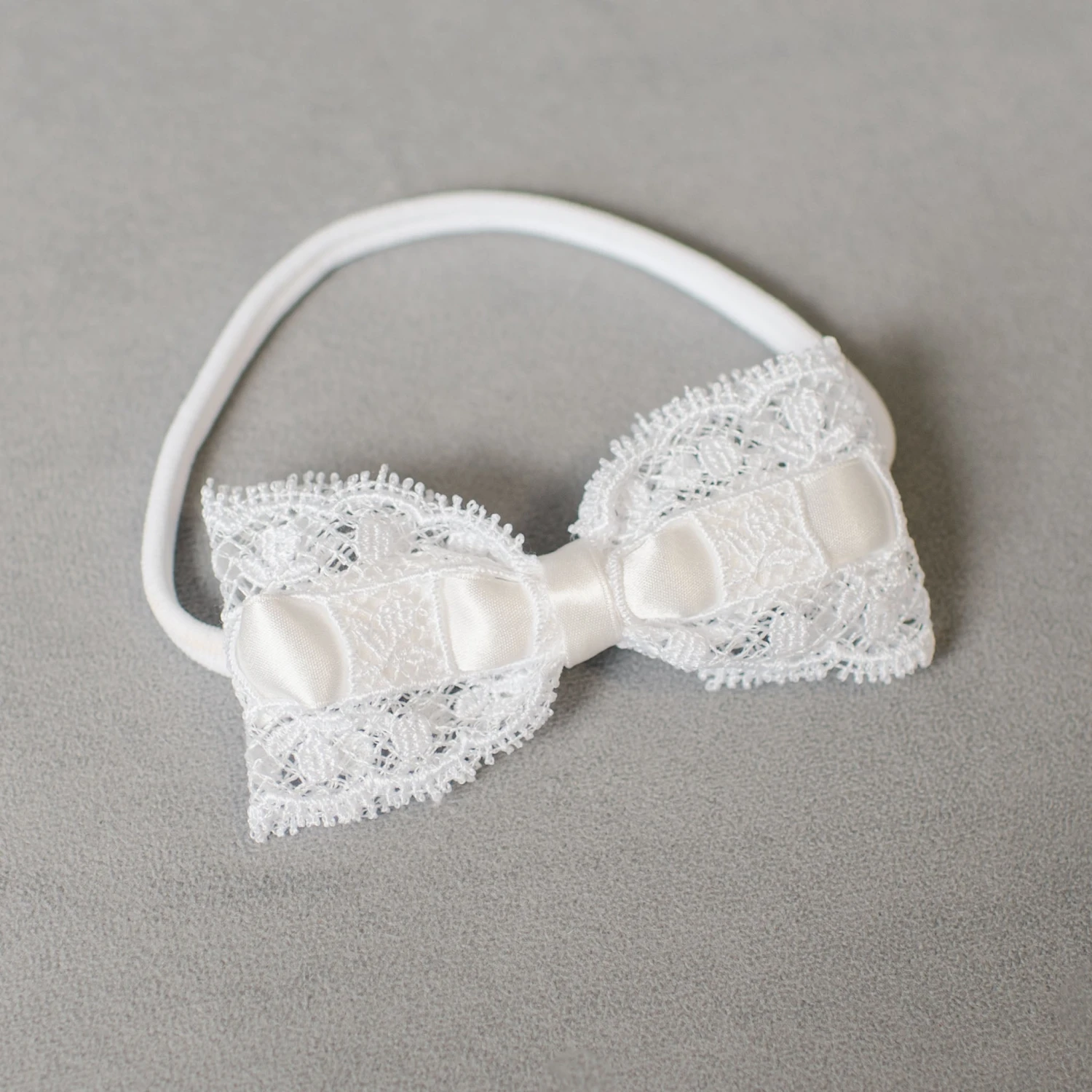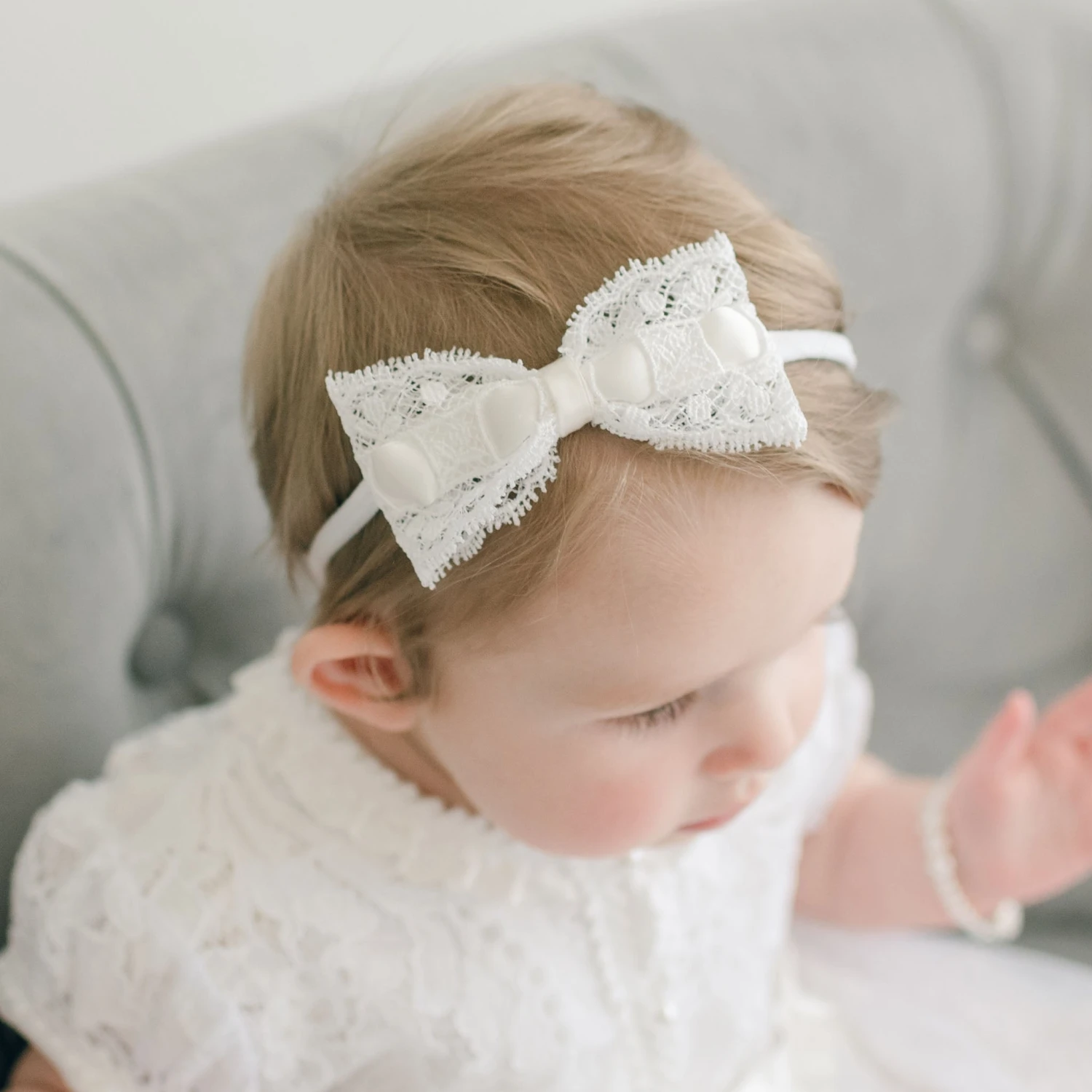 An adorable addition to her Aria gown, romper or any outfit! The Aria lace bow headband is made with a super soft hand-stretched nylon band to give her the most comfortable and easy fit and finished with a sweet bow made with the matching white edge lace and silk ribbon. A look that is sure to please!