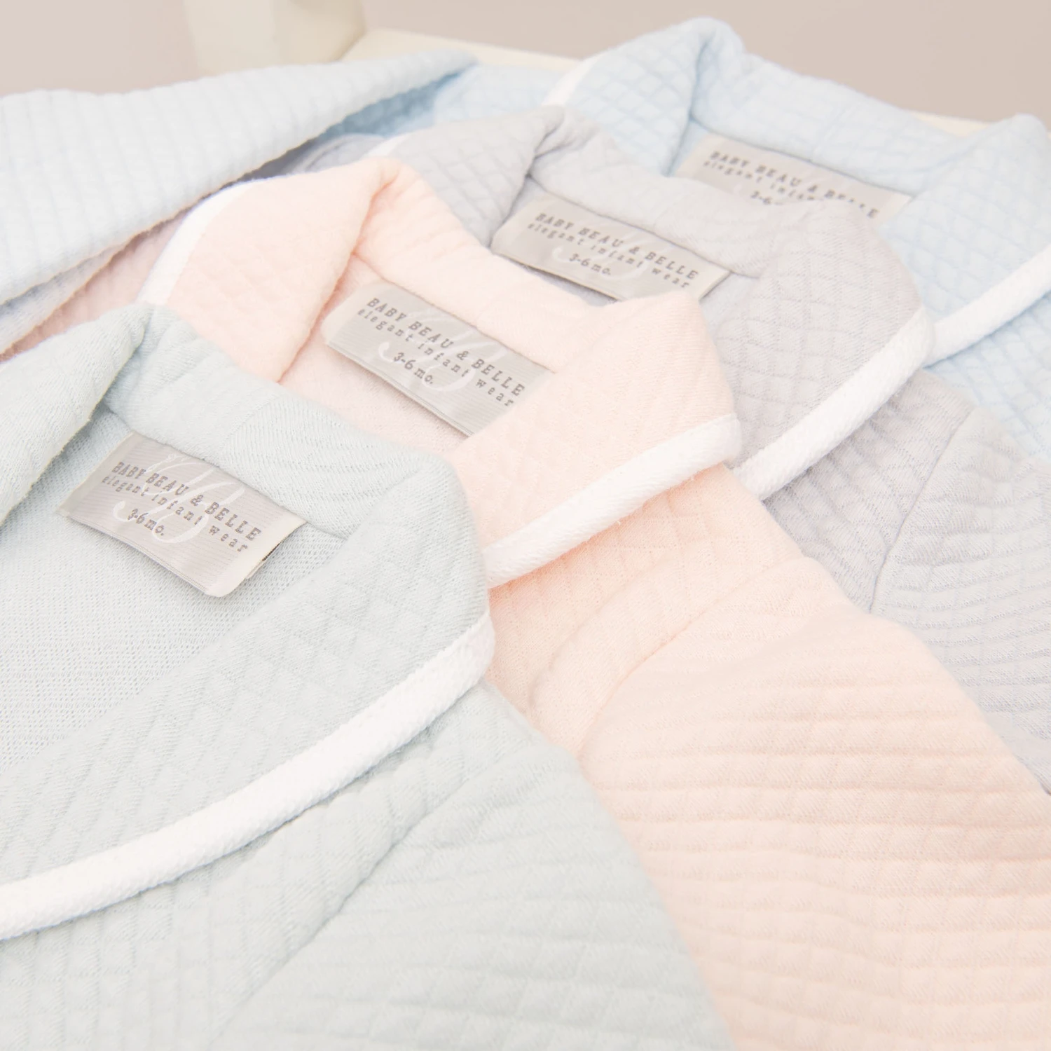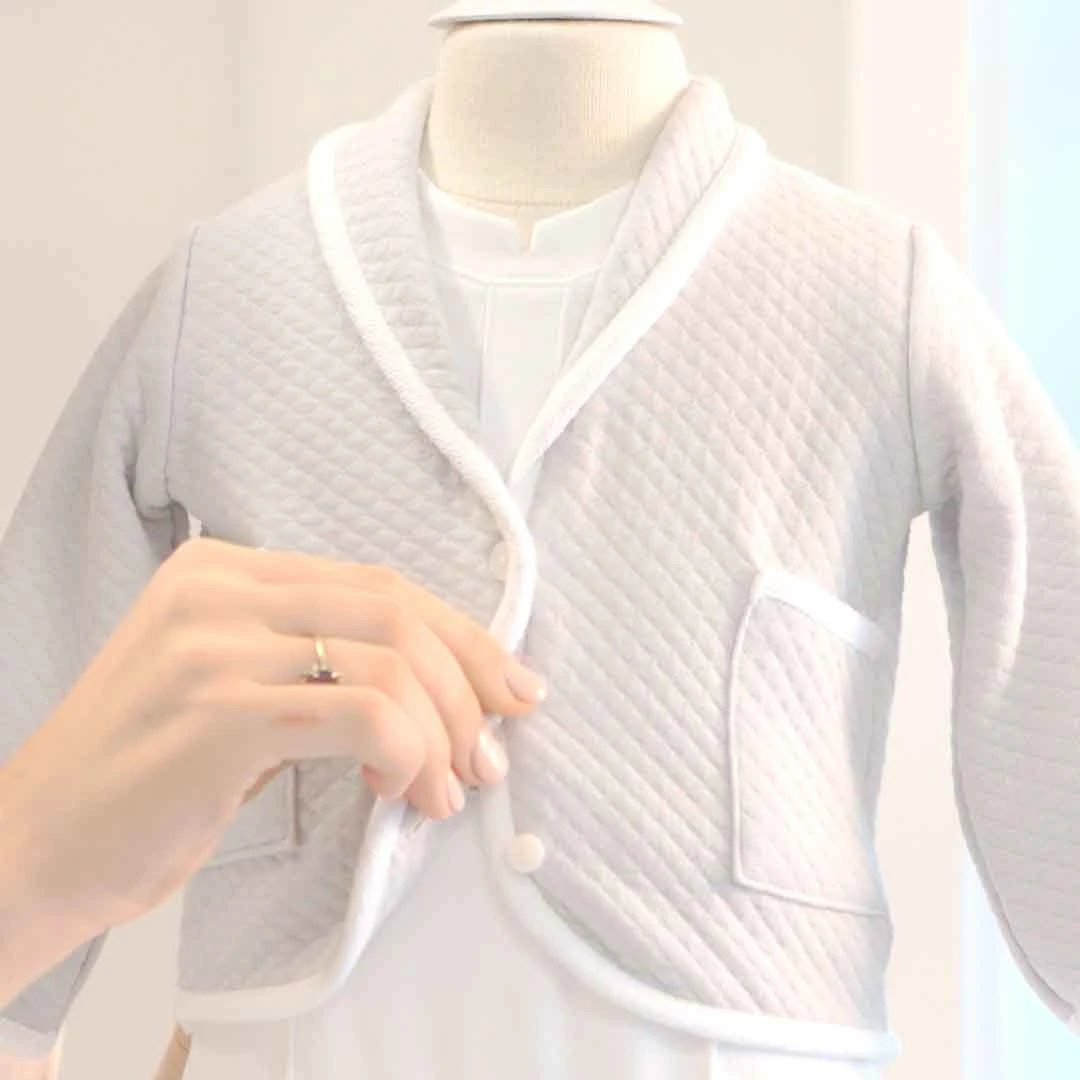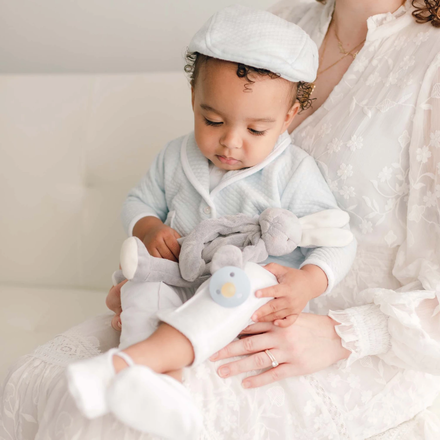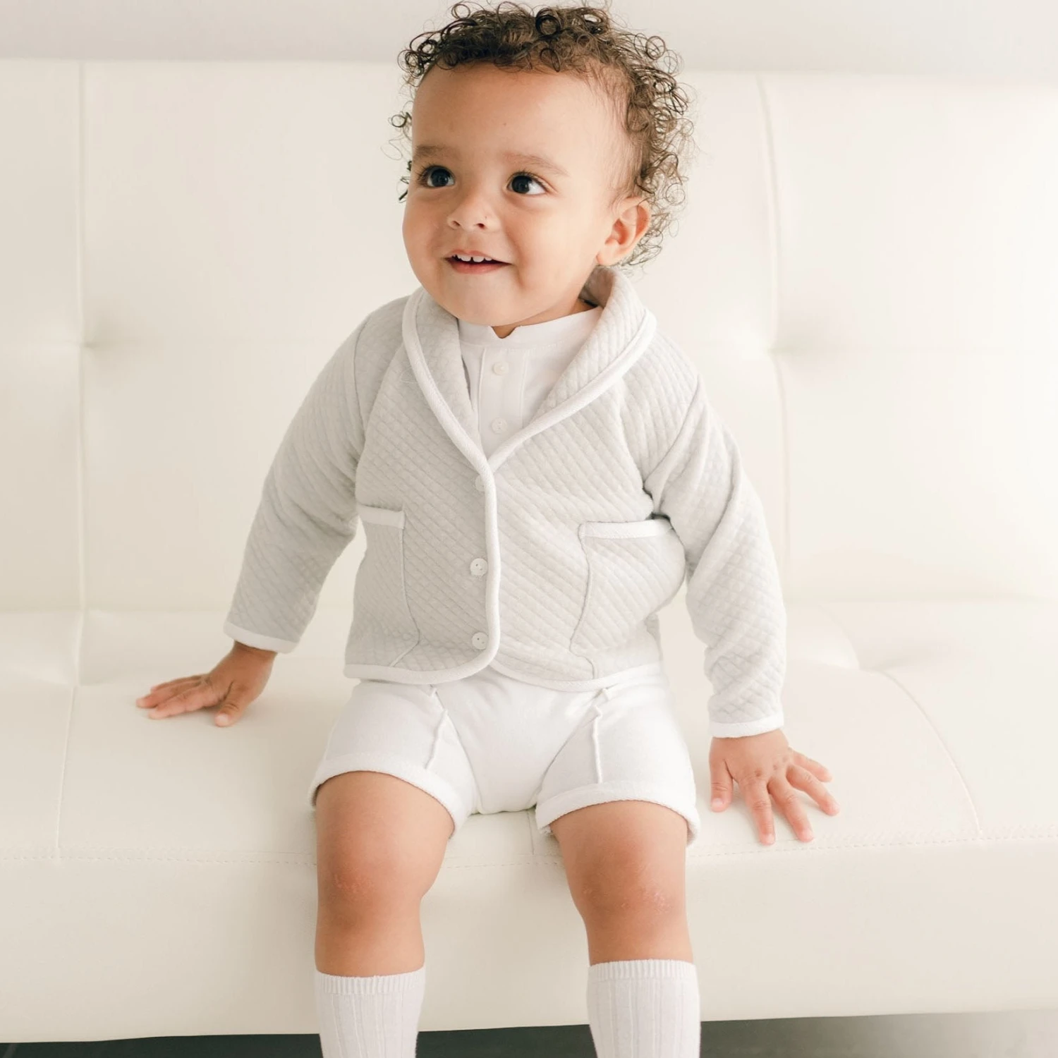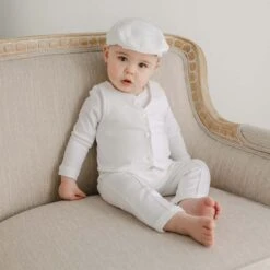 Our Asher baby boy suit was specially created for your newest little one. Made with plush quilted cotton and white French terry cotton, this baby boy 3-piece suit has special texture details not found in most newborn dress suits. The folded collar and functional little pockets on the jacket are darling, and the pleated front creases on the pants make him look like a stylish little prince. Pair with the matching newsboy hat, booties and blanket to complete his look. This suit makes the perfect baby boy wedding outfit or is handsome for any special occasion. From bring baby home to first birthday pictures, baptism or wedding, wrap him in the comfort of the Asher baby boy suit!