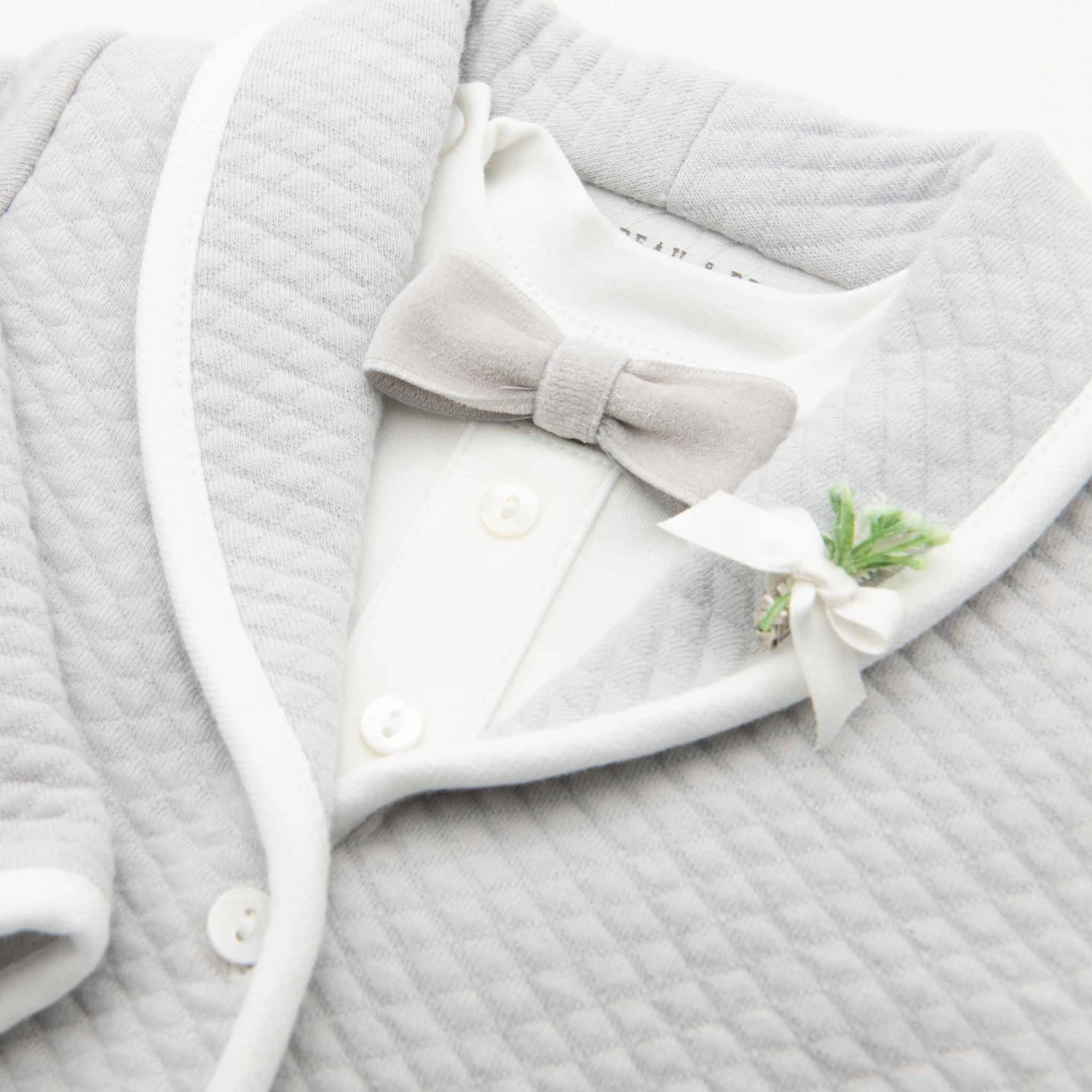 Prepare your little guy for the most important day! Our elegant bow tie and boutonniere made of luxurious velvet will add the perfect touch to his outfit. Easy to attach with a convenient alligator clip and secure pin, these accessories are a must-have. The charming shade of grey perfectly matches the Asher suit.