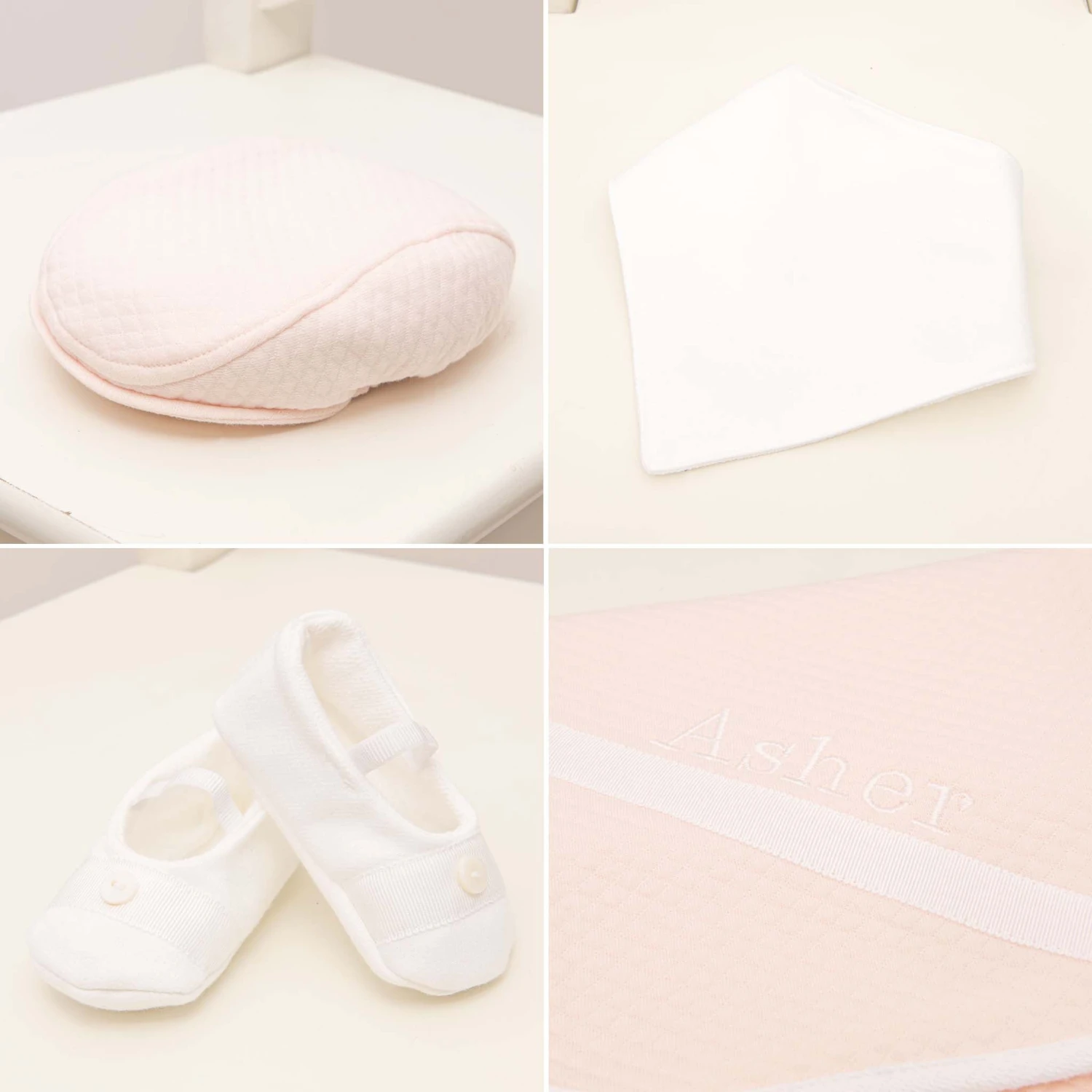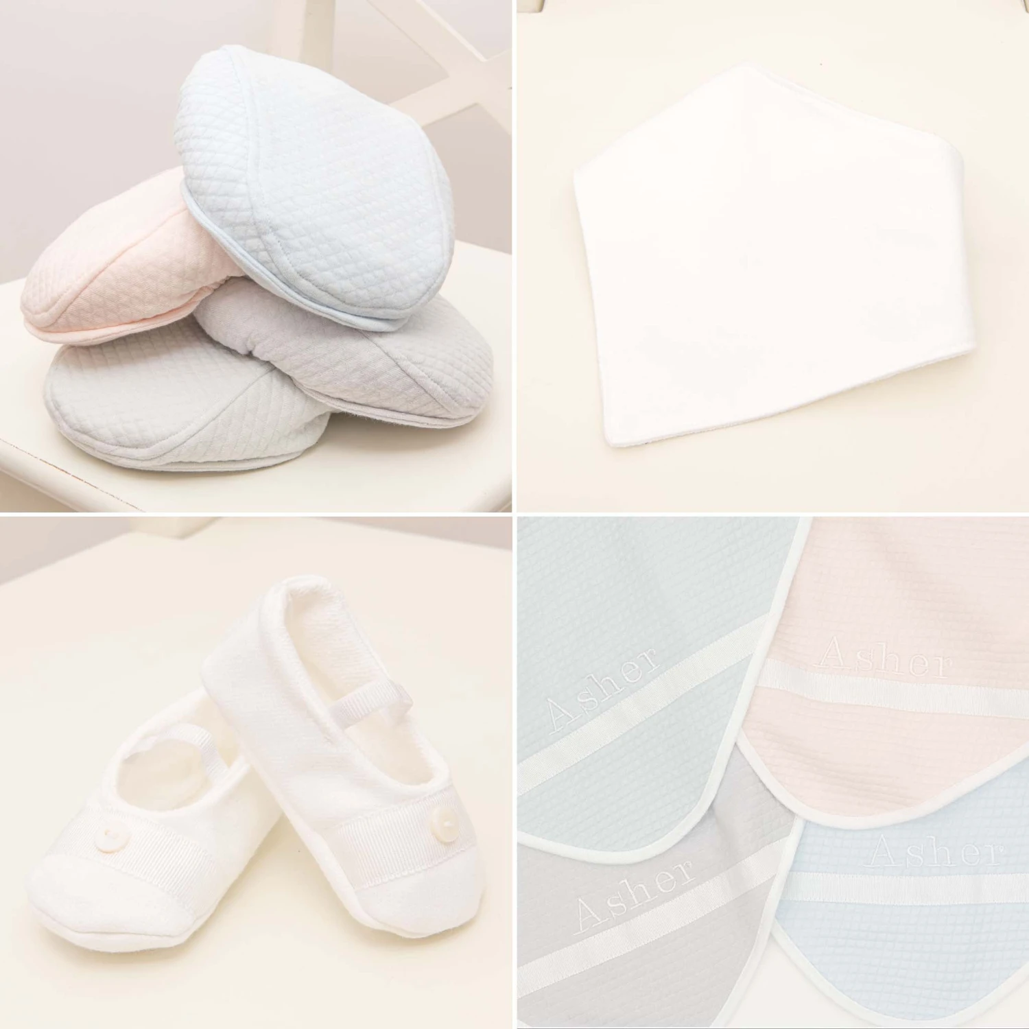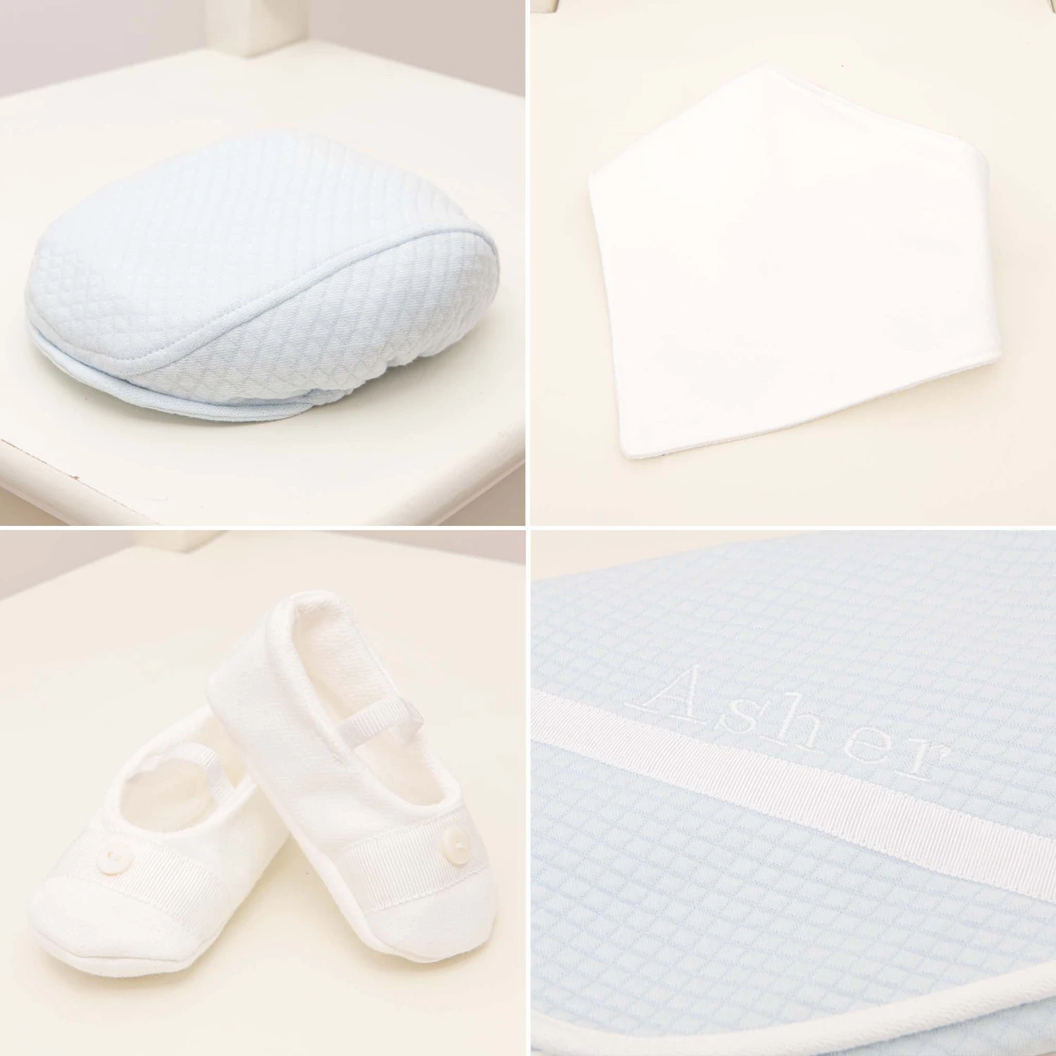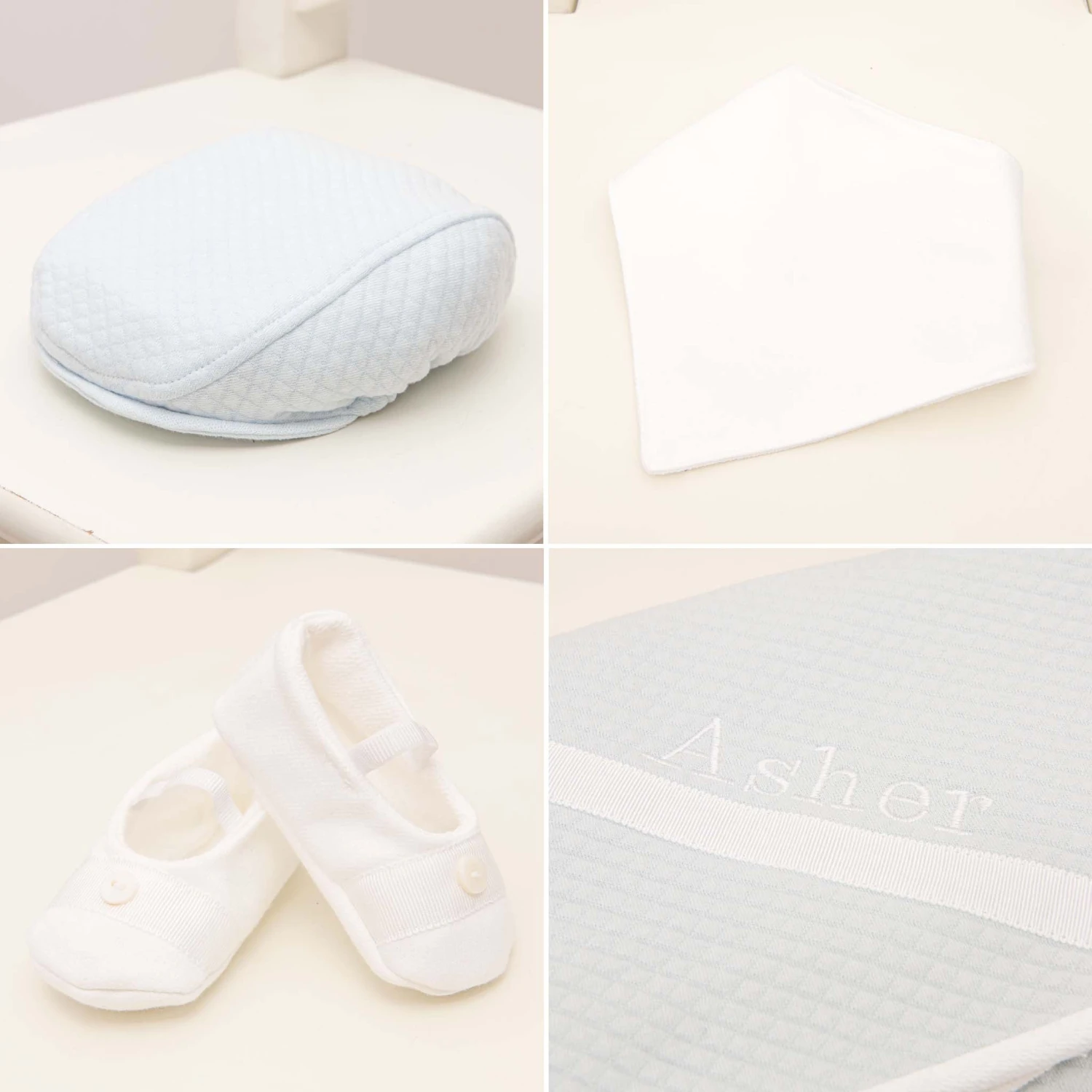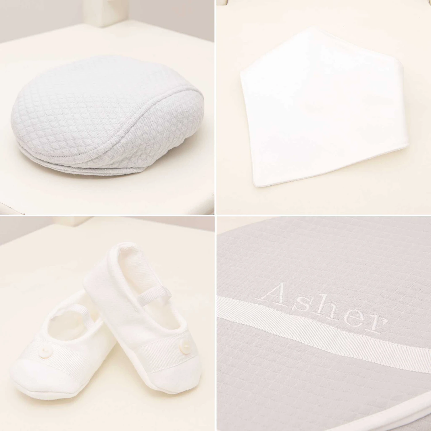 All the pieces needed to complete your Asher baby boys outfit are available here in this convenient package at a discounted price. This accessory set includes his coordinating quilted newsboy hat and booties so he has a tailored look from head to toe. It also includes a bandana bib to protect his baby suit from messes, and his personalized quilted blanket with his name embroidered on the corner for a special gift he will cherish for years, whether used for a baptism, christening, wedding outfit for baby boy, or first birthday outfit. Save 15% over purchasing these pieces separately.