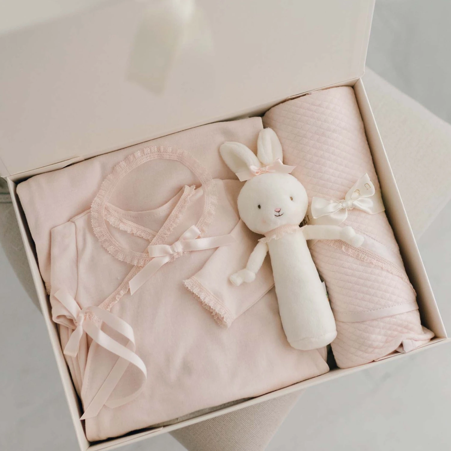 A lovely design for newborn girls that combines our softest cotton with a functional design for newborns. The Ava Cotton Layette is made with 100% pima cotton, known for its soft texture and heirloom quality, in a lovely shade of blush pink. Trimmed with a beautiful and delicate blush lace along the neck, cuffs and hem. The kimono style makes it simple to get your newborn dressed and changed and is secured by blush cotton ribbon ties. The bottom of the layette gown gently gathered to create the perfect length and allow for easy changes. The sets includes the layette gown, matching blush ribbon bow headband, bunny chime rattle and blush quilted blanket. Set will come expertly packaged in a tissue lined gift box.