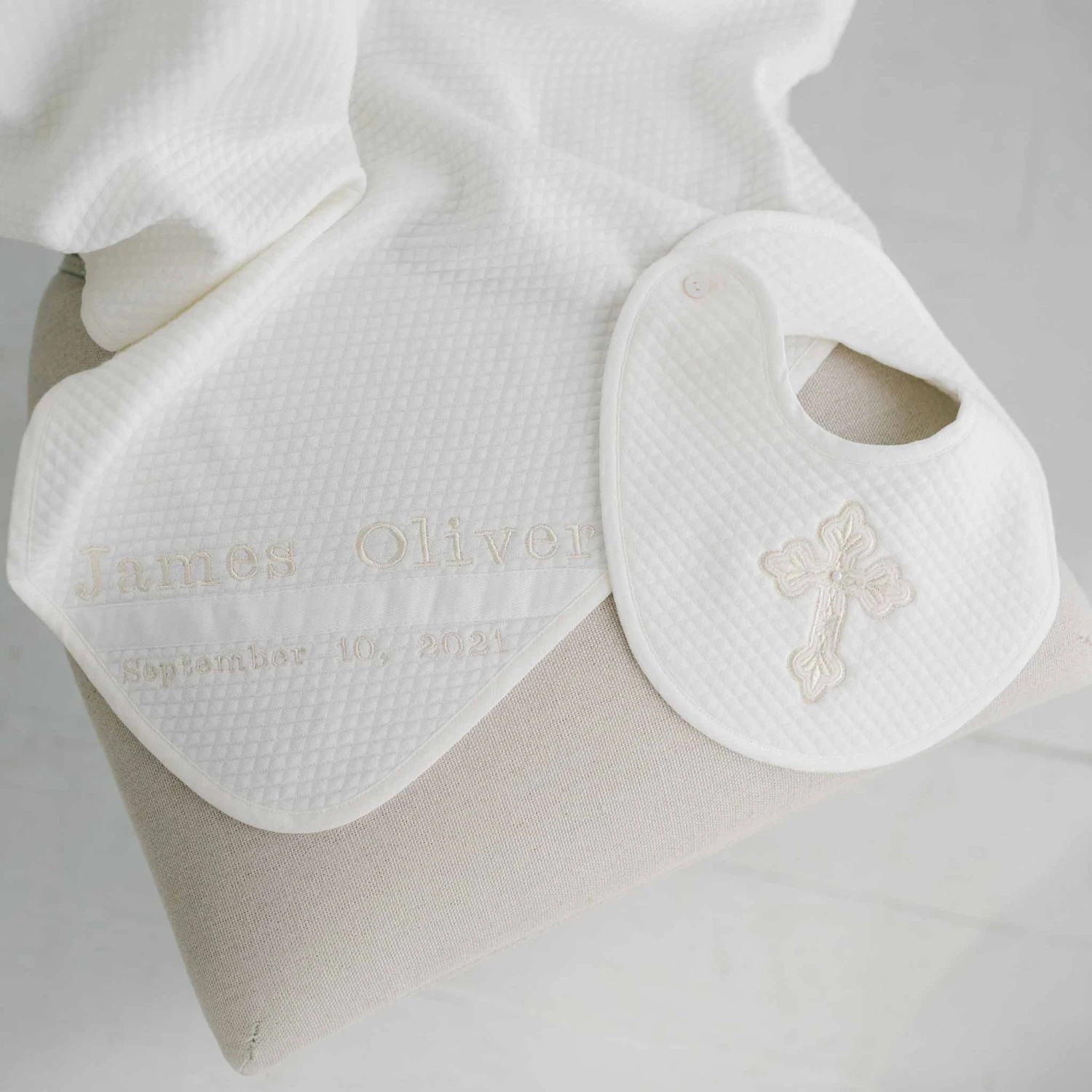 A simply perfect set to gift to little one on their blessing day! A special gift, perfect for godparents, grandparents and parents to present their little one for this very special occasion. Set includes a plush quilted cotton bib embroidered with a cross and finished with a small pearl style bead in the center and the matching quilted cotton blanket embroidered with baby’s name and date on the corner for an extra special keepsake. With the option to add a 14k gold small cross charm necklace, it is the all around complete blessing set. We expertly package each set in a gift box that makes this set s perfect Baptism gift upon arrival!