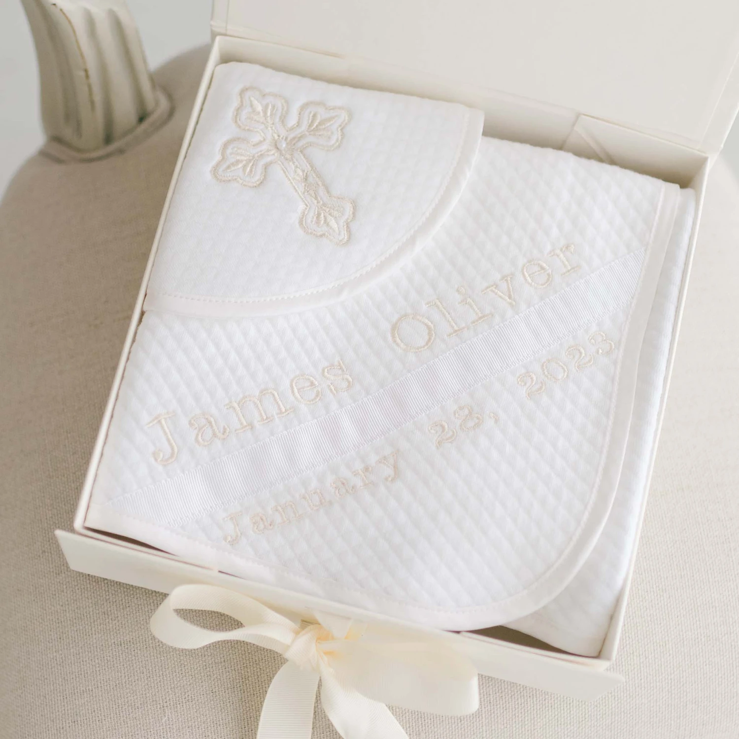 Ivory blanket and bib are trimmed in ivory linen, blanket also detailed with ivory grosgrain ribbon on embroidery corner and bib is finished with an elegant summary closure. Embroidery completed in Champagne thread.