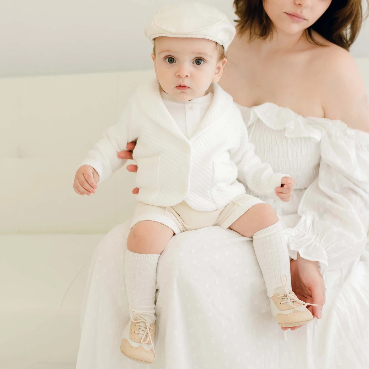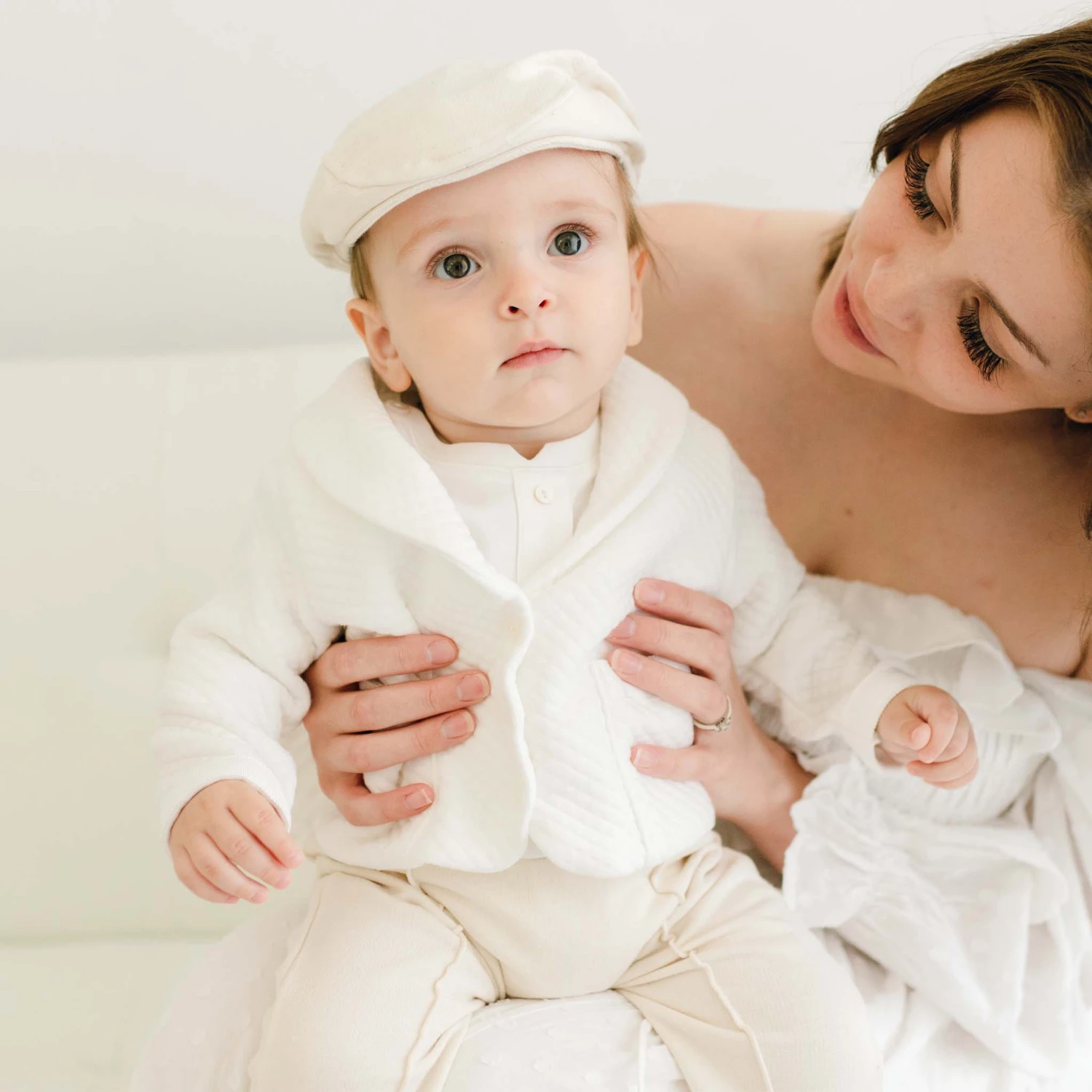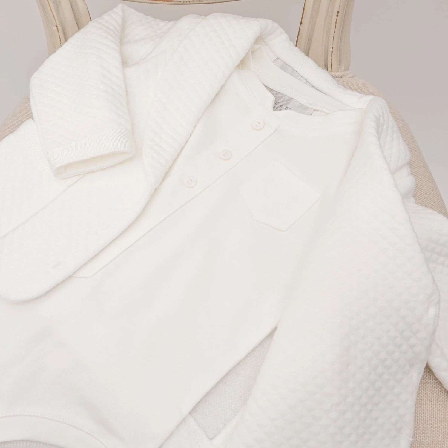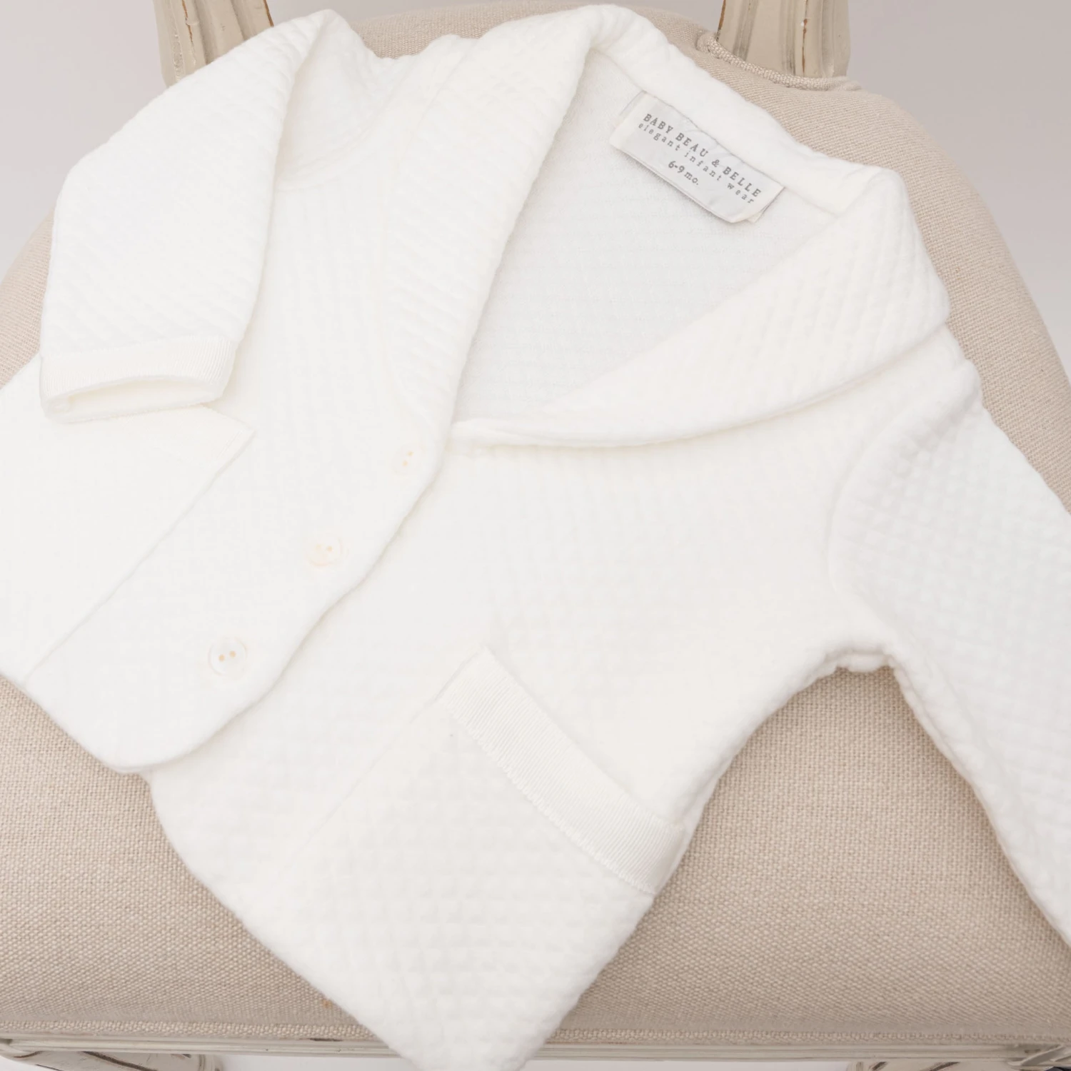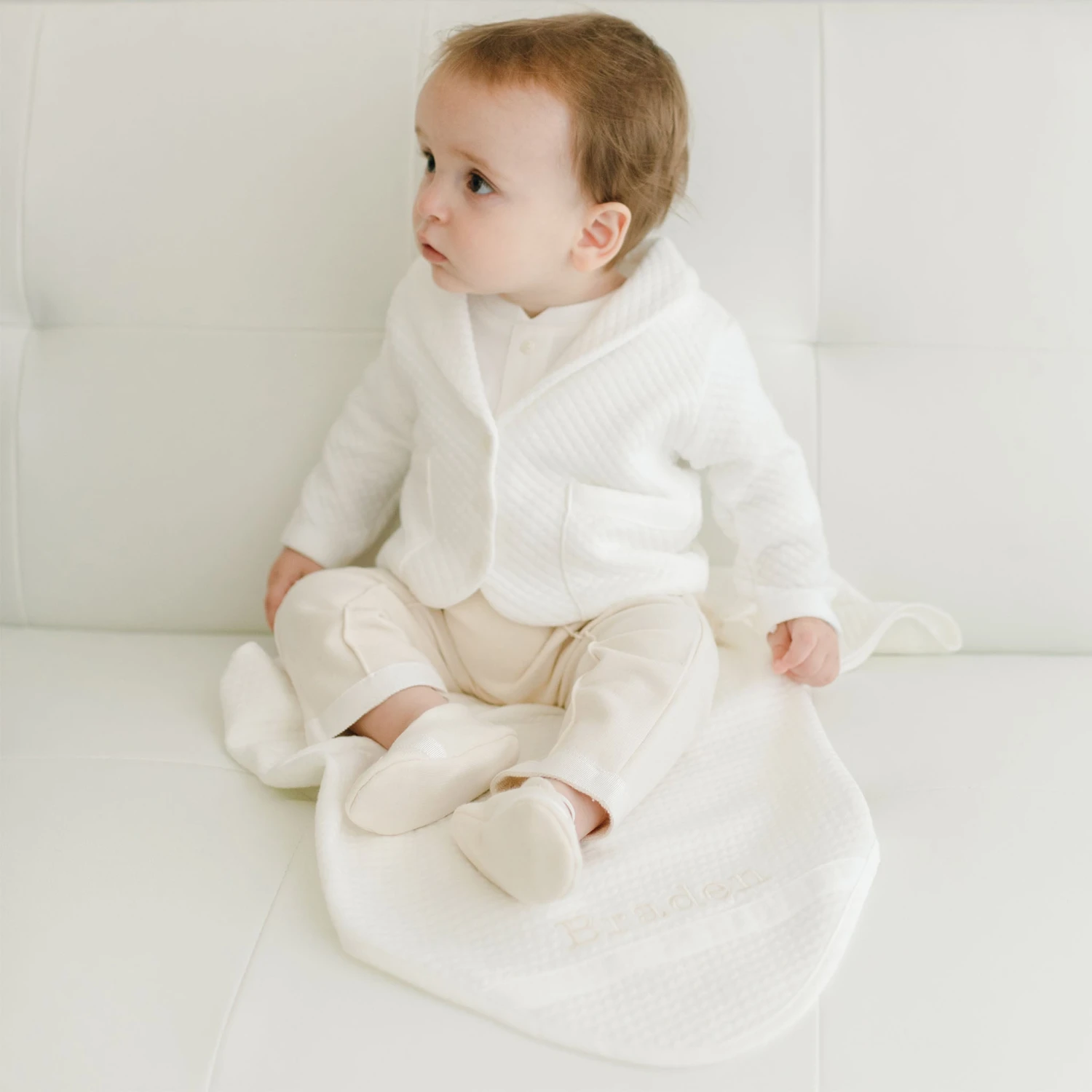 The perfect suit for your baby boy that is both stylish and comfortable. This very elegant suit for boys has been created with our plush quilted and French Terry cottons. Detailed with summarys and ivory grosgrain ribbon trim. Features a soft elastic in the waist for a comfortable fit. Double pockets on the jacket makes for a handsome look. Suit includes jacket, shirt and pants/shorts. Ideal for that very special occasion!