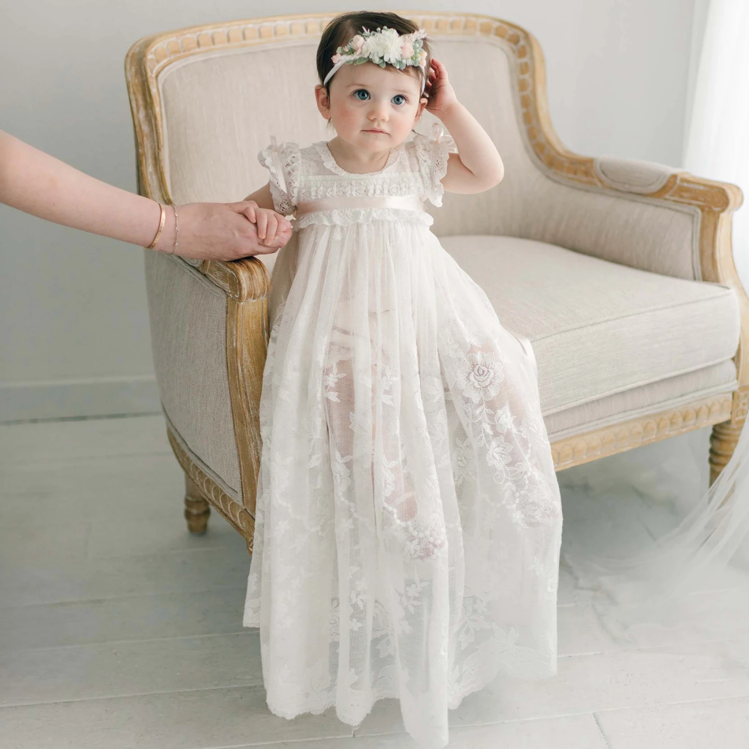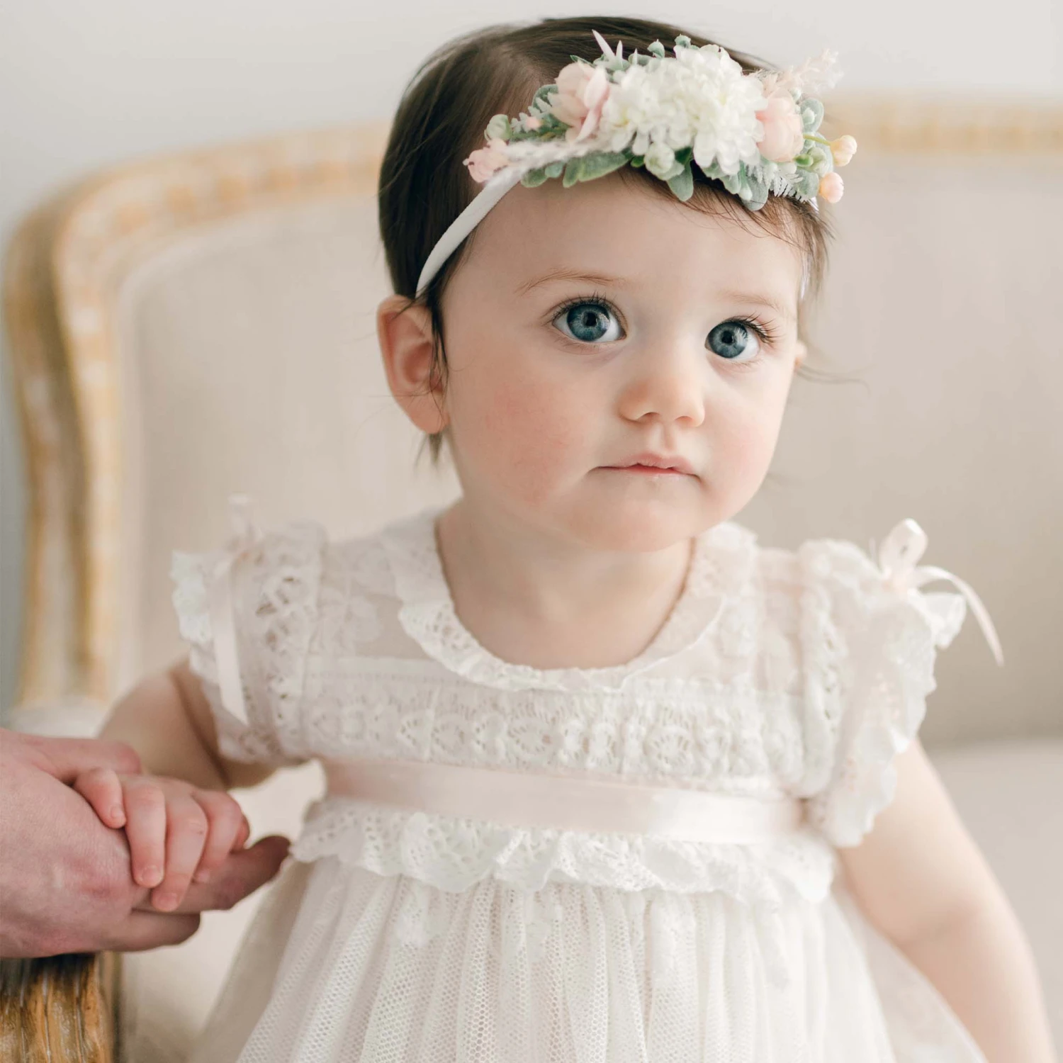 This beautiful flower headband is designed with baby’s comfort in mind. Hand-crafted in our office using a soft, stretchy nylon band, it easily fits any head. The headband is adorned with lovely white and pink flowers and greenery for a natural look that will last long after her special day. It’s a special keepsake to remember a cherished memory.