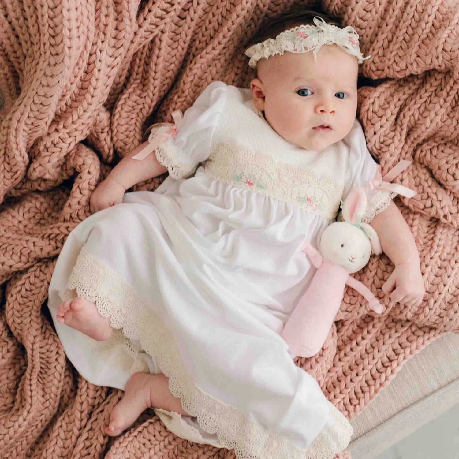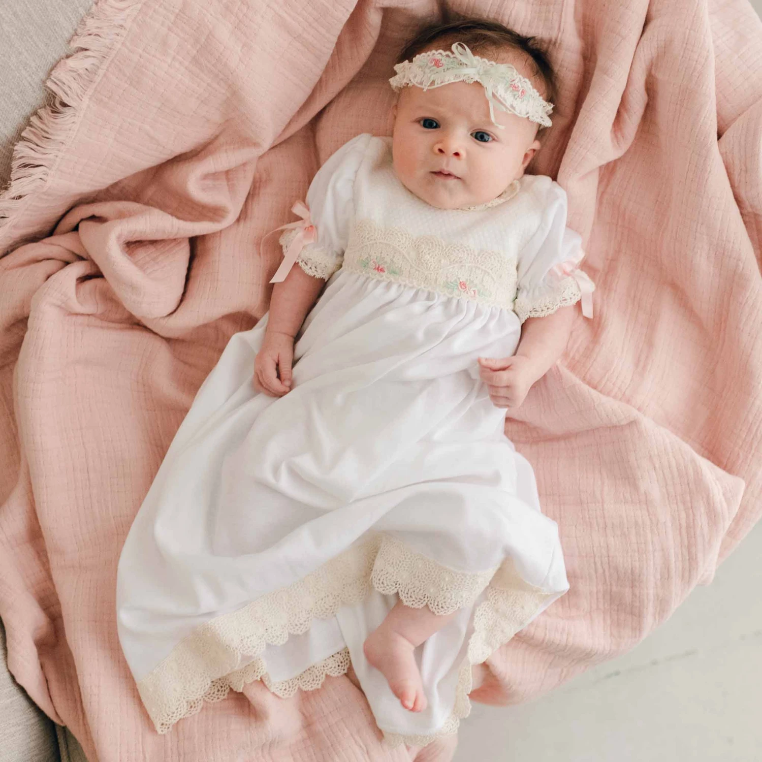 Our pima cotton layettes are incredibly soft for baby’s sensitive skin and beautifully detailed for your special occasion. Made with 100% white pima cotton and detailed with an ecru cotton lace along the bodice and bottom hem. A sweet ivory edge lace on sleeves and neck. Pink flower and green leaf embroidery and pink silk ribbon bows on the sleeves add a vintage inspired touch. Makes a great gift for new parents!