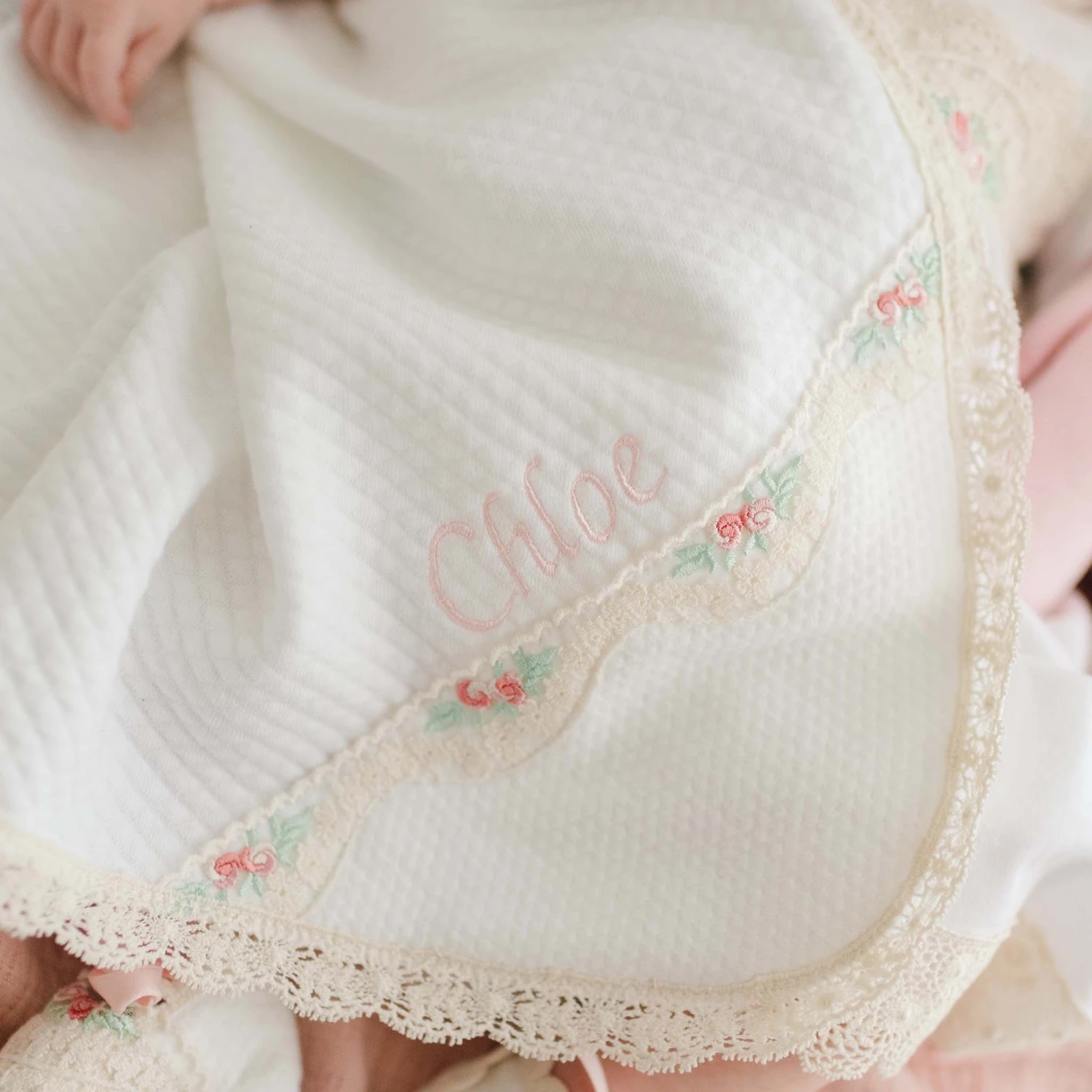 This soft, lightweight cotton blanket is the perfect addition to her Chloe layette gown or makes the sweetest gift for a newborn girl. Made with a white textured cotton and detailed with a lovely ecru edge lace. A corner of the blanket is accented with ecru lace, pink silk ribbon bow and rose and leaf embroidery. Add her first name above the lace corner in pink thread for a personal touch!