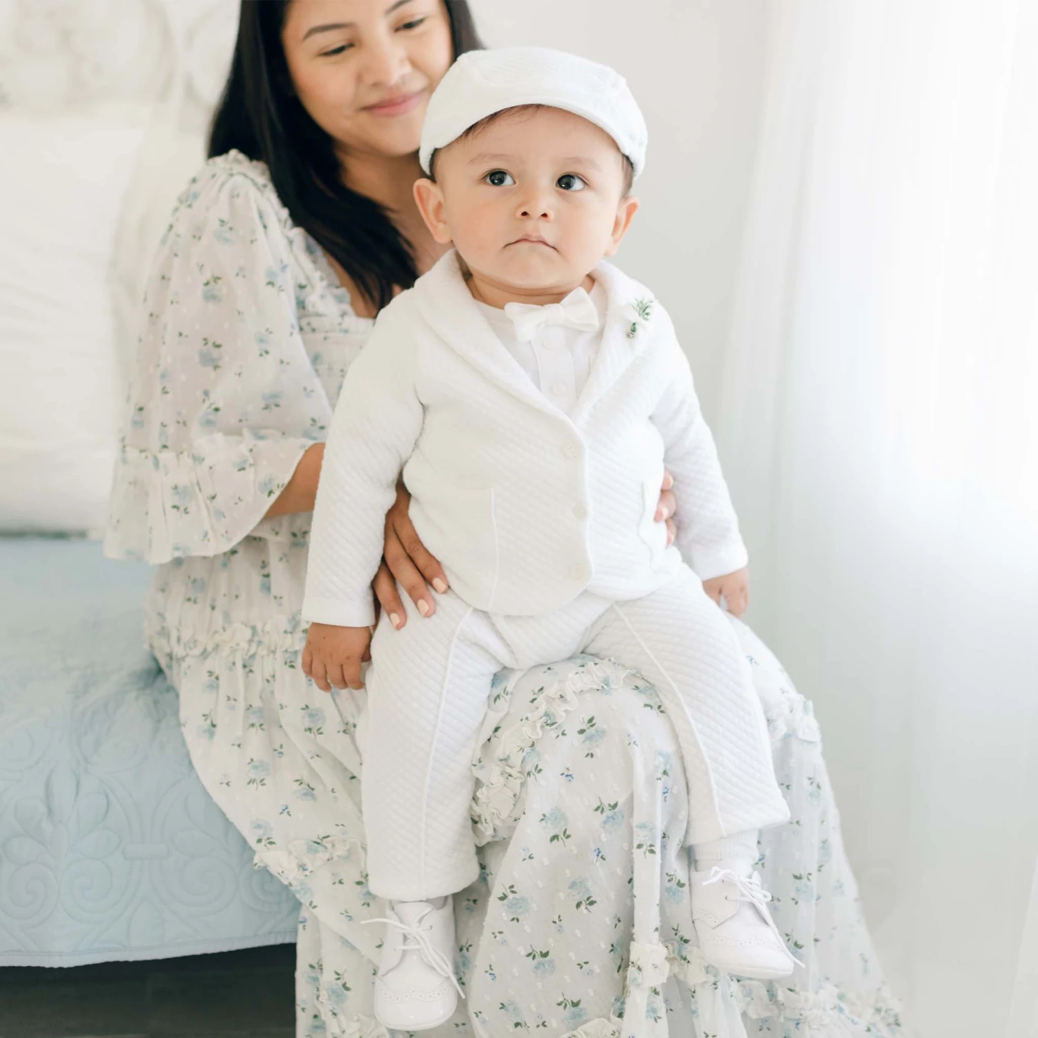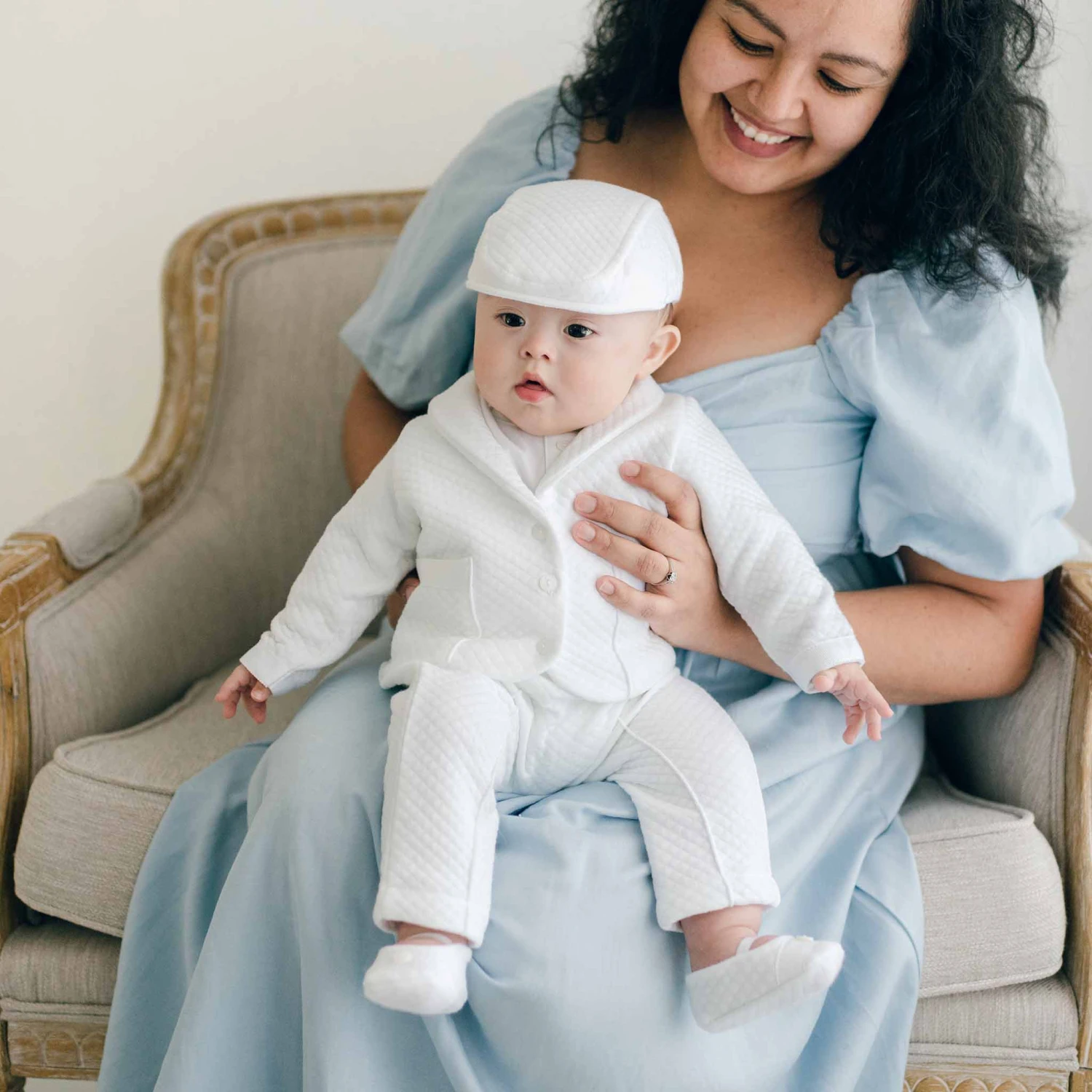 One of the most popular baby boy dress suits from Baby Beau & Belle! The all white Elijah Baby Boy 3-Piece Suit is a mix of the softest, luxurious textured cotton and an elegant design, perfect to keep your little guy cozy and warm on his special day! The fitted style pant features pleated front creases, a grosgrain ribbon and summary waist and a stylish back pocket. The adorable jacket features a fold over collar and darling front pockets. Not a detail is missed on this handsome outfit. To complete his look from head to toe, pair the matching Elijah Newsboy Cap and Elijah Booties, both made with the same white textured cotton. This is the perfect baby boy suit for everyday wear or a special occasion