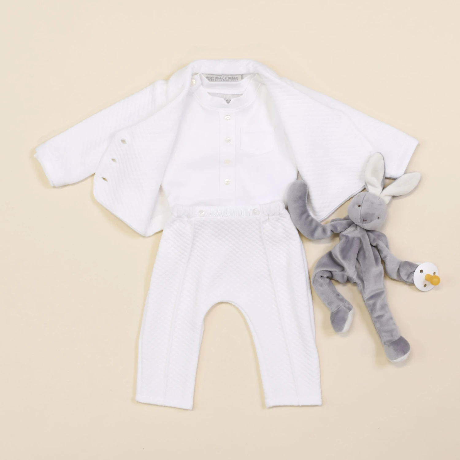A special newborn suit for your newest addition. The all white Elijah baby suit was designed to mix the softest, quality materials with elegant style. No detail is missed on this darling 3-piece coming home outfit. The jacket and pants are made with a soft white quilted cotton to keep him cozy. The fitted style pant features pleated front creases, a grosgrain ribbon and summarys at waist, and a stylish back pocket. The adorable jacket features a fold over collar, cute front pockets, summary closures, and grosgrain ribbon at cuffs and pockets that add elegance unique to our baby clothes. Pair with his newsboy baby hat and Elijah quilted booties to complete his handsome look. His outfit is sure to impress at any special occasion, whether as his take home outfit, for a newborn baptism, or for newborn pictures.