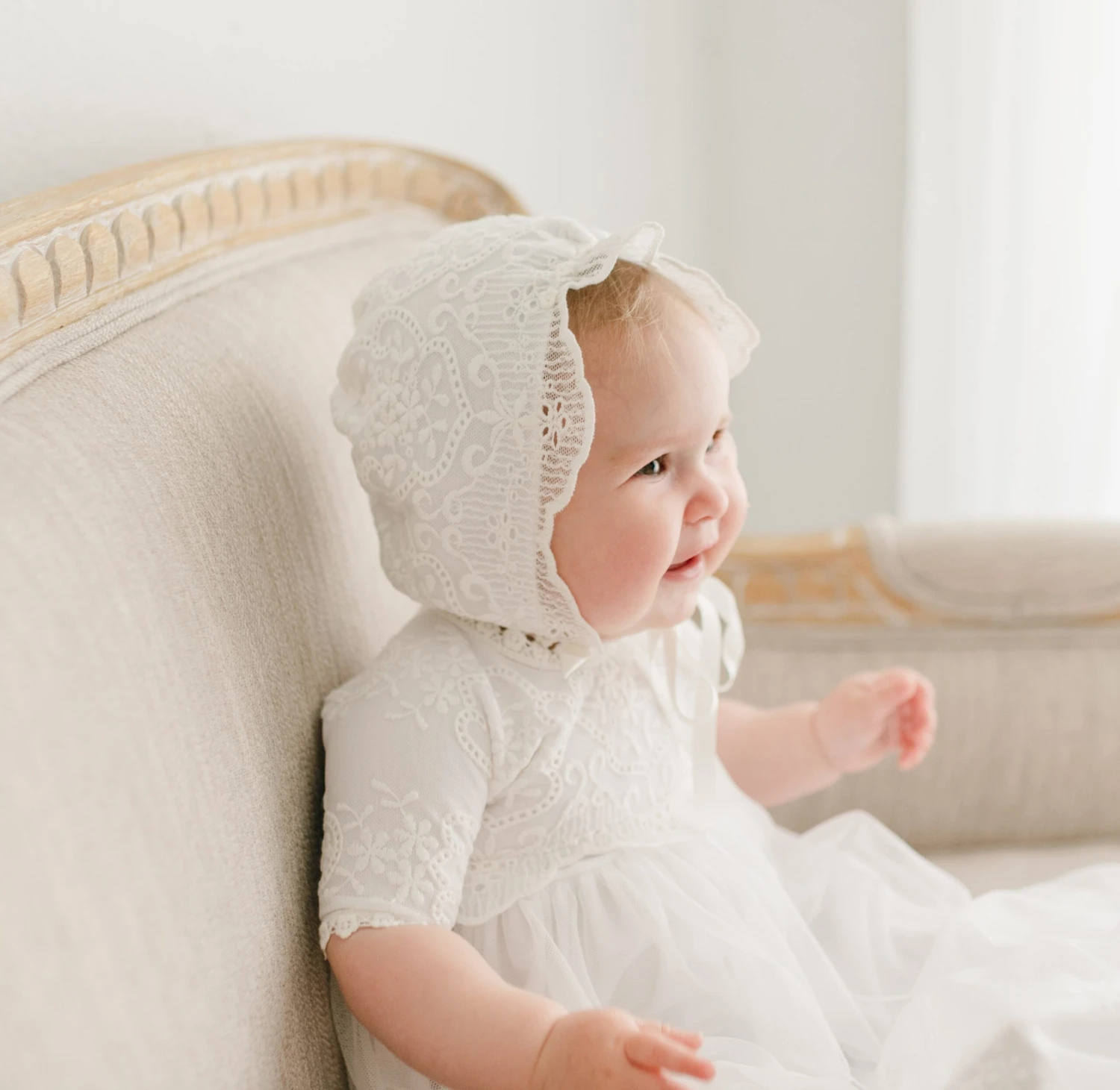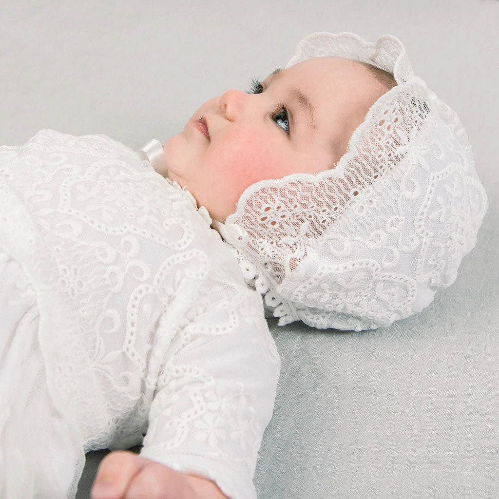 Made with the same super soft pima cotton and light ivory cotton lace as her Eliza dress, the Eliza bonnet is a lovely addition to complete her look from head to toe! Silk ribbon ties will help keep this bonnet secure.