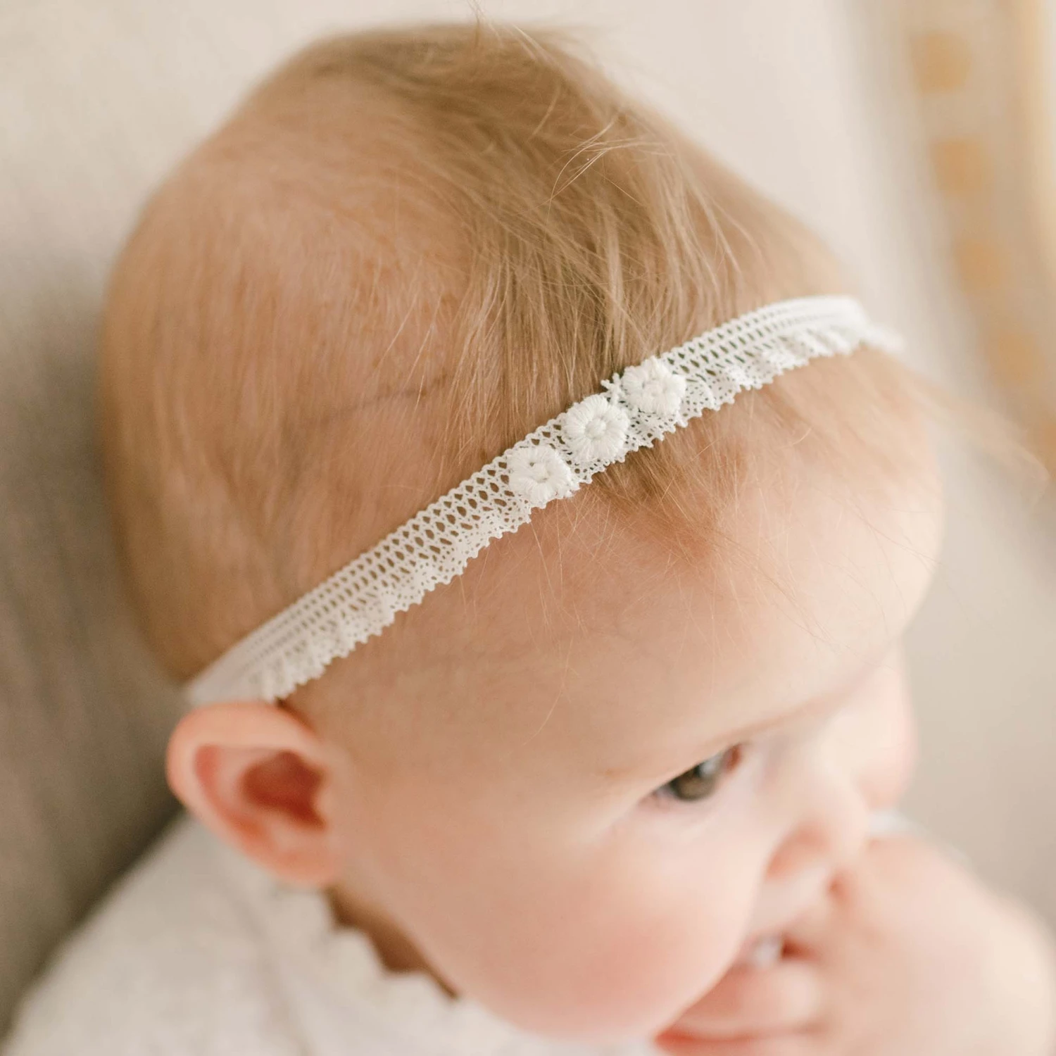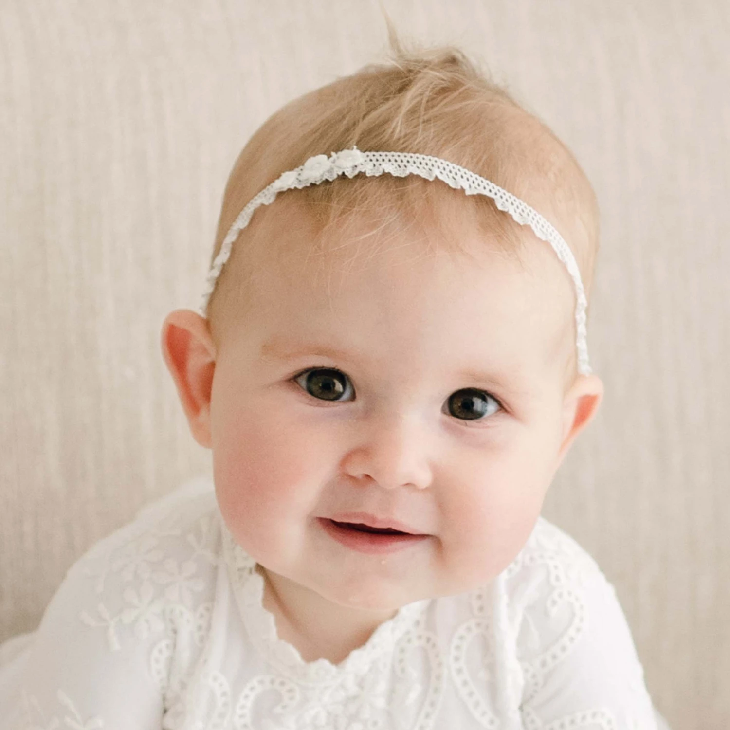 The Eliza Headband is made with a soft elastic band in light ivory. Detailed with a darling floral applique for a delicate look. Pairs beautifully with the Eliza Christening Gown & Dress.