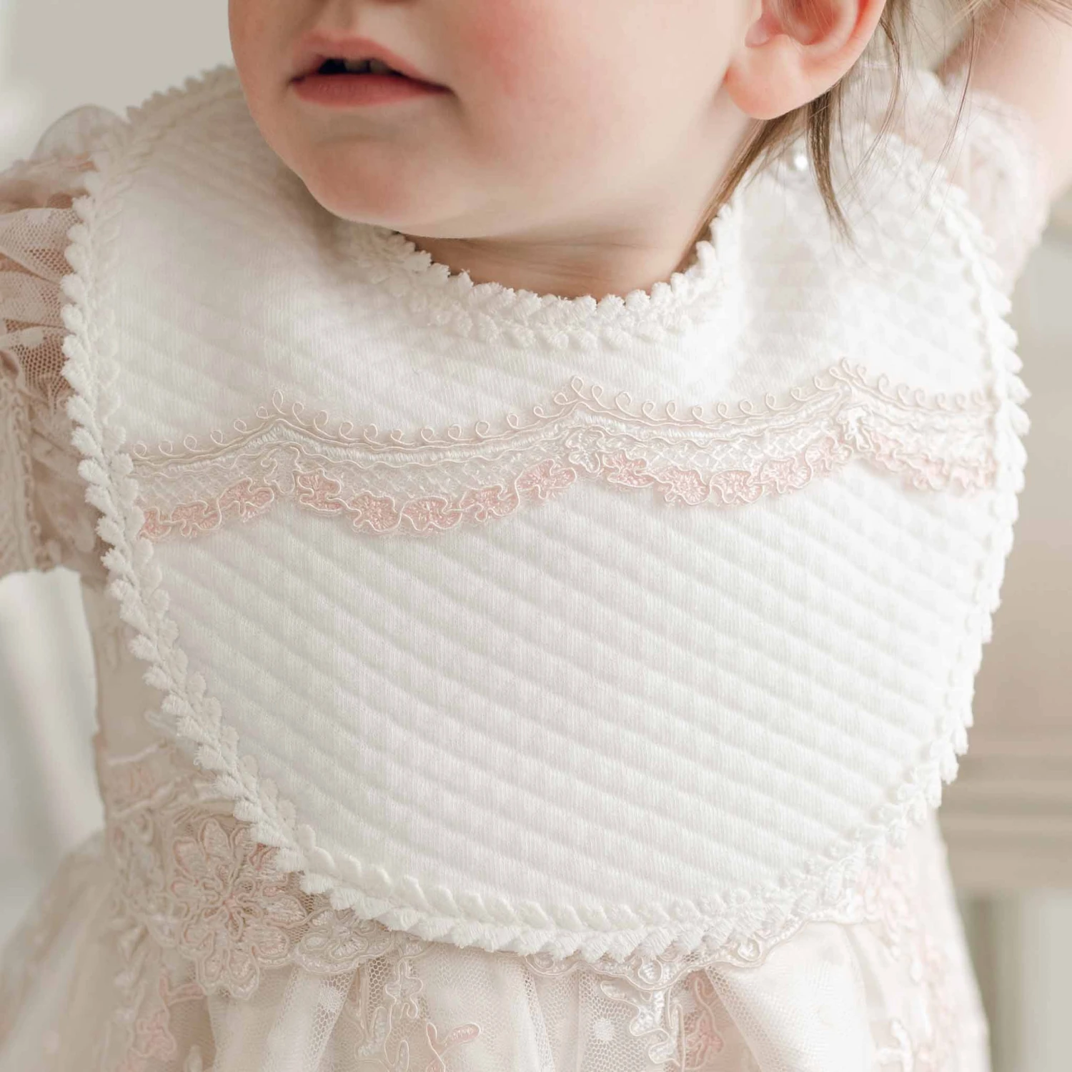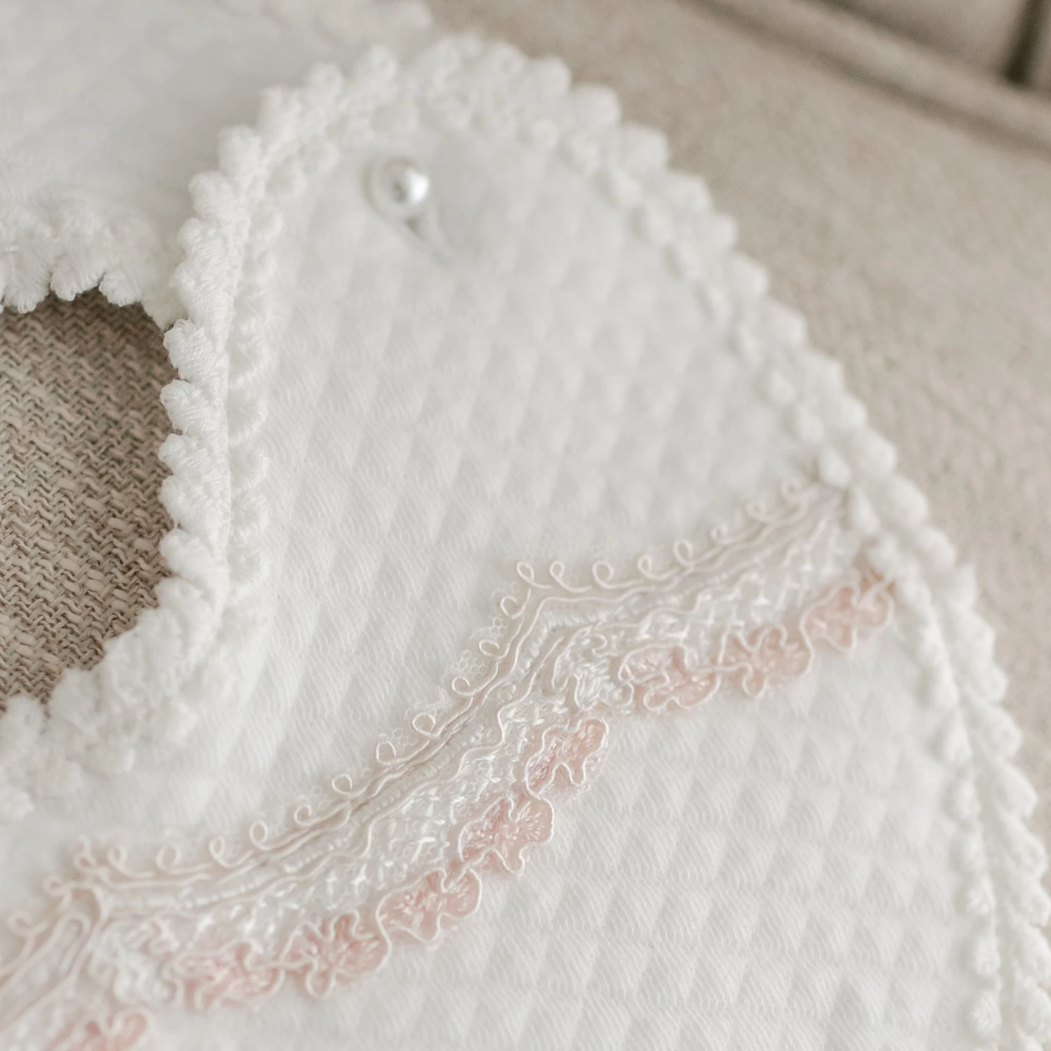 Keep her Elizabeth gown and dress safe from messes with this pretty baby bib! Made with a soft quilted cotton, accented with an elegant floral edge lace that keeps with her classic style. A pearl style summary closure finishes the timeless look. It’s simple but classic design adds vintage touch to any baptism outfit or special occasion dress.