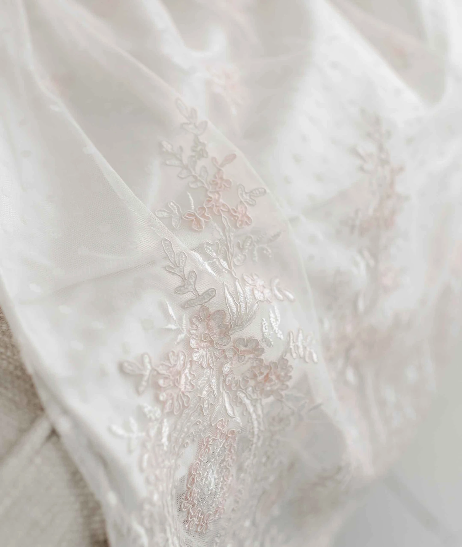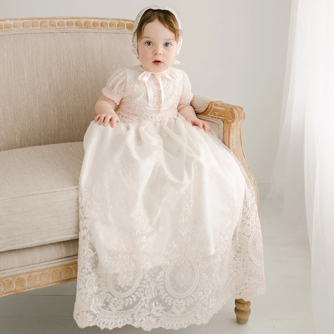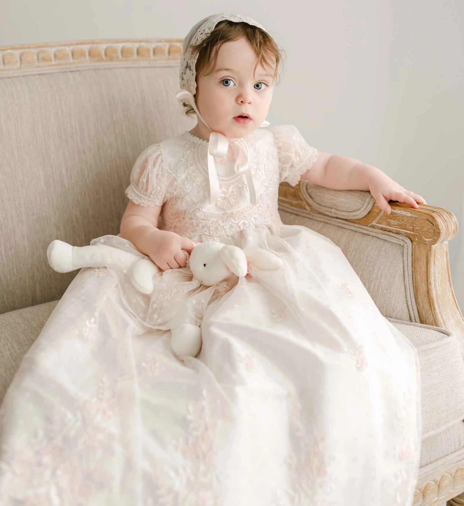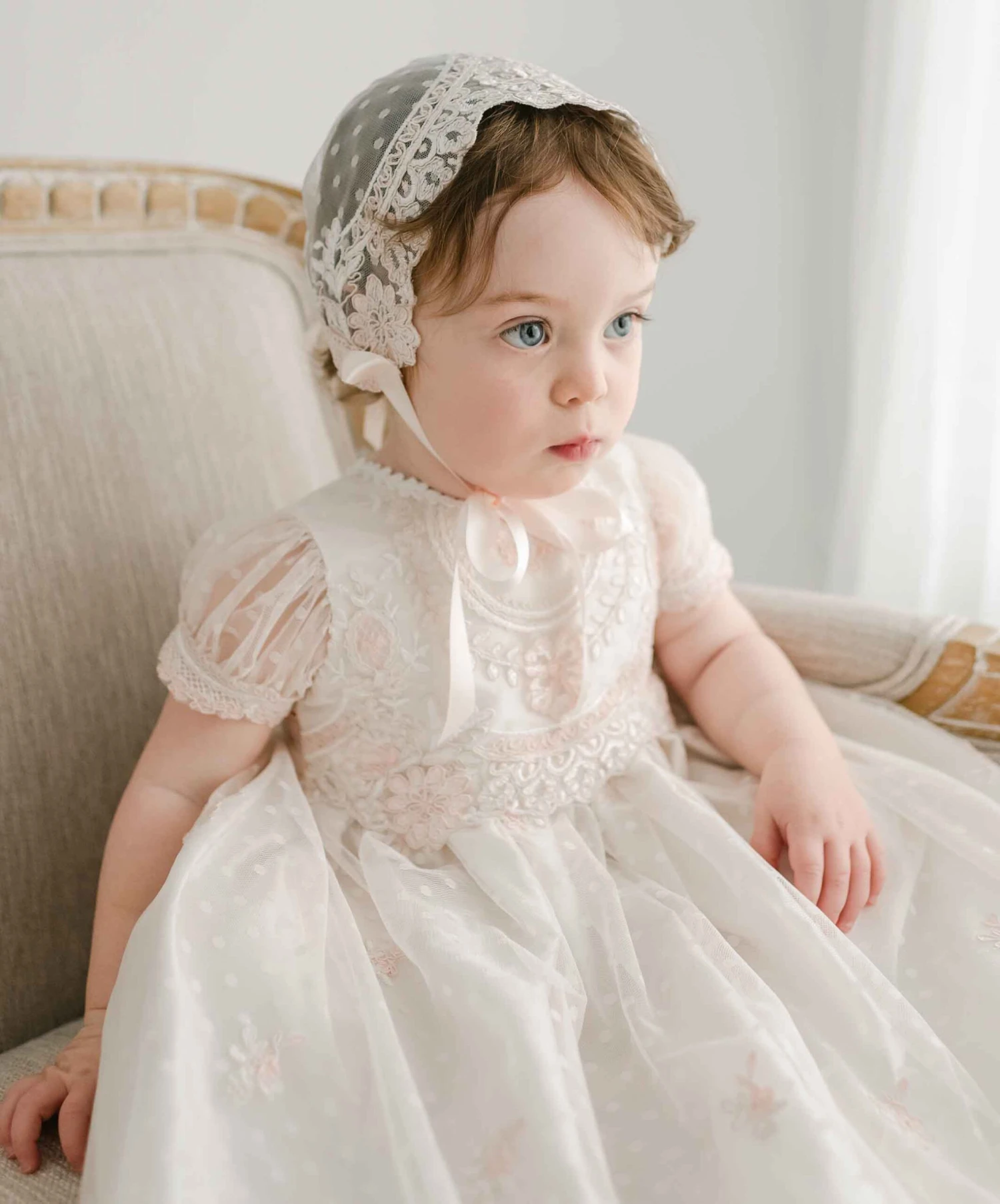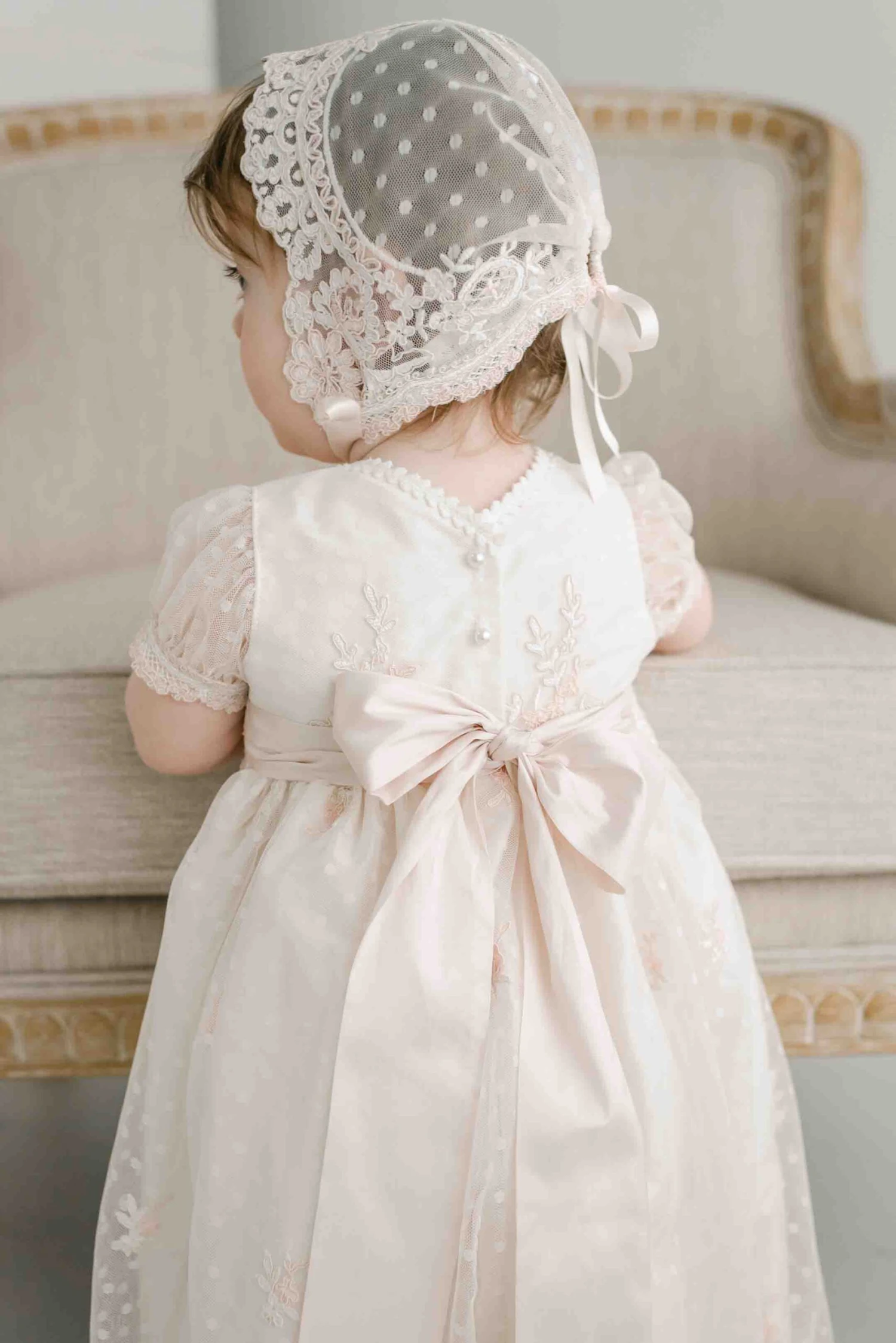 A Baptism gown that is a true work of art. Our Elizabeth gown is handcrafted and beautifully detailed for your baby girl. The intricately detailed pink and ivory dotted mesh embroidered lace with cording is as elegant as it is comfortable, and its details are enhanced by the beautiful silk underneath. The rich silk Dupioni lining is ivory for a look that will have your guests thinking it is a family heirloom gown. Our vintage pink champagne Dupioni silk sash ties allow you create a perfect fit, while adding a touch of color to bring out the lace details. The traditional length skirt falls well past her toes, and the gorgeous scalloped lace at the hem adds a timeless beauty. A matching corded pink and ivory edge lace add depth and richness, while the pearl style summarys at the bodice finish the piece and allow a wonderful fit. Includes her matching sheer lace bonnet with silk ribbon ties that frames her little face perfectly on her Christening or Baptism day. This is a Baptism gown that will be passed down and appreciated for generations to come.