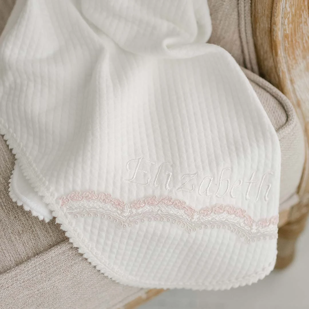 Our Elizabeth Blanket is a sweet finishing touch to her christening outfit. Crafted with our plush quilted cotton that she will love to snuggle up with. Trimmed in ivory leaf Venice lace all the way around the edge of the blanket for elegant detail unique to our baby clothes. Accent corner with ivory and pink corded lace so it matches her Elizabeth Christening Gown and Dress perfectly. With the option to add her embroidered name to the corner above the lace, this will be a must-have addition to her christening attire that she will cherish for years. Pair with the Elizabeth bib and booties for an adorable set perfect for a baby shower gift.