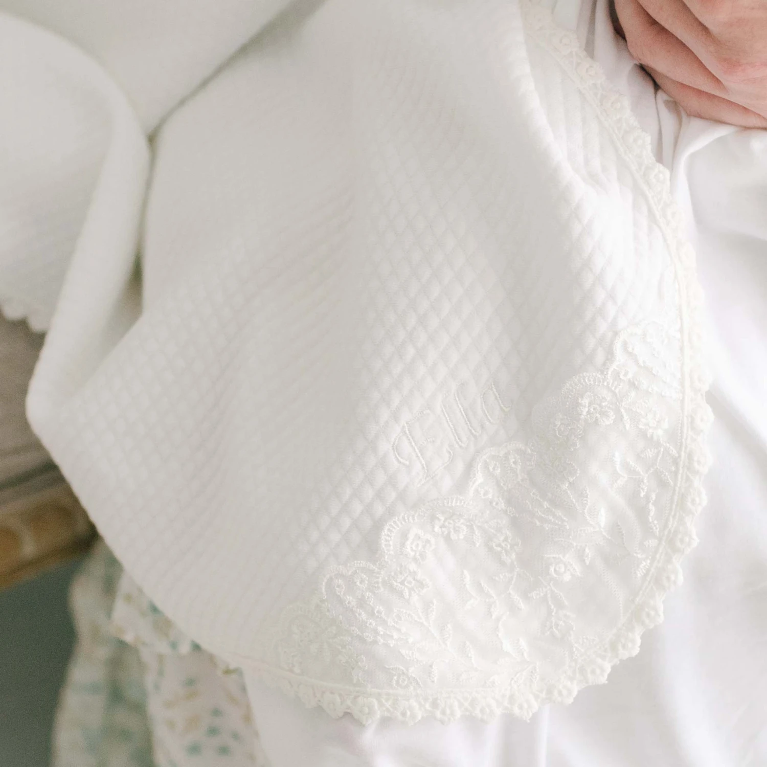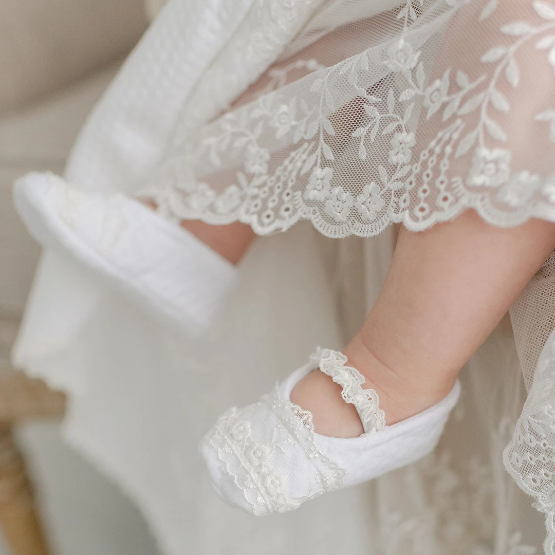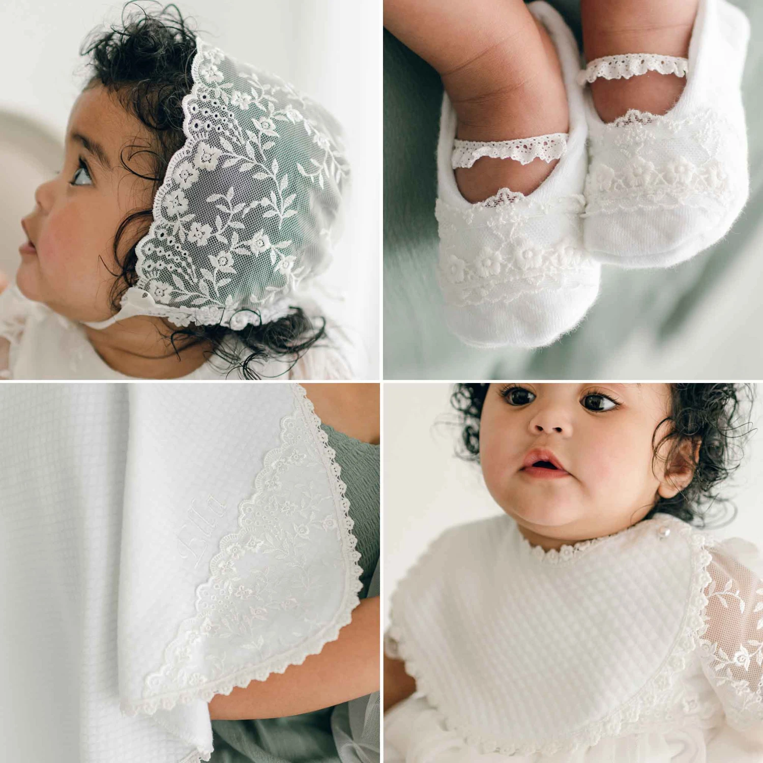 Everything needed to complete your baby girls Ella set are available here in this convenient package, and at a discounted price. This baby dress accessory set includes her soft cotton baby shoes so her designer blessing gown is perfectly styled from head to toe. Her matching lace bonnet is also a part of this set, complete with silk ribbon ties for a comfortable fit. It also includes her personalized quilted blanket with her name embroidered in ivory thread on the corner for a gift she will cherish for years. The booties, bib, bonnet and blanket all have light ivory lace detailing, to perfectly compliment her Ella romper dress and gown! This set is timeless enough that it makes a perfect baby shower gift to pair with any special occasion baby dress such as her first birthday dress, blessing dress, or flower girl dress. Save 15% over purchasing these pieces separately.