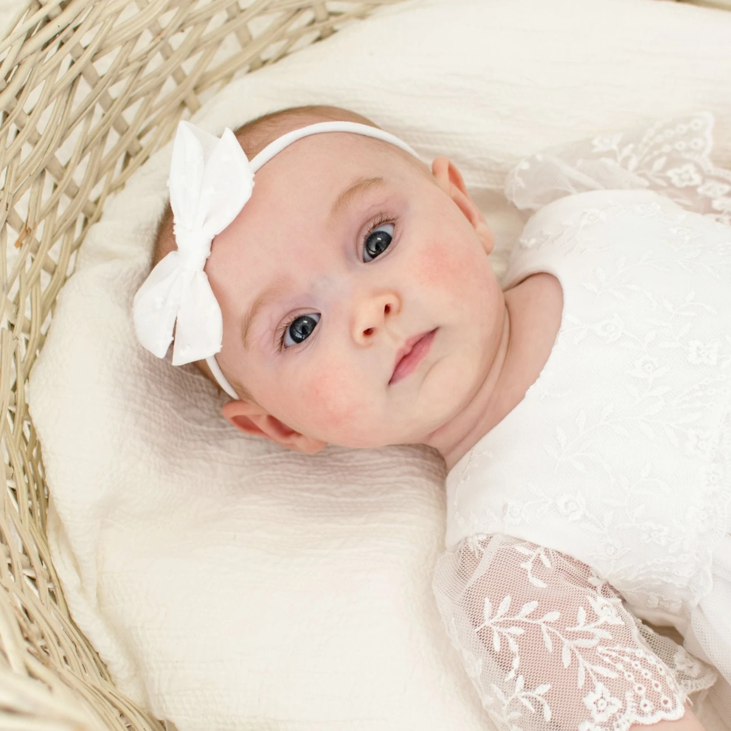 Sure to be her new favorite headband! The Ella bow headband is made with a white Dotted Swiss cotton bow, made in a classic tails style on white hand-stretched nylon band so it will be sure to fit her as she grows! A darling pairing to put the perfect finishing touch on her Ella outfit!