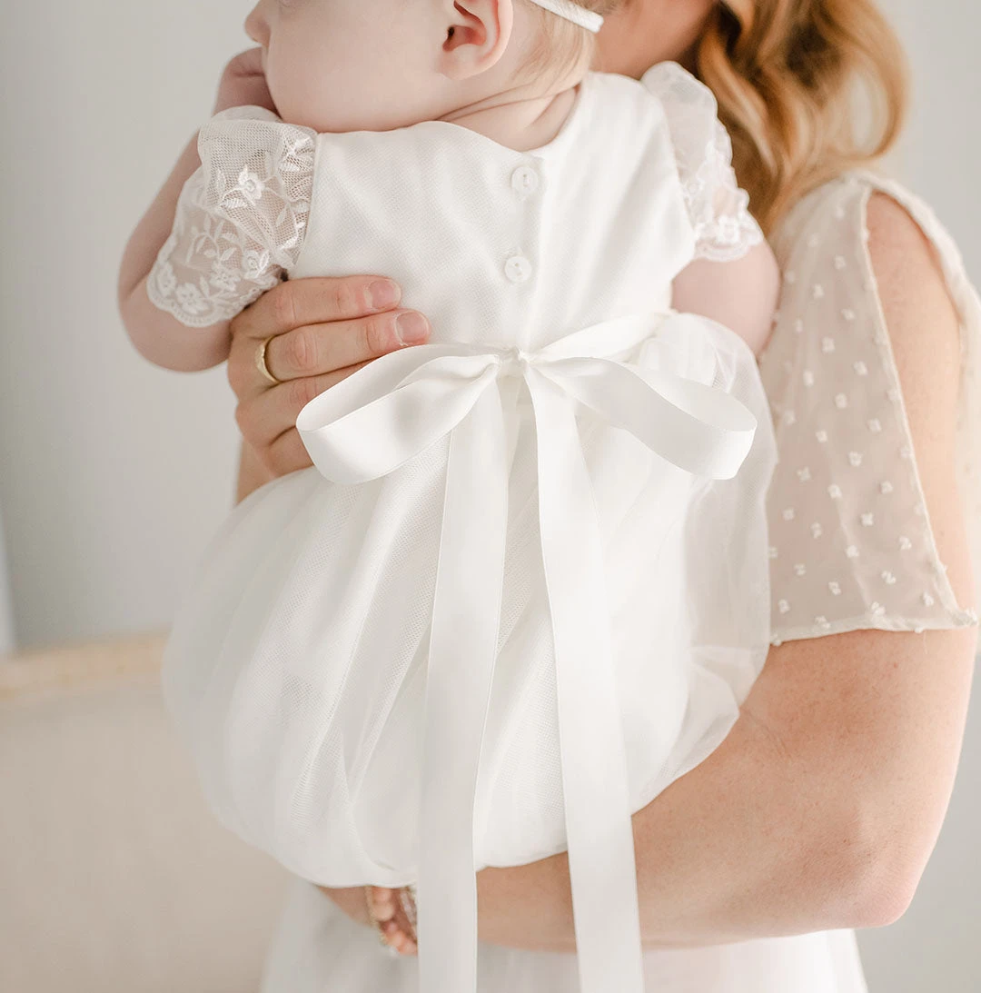 Secured on the back with summarys and a silk ribbon sash for an easy fit. Pair with her matching Ella lace bonnet or flower headband to complete this classic look!