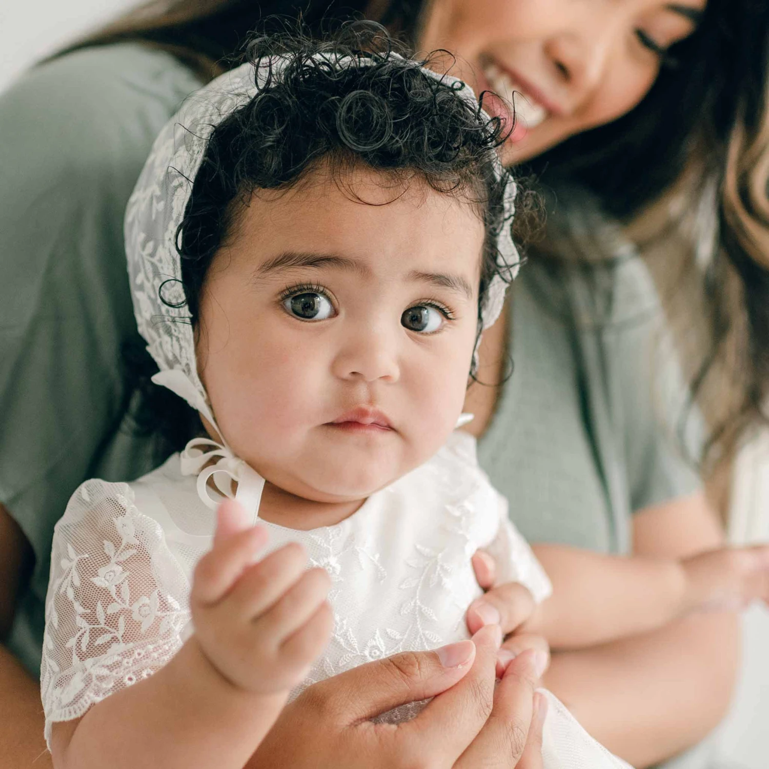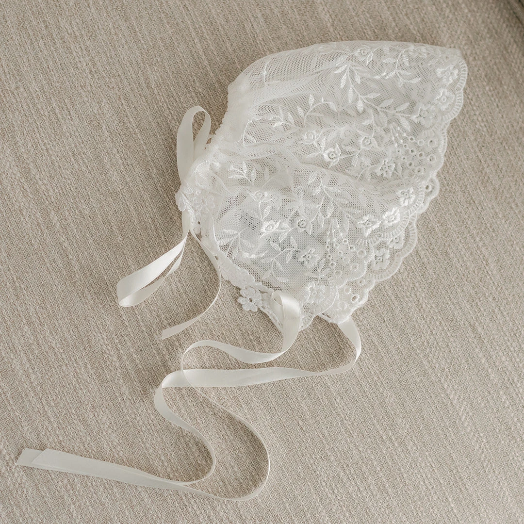This sheer lace bonnet is the perfect accent for any special event or day! Made with the same floral netting lace as the Ella romper dress, using the scalloped edge of the lace to make a lovely frame for baby’s face! Silk ribbon ties can be used to secure the bonnet on baby, and a tie on the back can be used to adjust the fit, to make it just right for her!