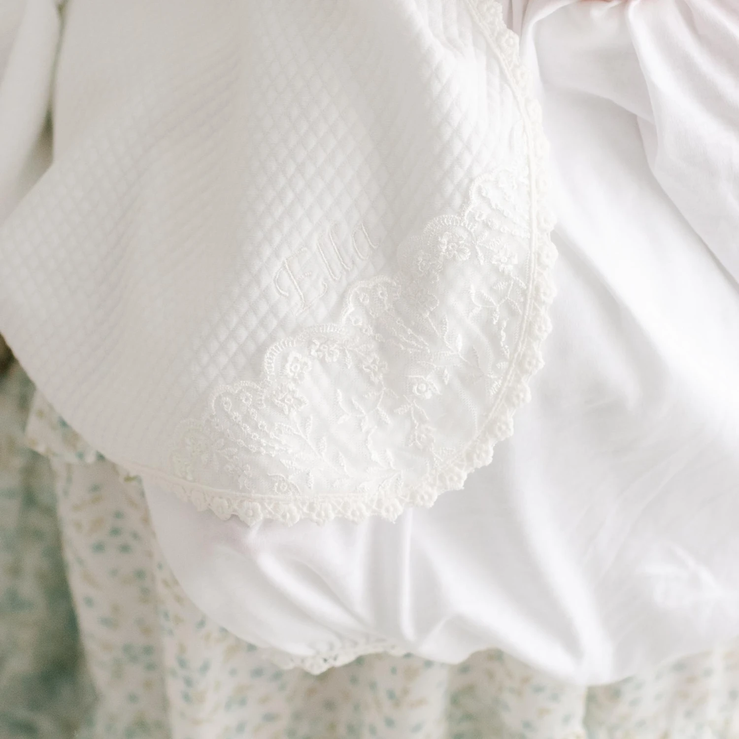 A set perfect for your little girl’s take me home outfit, a beautiful baby shower gift or a sweet dedication gown to keep her styled from head to toe! The set features our Ella Layette Gown – made with 100% white pima and quilted cottons and detailed with our light ivory Ella lace. A sweet ivory edge lace on sleeves, neck and hem of gown. Set also includes her matching Ella booties and petite flower headband, along with a bunny chime rattle and matching blanket. Add her first name above the lace corner in ivory thread for a personal touch!