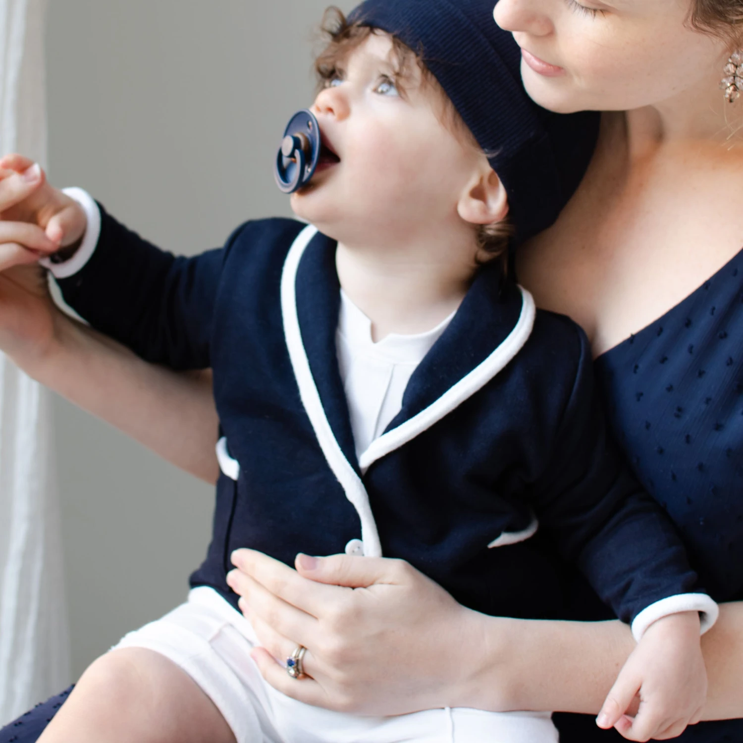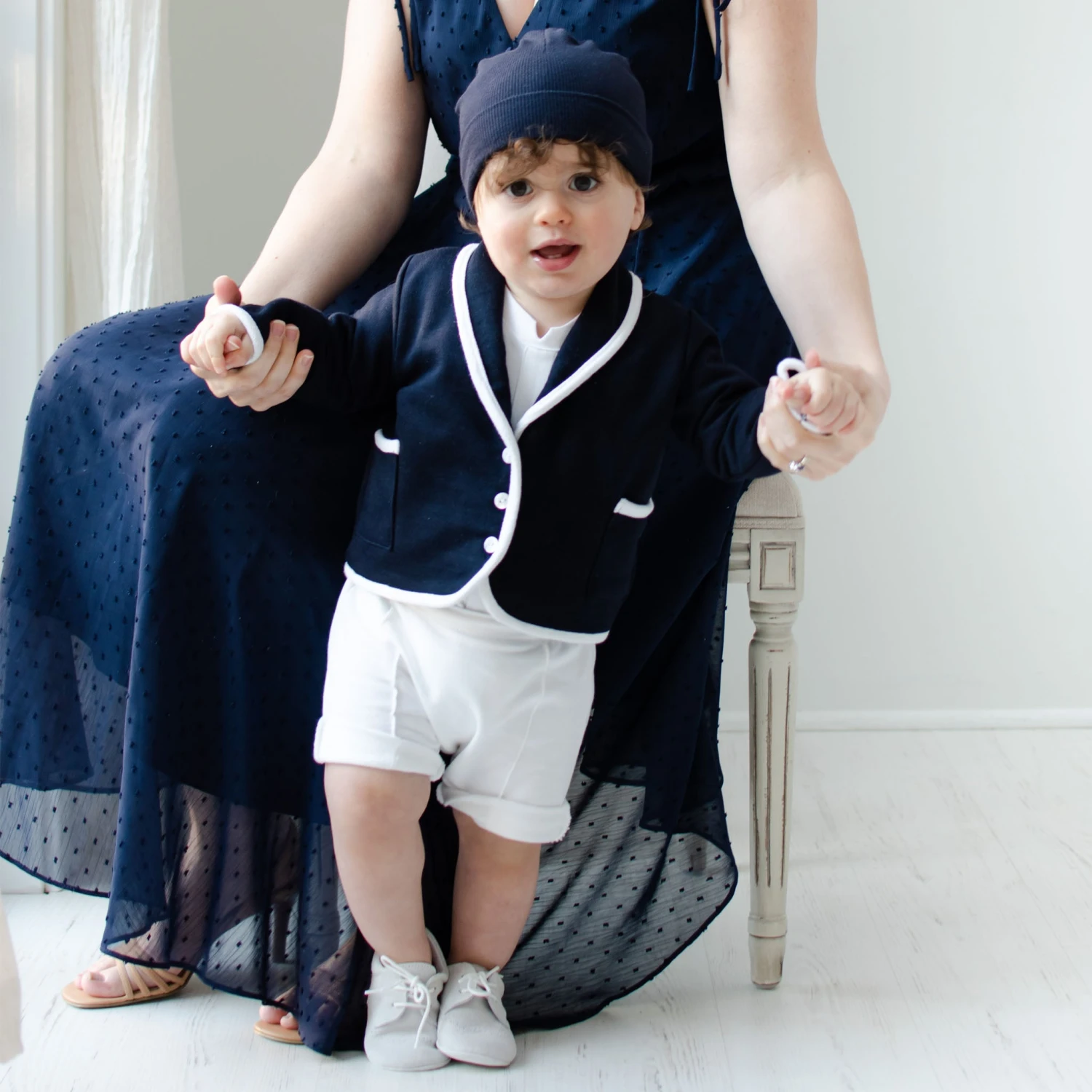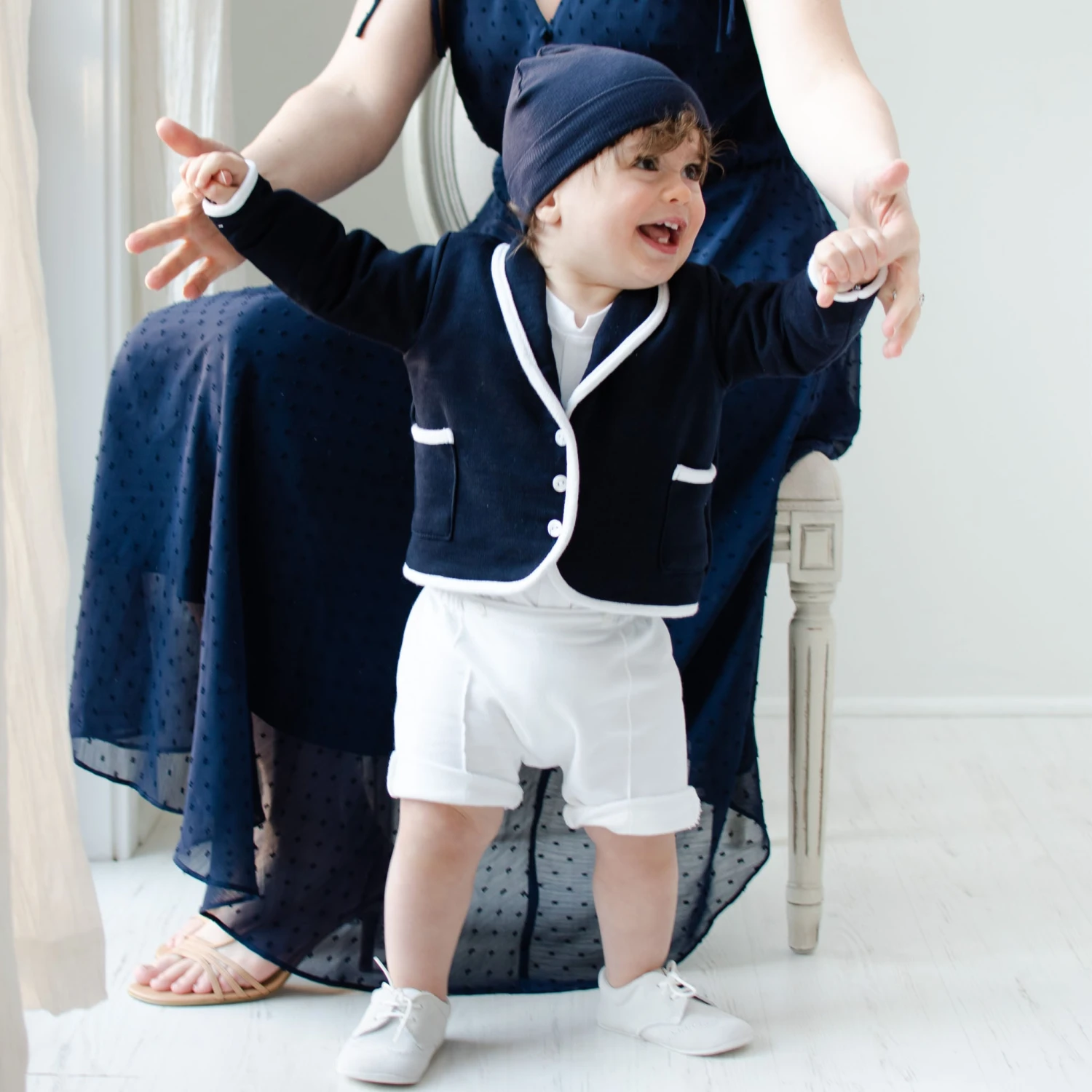 A classic baby boy 3-piece shorts suit that will stand the test of time! Made in our soft navy blue French terry cotton with summary closure, the jacket is trimmed in white French terry cotton and completed with a little pocket to store treasures! This baby boy suit is perfect for warmer months or a special occasion held indoors. The matching white French terry shorts with a pleat down each leg and a cuffed hem will guarantee that your little man will be the most dapper in the room! A cotton/rayon blend bodysuit is the perfect base layer, super soft to keep baby ultra comfortable, with snaps for easy changes. The 2-3T sizes includes a soft shirt. Complete his outfit with the matching Elliott newsboy cap and a pair with knee socks for a sweet look!