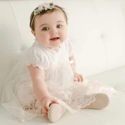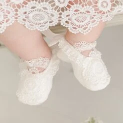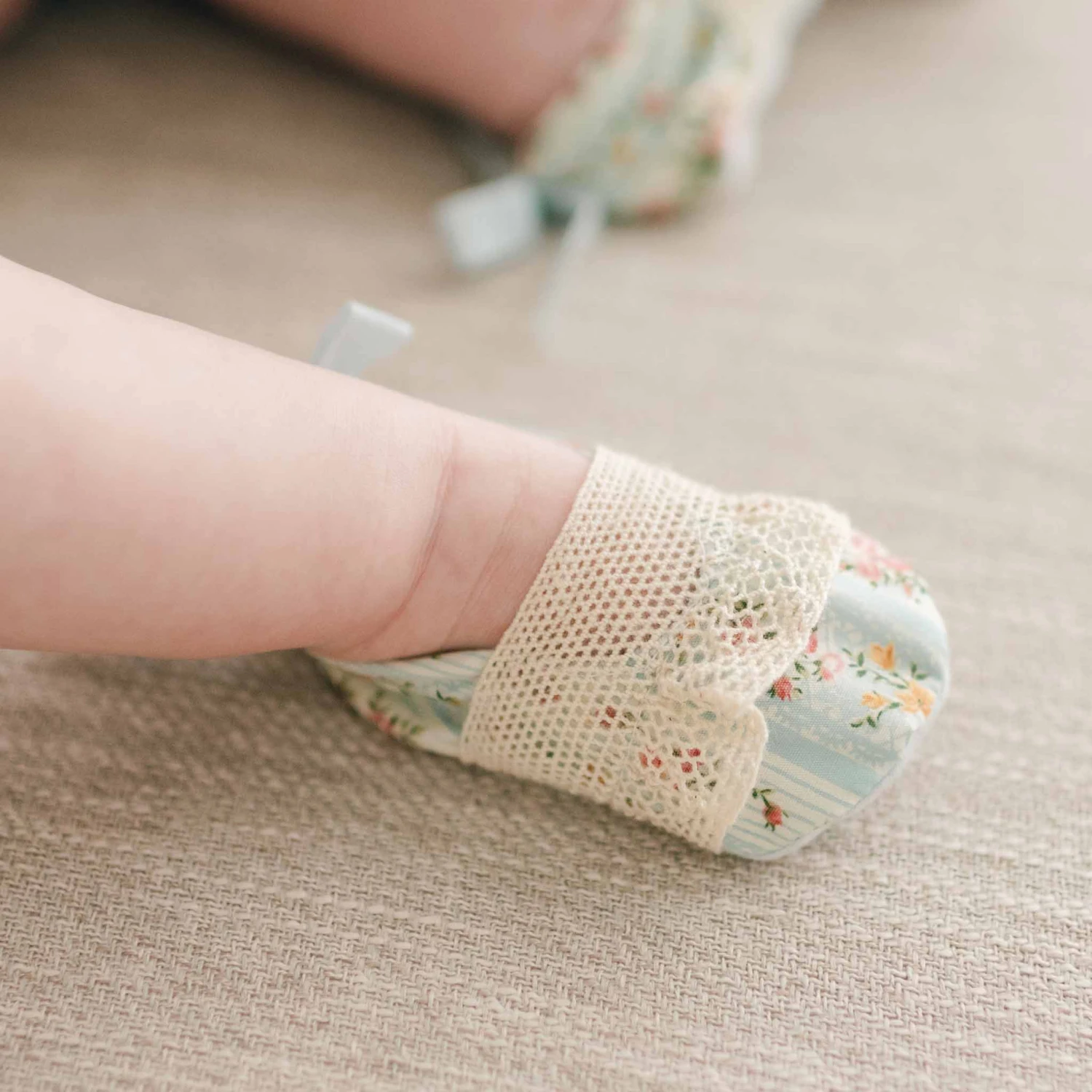 Sweet booties made with the matching Eloise floral striped material with natural color lace across the toe and a coordinating cotton ribbon bow on the heel. Lined in our soft pima cotton for a comfortable fit.