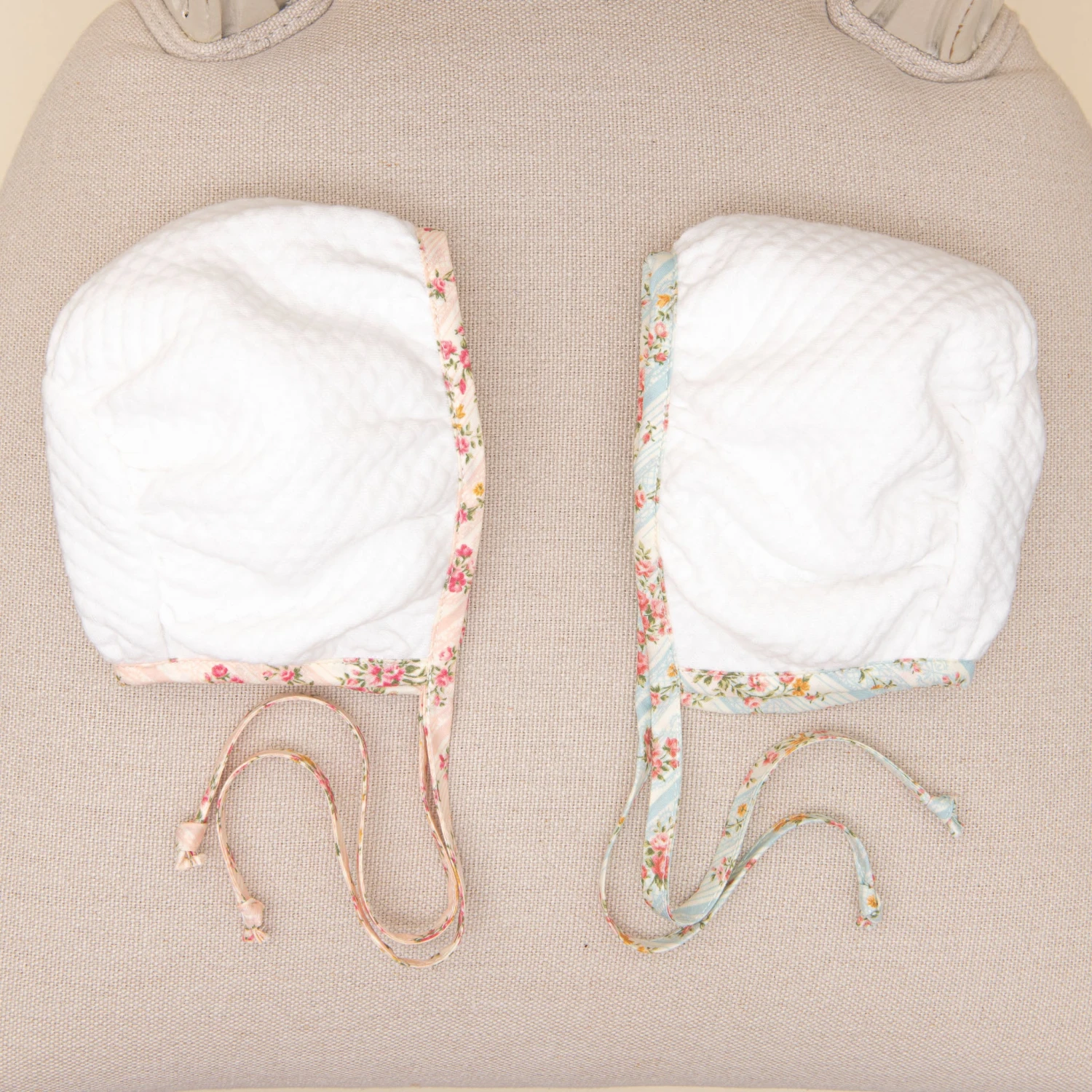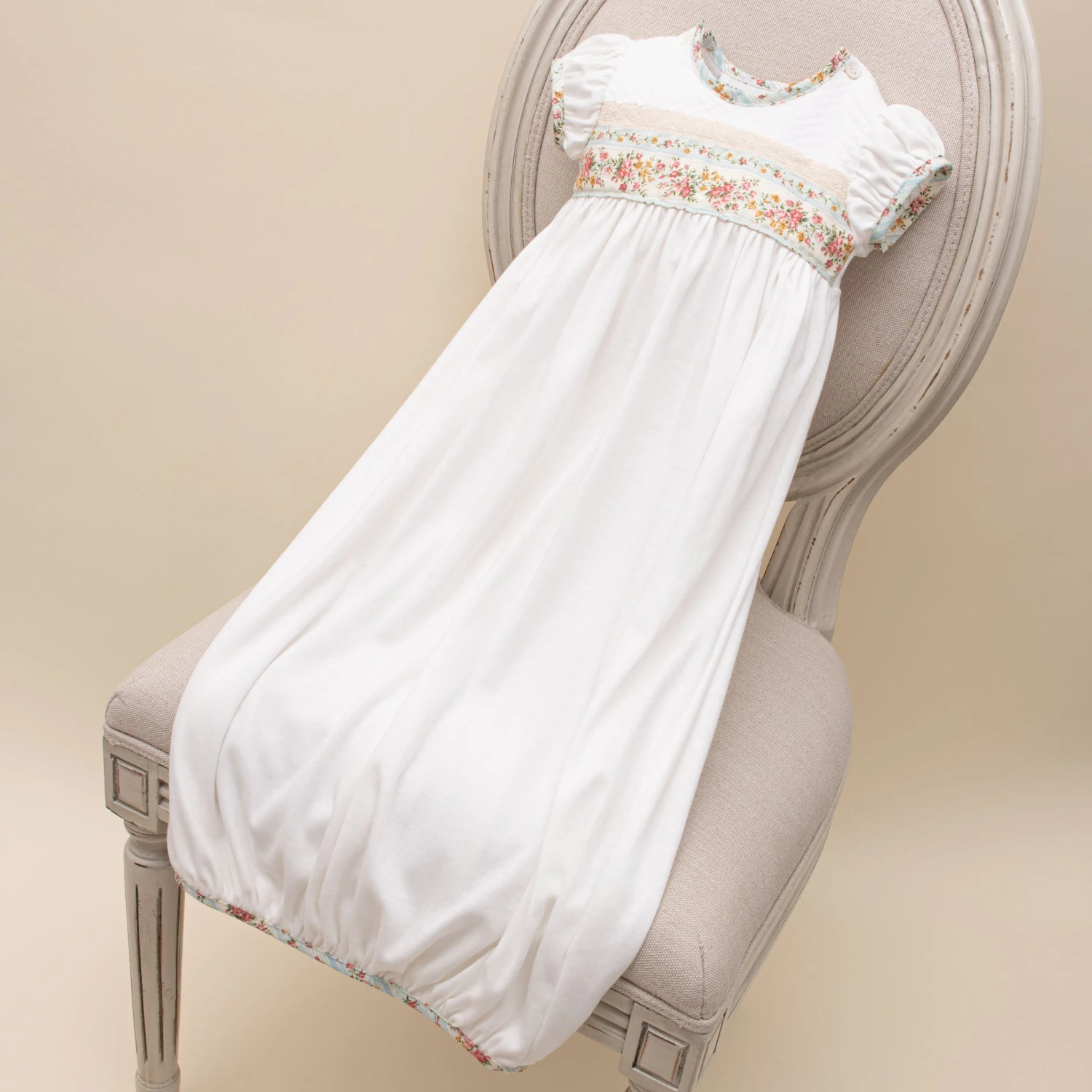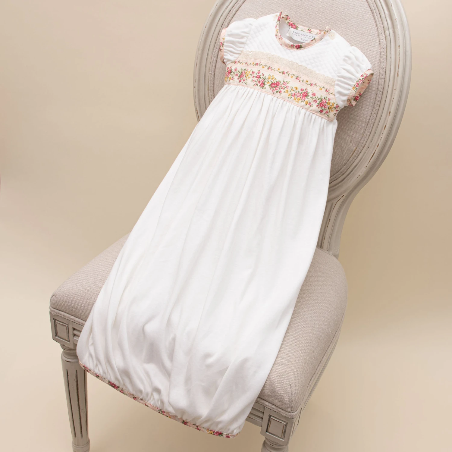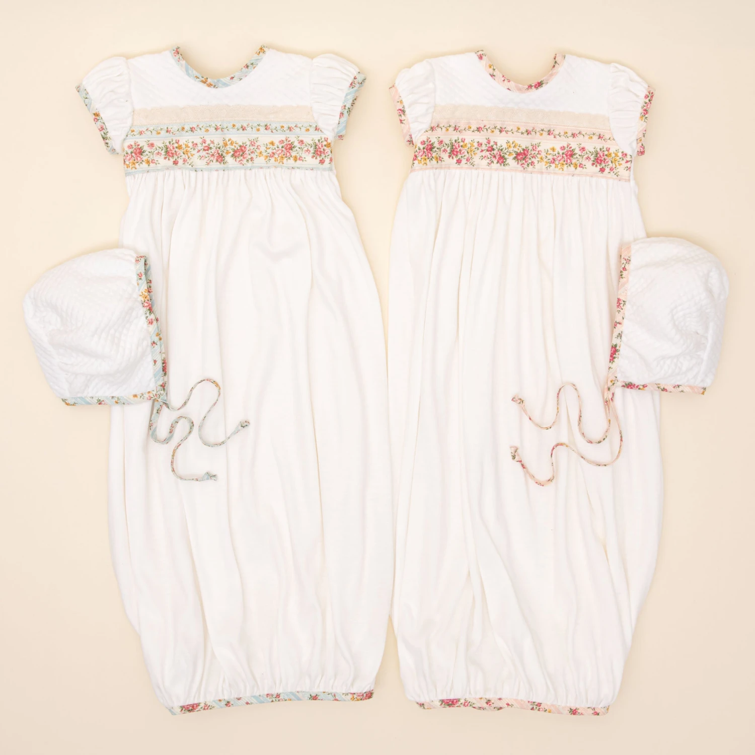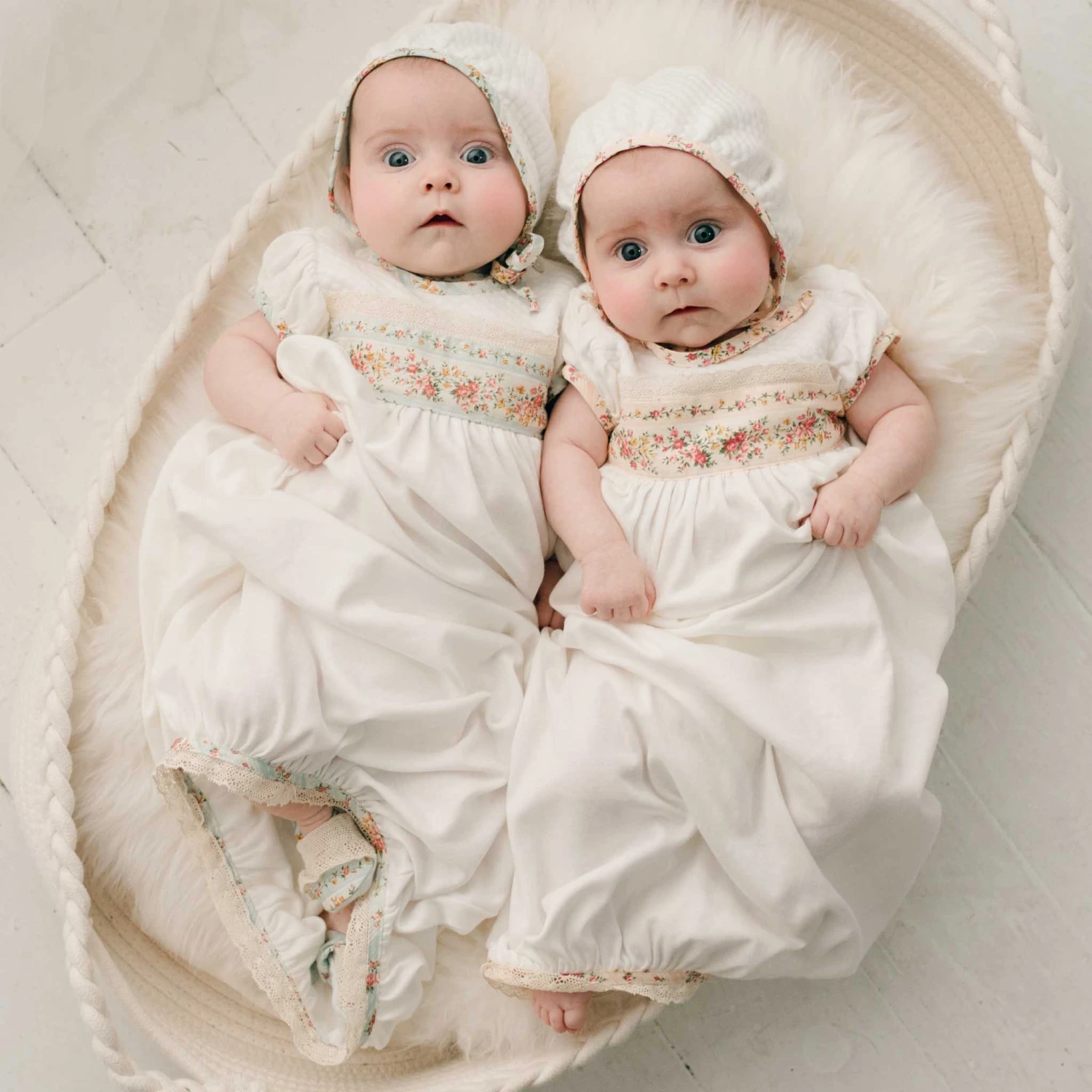 When looking for a newborn coming home gown, comfort and style are essential. This newborn gown is made with soft pima cotton in white, and features a plush white quilt bodice that was selected with baby’s comfort in mind. A sweet floral and stripe cotton trim in powder blue or blush adds the perfect delicate touch. This classic baby gown is as stylish as it is functional-the open skirt design keeps baby covered while also allowing easy diaper changes. Gift set includes the Eloise layette gown, matching fitted cotton bonnet, booties, bunny chime rattle and Eloise blanket with optional name embroidery! All pieces will come expertly pressed and packaged in a lovely tissue lined gift box.