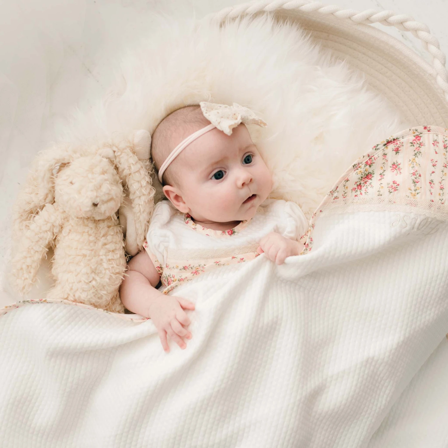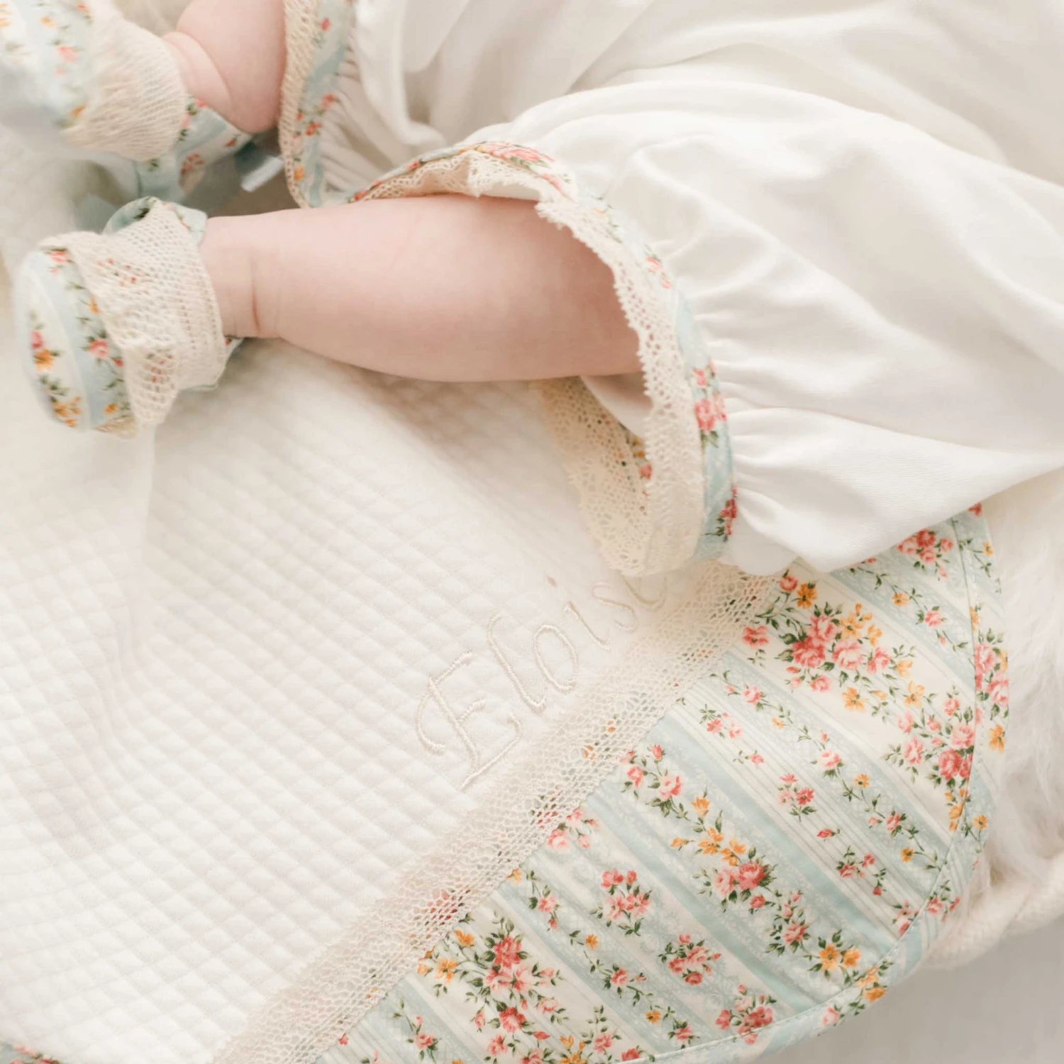 A beautiful blanket for your little one! Crafted with our soft and plush quilted cotton. One corner of the blanket features the beautiful Eloise cotton in your choice of blush or powder blue. Have baby’s name embroidered on the corner to create a special keepsake!