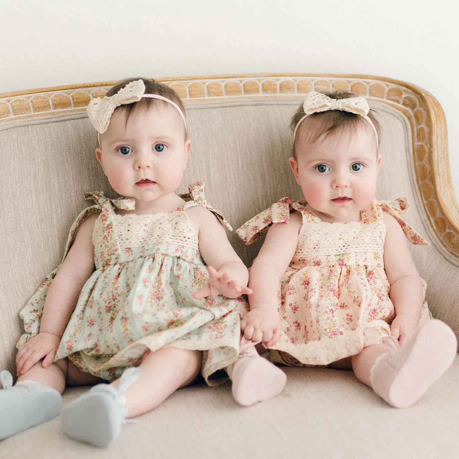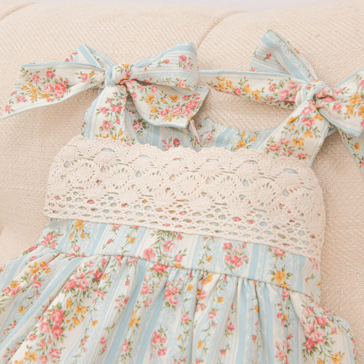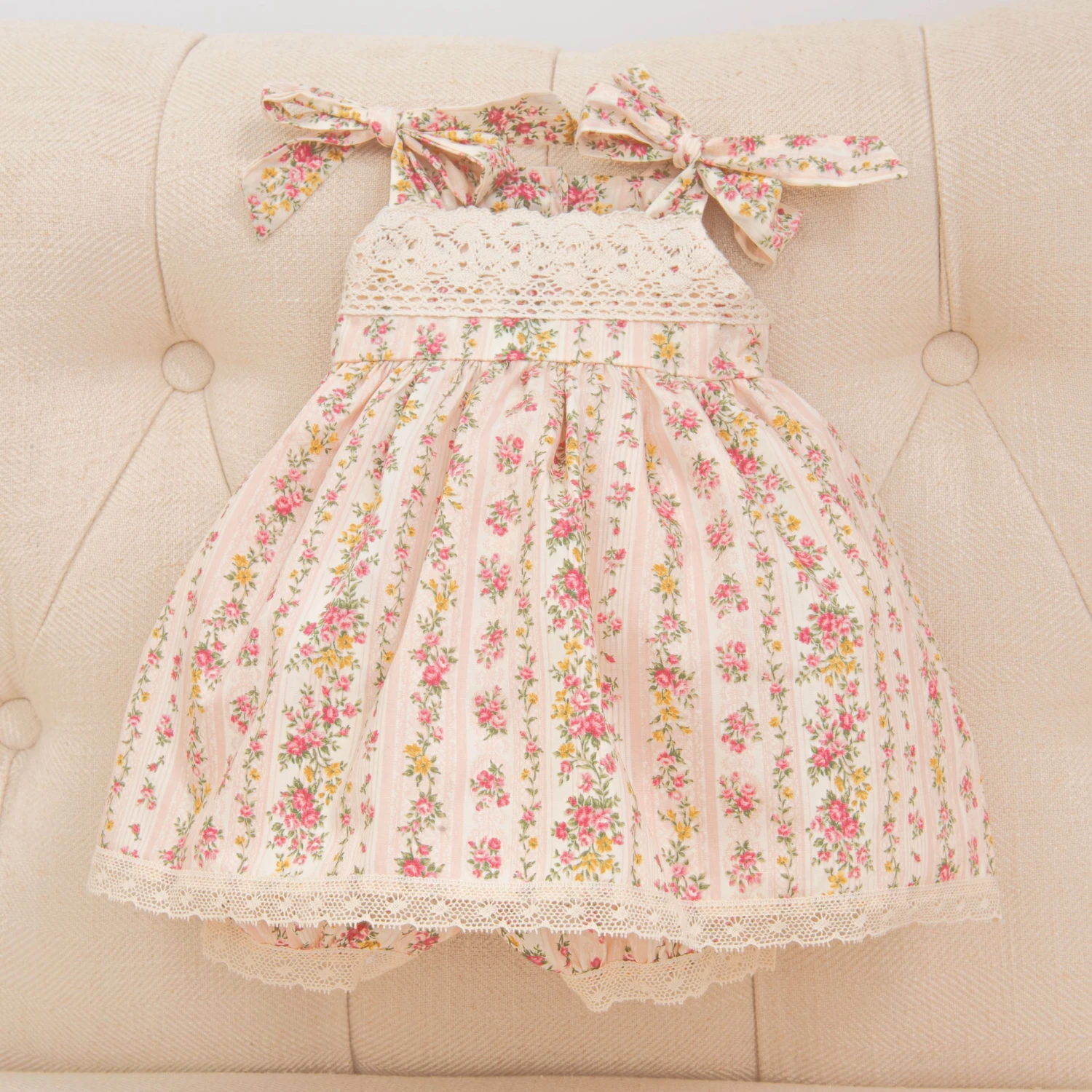 A beautiful rose floral and striped cotton romper sun dress is just right for any Spring or Summer party! Trimmed with natural toned laces to compliment the blush or powder blue stripes, the pink and yellow roses sprinkled among the various stripe style patterns make this antique inspired material the most charming style. Faux tie shoulder straps and a summary closer on the back help to create an easy fit and snaps along the romper legs allow for easy changes throughout the day! Pair with her matching Eloise Booties, Suede Tie Mary Janes and Bow Headband for a perfectly styled look.