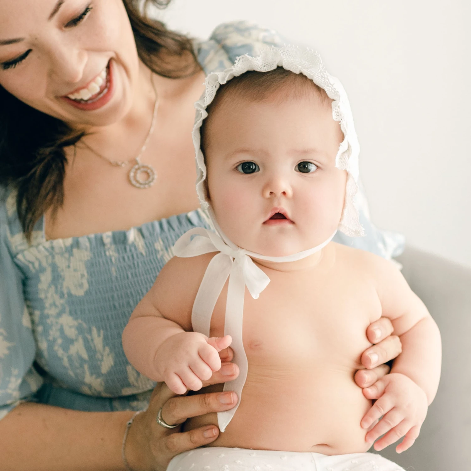 The Emily Bonnet is crafted with a soft and light 100% cotton eyelet lace. Delicately embroidered with a vintage inspired flower design, the bonnet features a ruffled cotton lace front that will frame her face perfectly. Cotton ribbon ties create a perfect fit and beautiful finish. This bonnet is an ideal pair to match the Emily Dress!