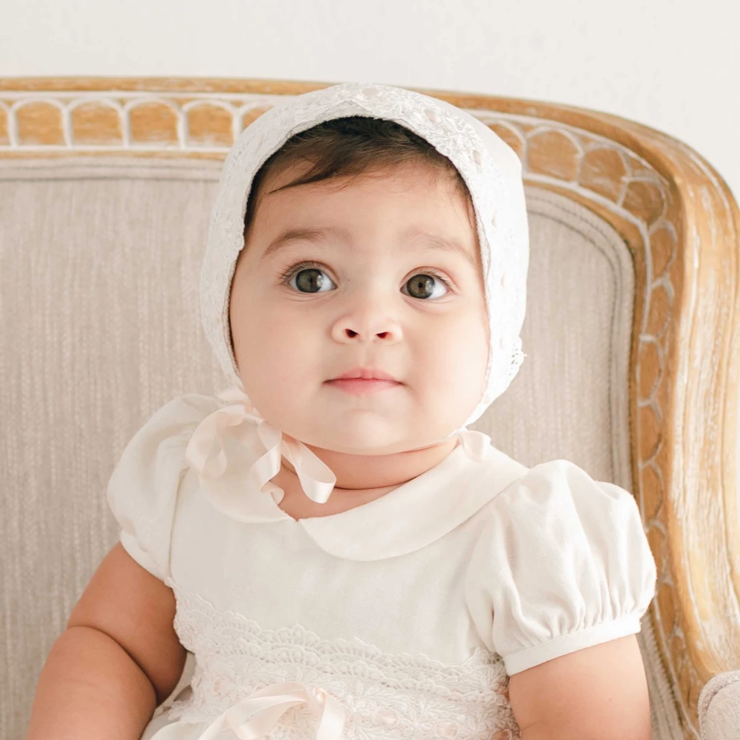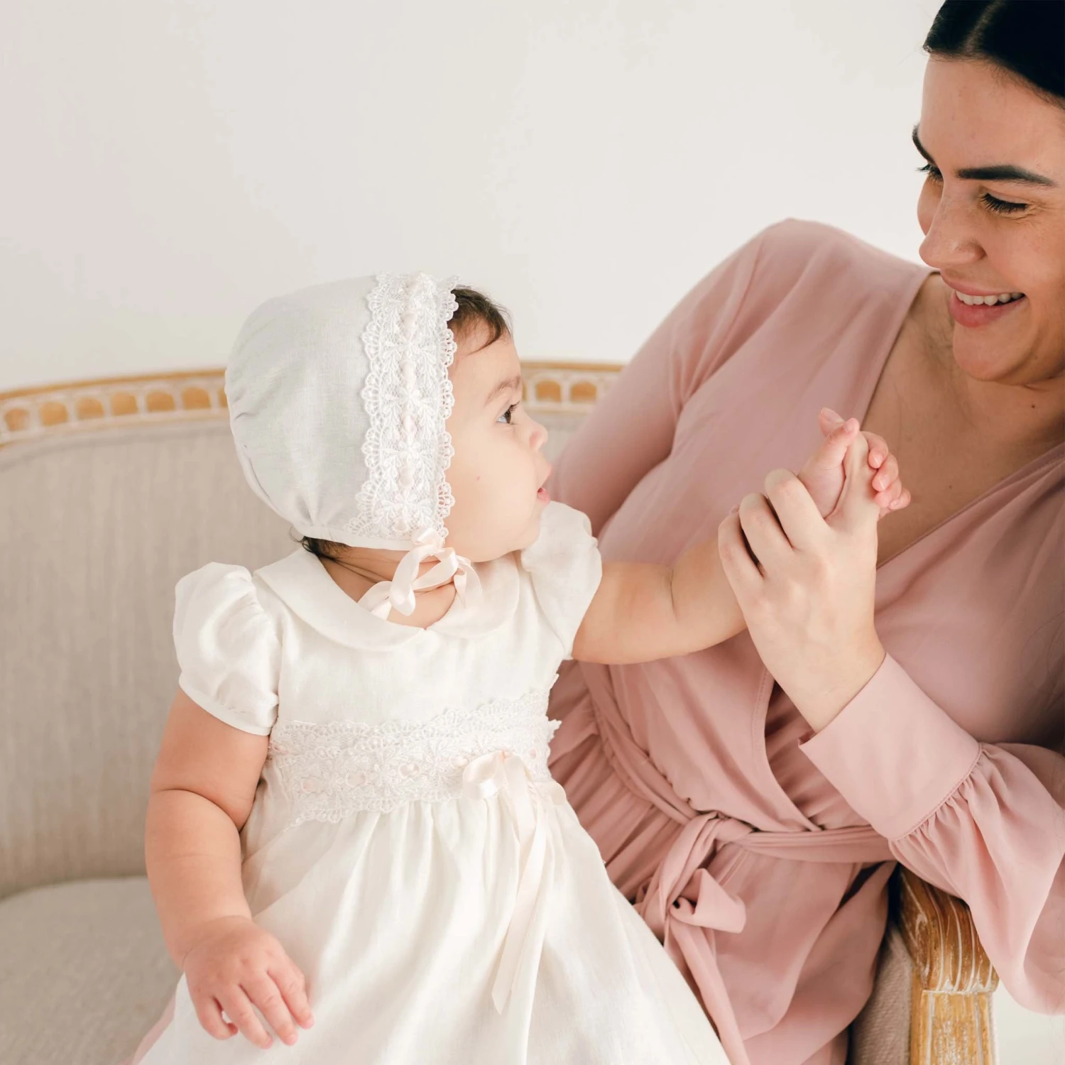 The Emma bonnet was made to match perfectly to her Emma bubble romper! Made with a lovely linen blend in light ivory, a soft and breathable material perfect for the little one wearing it. Detailed with a beautiful ivory lace with light pink silk ribbon woven throughout. Light pink silk ribbon ties make it easy to adjust and creates a gorgeous finish, whether you tie it to the side or directly under her chin.