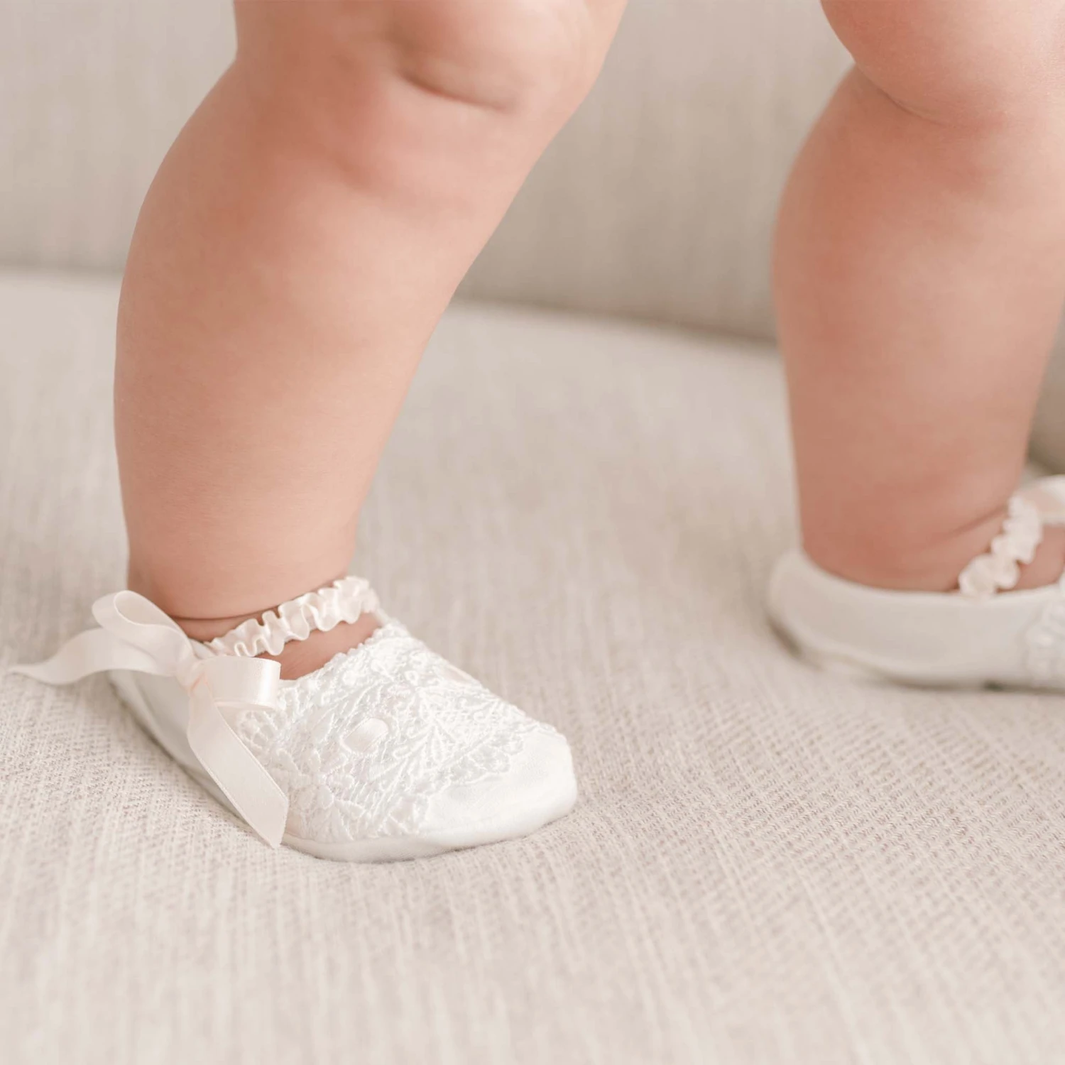 The Emma Booties are made with a soft linen blend, perfect for the little feet that will be wearing them. Detailed with a beautiful ivory lace, and light pink silk ribbons bows are the perfect accent. Soft elastic straps across the top make for a comfortable design and secure fit. A lovely match to her Emma Romper set.