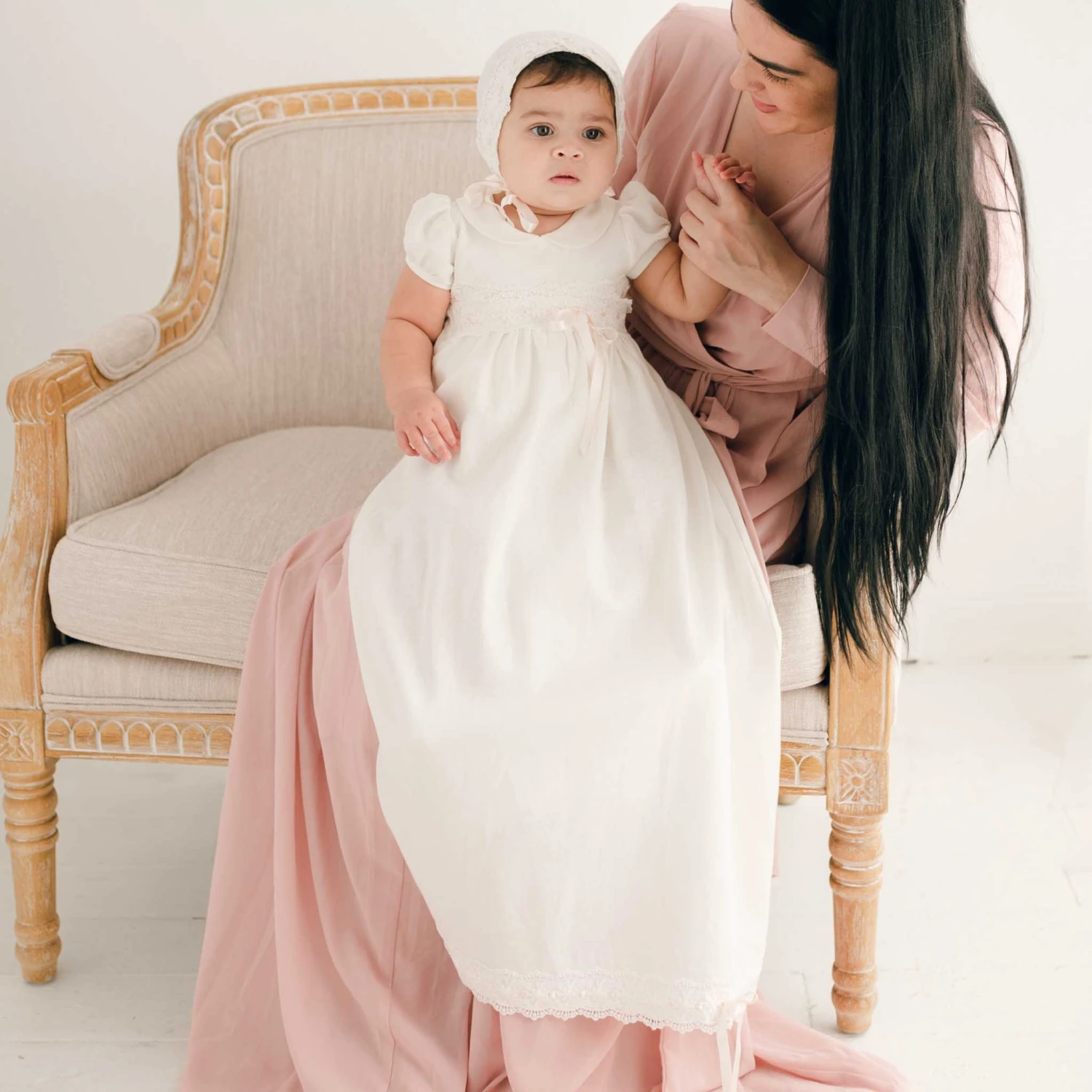 A unique convertible skirt to pull over her Emma bubble romper to create the beautiful look of a one-piece Christening Gown. The Emma convertible skirt has been created with the finest linen in the same lovely shade of light ivory as the Emma romper. A beautiful ivory lace with light pink silk ribbon woven through adorns the waist and bottom hem of the skirt. The same lace details is also found on the bodice of the romper. The skirt is designed to easily attach to the Emma romper with an elastic waist that creates a comfortable and secure fit to wear throughout the Baptism ceremony. The perfect addition to use for her special day and simply remove the skirt to wear the bubble romper alone for a completely different look!