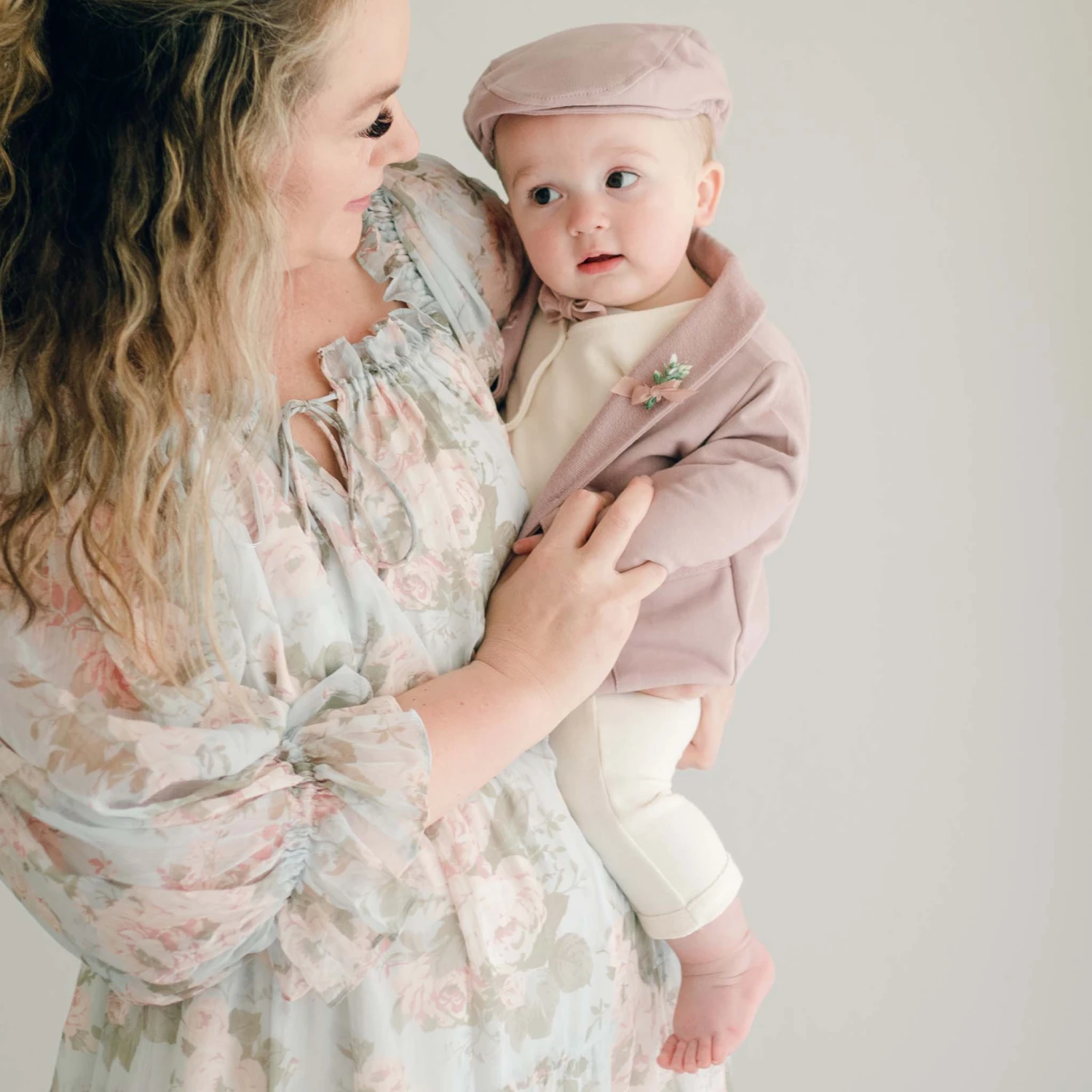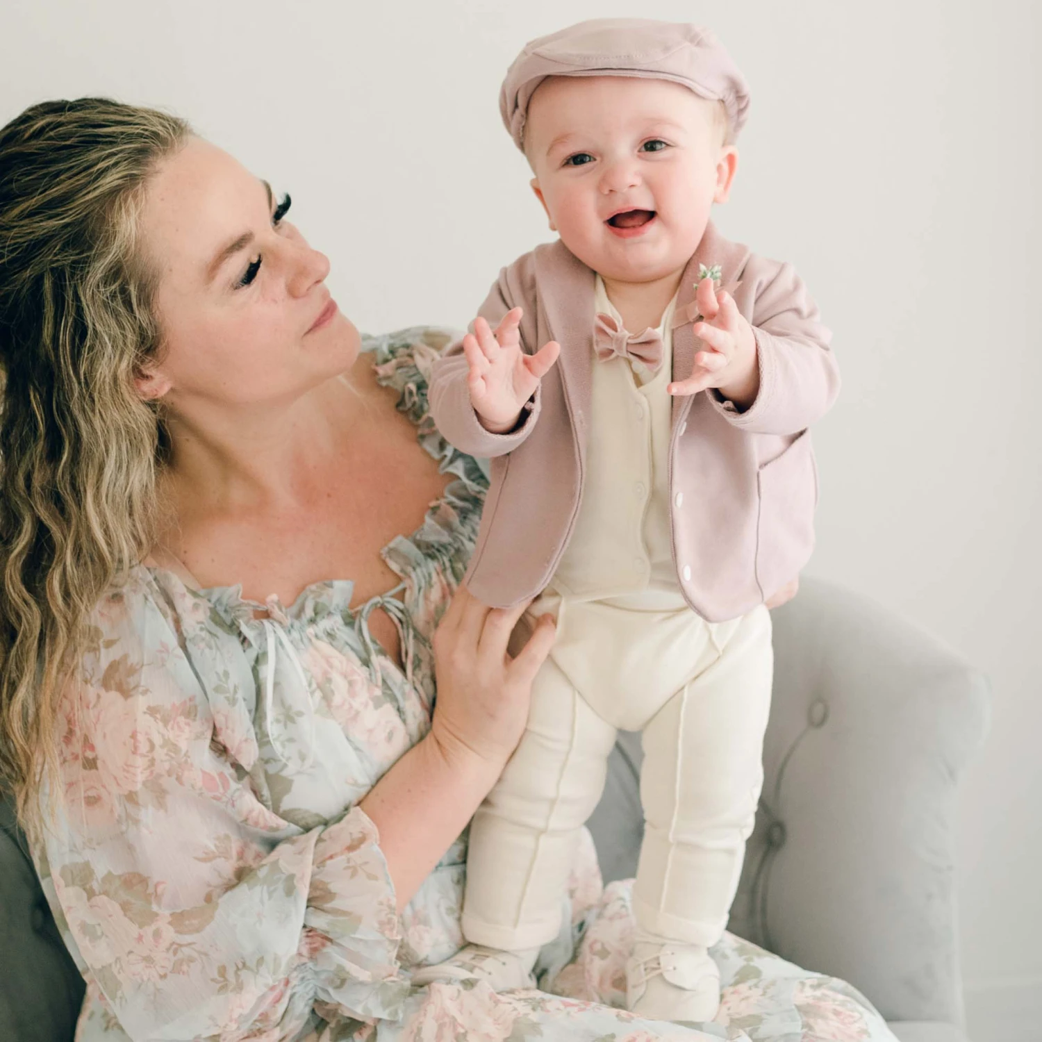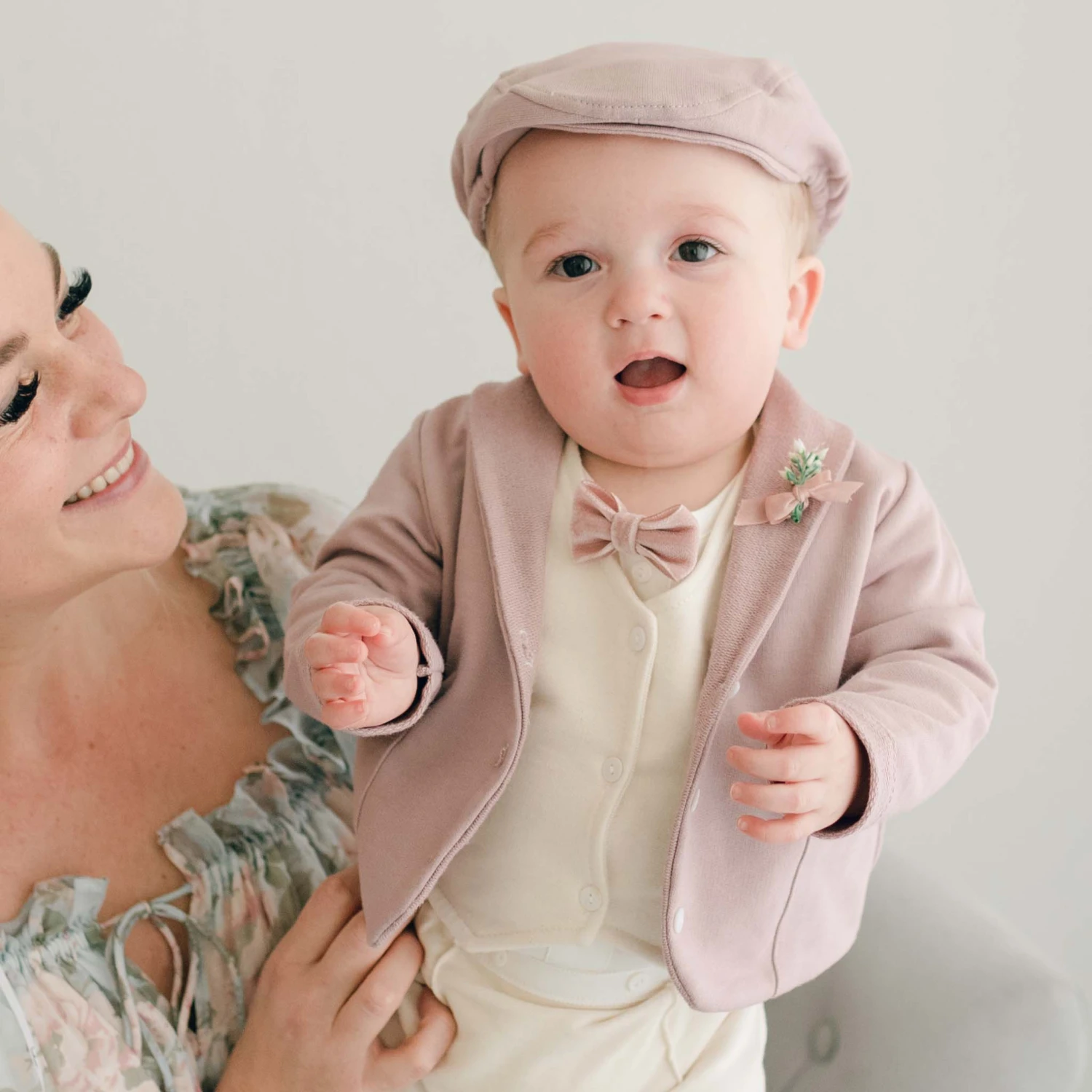 Our premium French Terry fabric lets the Ezra Baby Boy Suit bring softness and luxury to any look. Its jacket features a fold-over collar, pockets, and summarys for a stylishly sophisticated touch. This 4-piece ensemble includes a tan vest, pants or shorts, ivory bodysuit, and mauve jacket—perfect for an event or after party. Dress up the look with the matching newsboy cap and Ezra booties or a pair of our suede shoes!