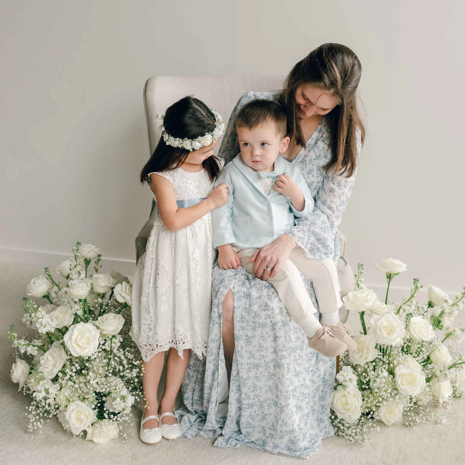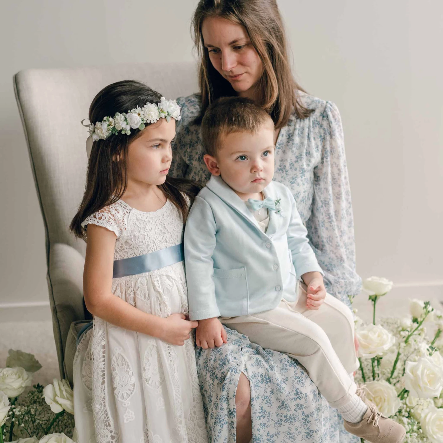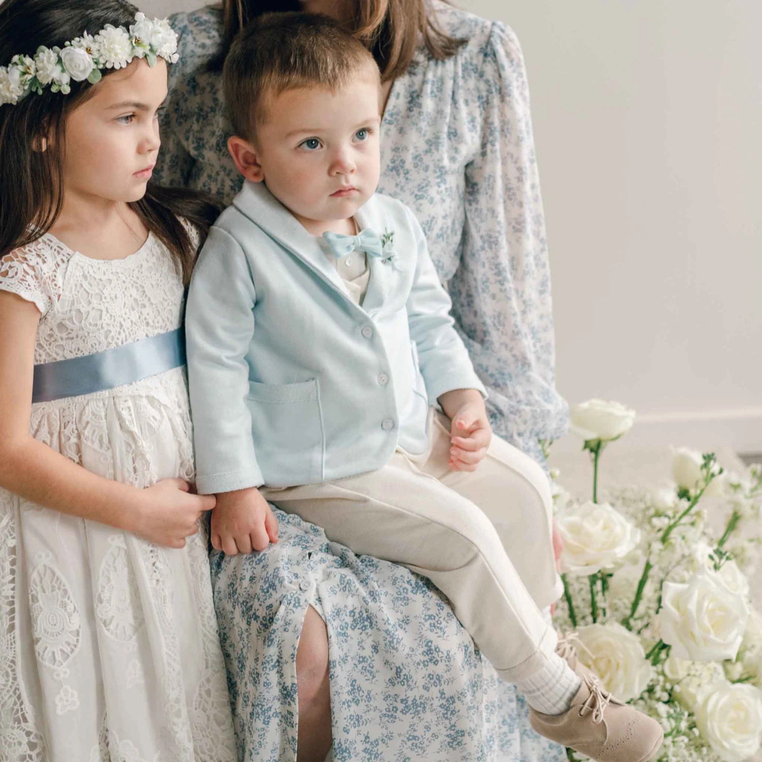 Luxuriously crafted from our premium French Terry cotton, the Ezra Baby Boy Suit provides a unique, delectably soft texture. This stylish and sophisticated ensemble includes a fold-over collar jacket with pockets and summarys, a tan vest, choice of pants or shorts, an ivory bodysuit, and a powder blue jacket, perfect for any occasion. Complete the look with the matching newsboy cap and Ezra booties or a pair of our suede shoes– behold a darling ensemble!