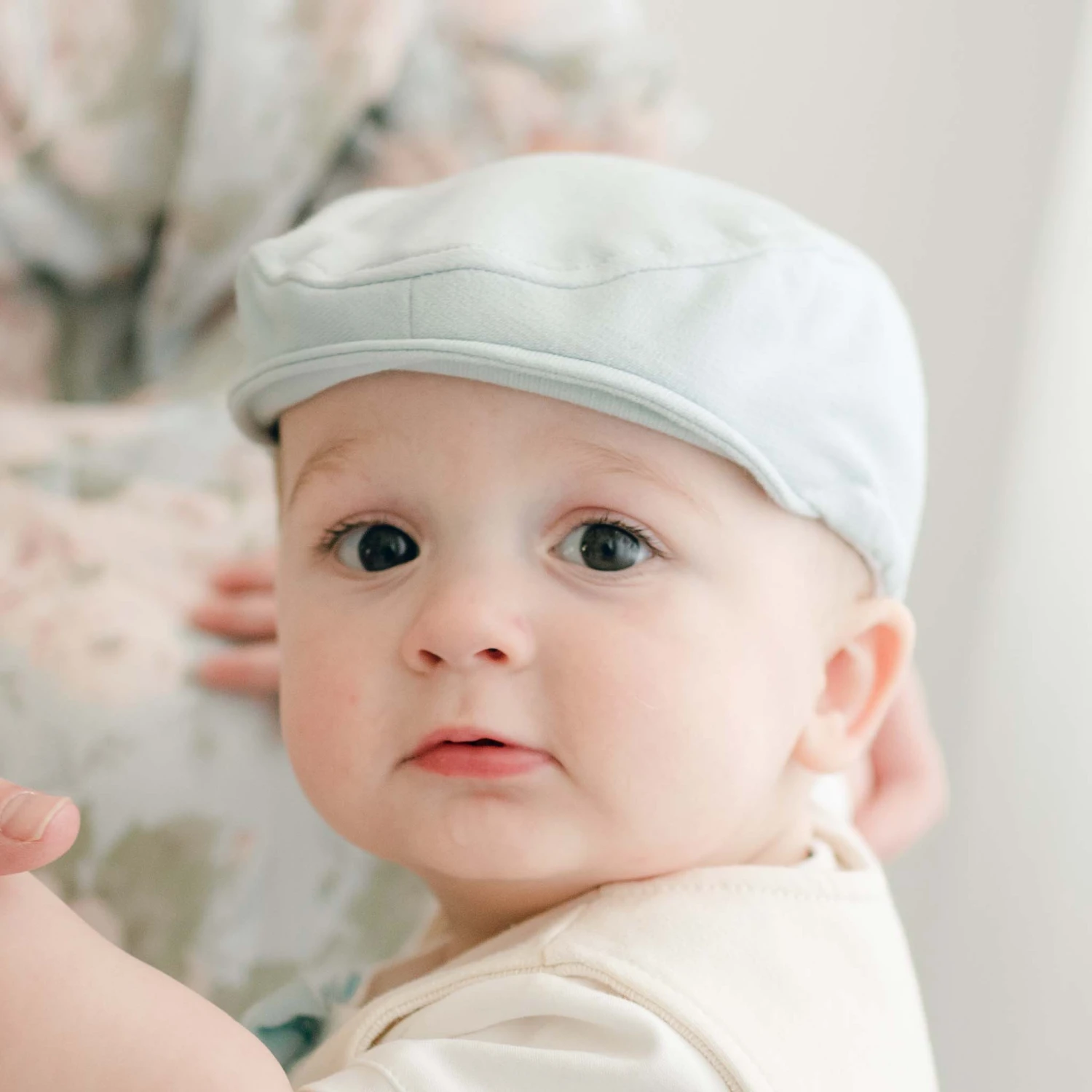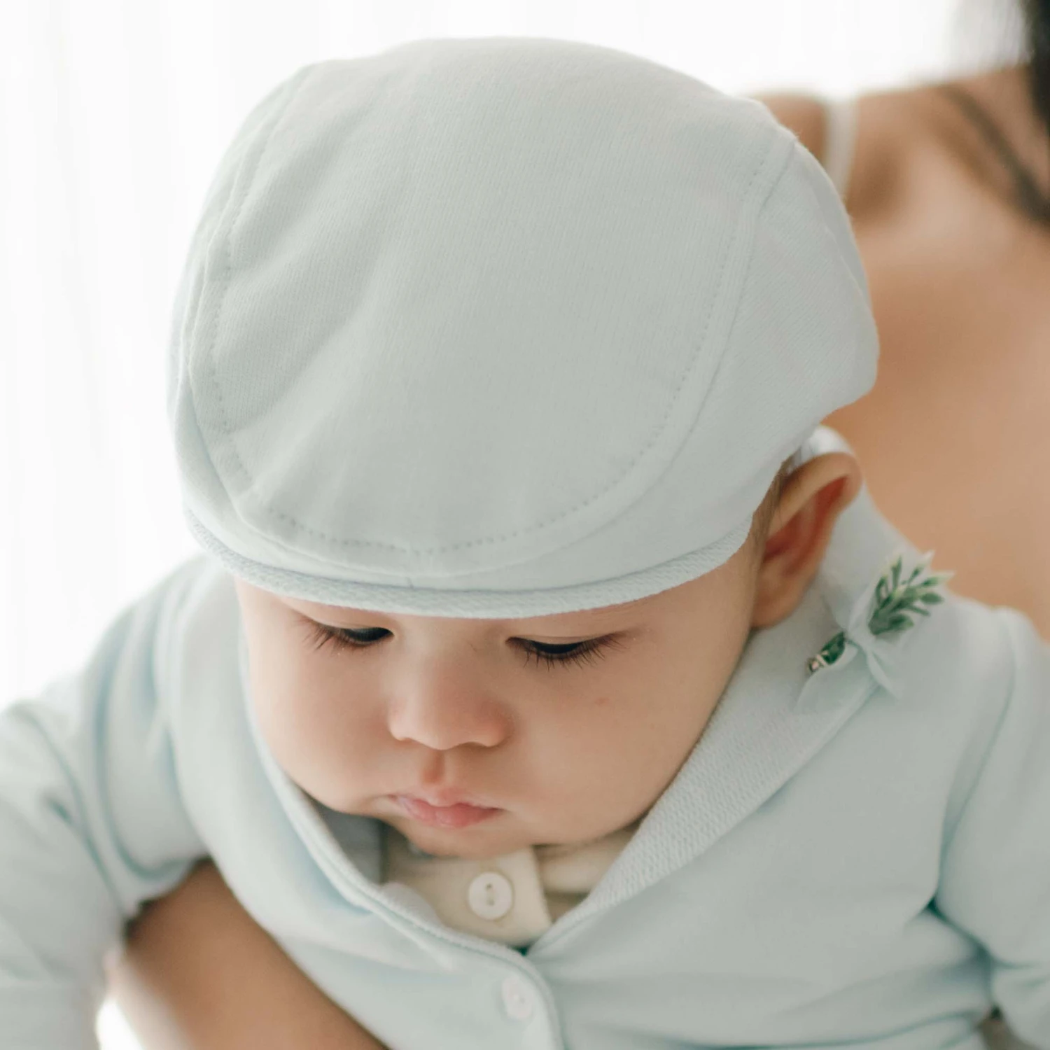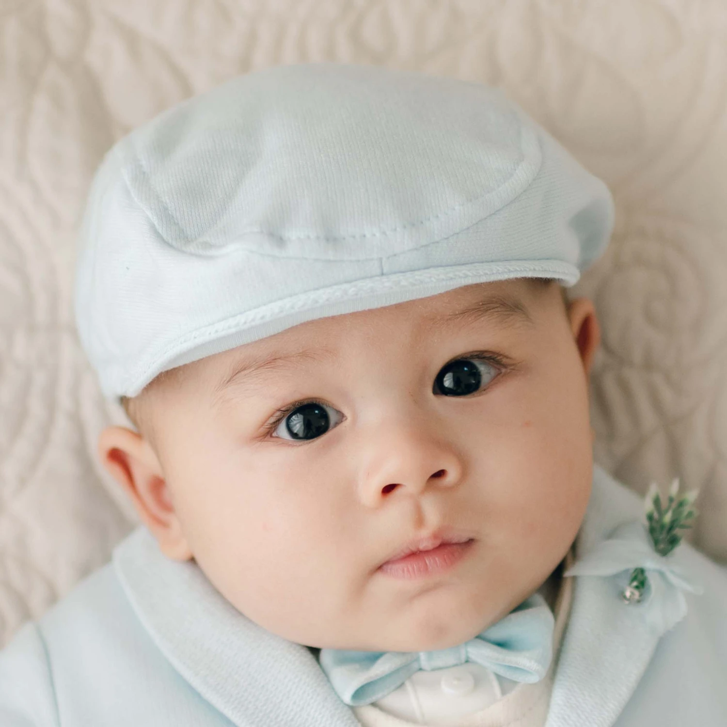 This chic newsboy cap, fashioned with the same soft French terry cotton used in the Ezra suit, is the perfect way to complete his Ezra Christening look!