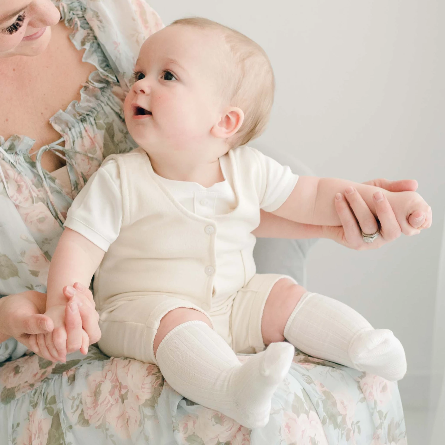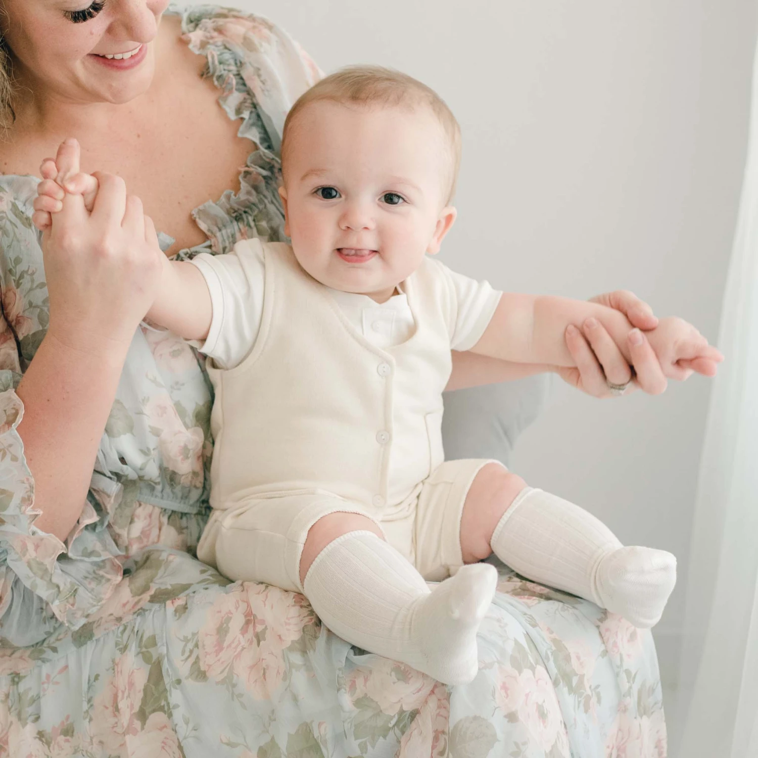The Ezra Tan Baby Boy Suit is luxuriously crafted from our premium French Terry cotton, lending a unique and delectably soft texture. Showcasing a jacket with a fold-over collar, pockets, and summarys, it adds style and sophistication to any occasion. This suit includes his tan vest, your choice of pants or shorts, ivory bodysuit and Tan jacket, for a suit fit to go from event to after party! Complete the look with the matching newsboy cap and Ezra booties or a pair of our suede shoes for a darling ensemble.