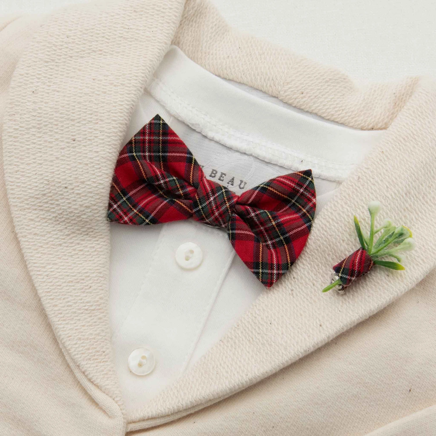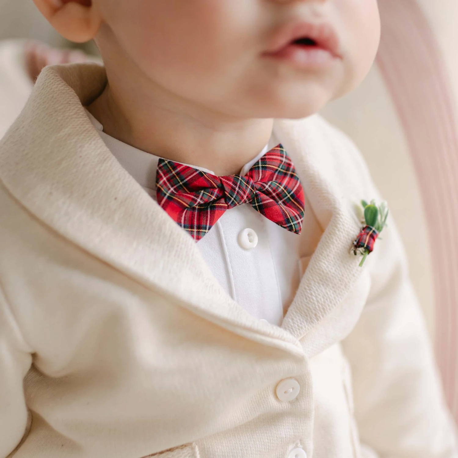 This sweet red plaid bow tie and matching boutonniere are the perfect accompaniment for any Holiday outfit. Whether paired with a Gabriel suit for a polished look, or added to an entirely different ensemble for a unique touch, these pieces are sure to add charm and class. The bow tie fastens with a small alligator clip and the boutonniere is securely held by a locking pin back.