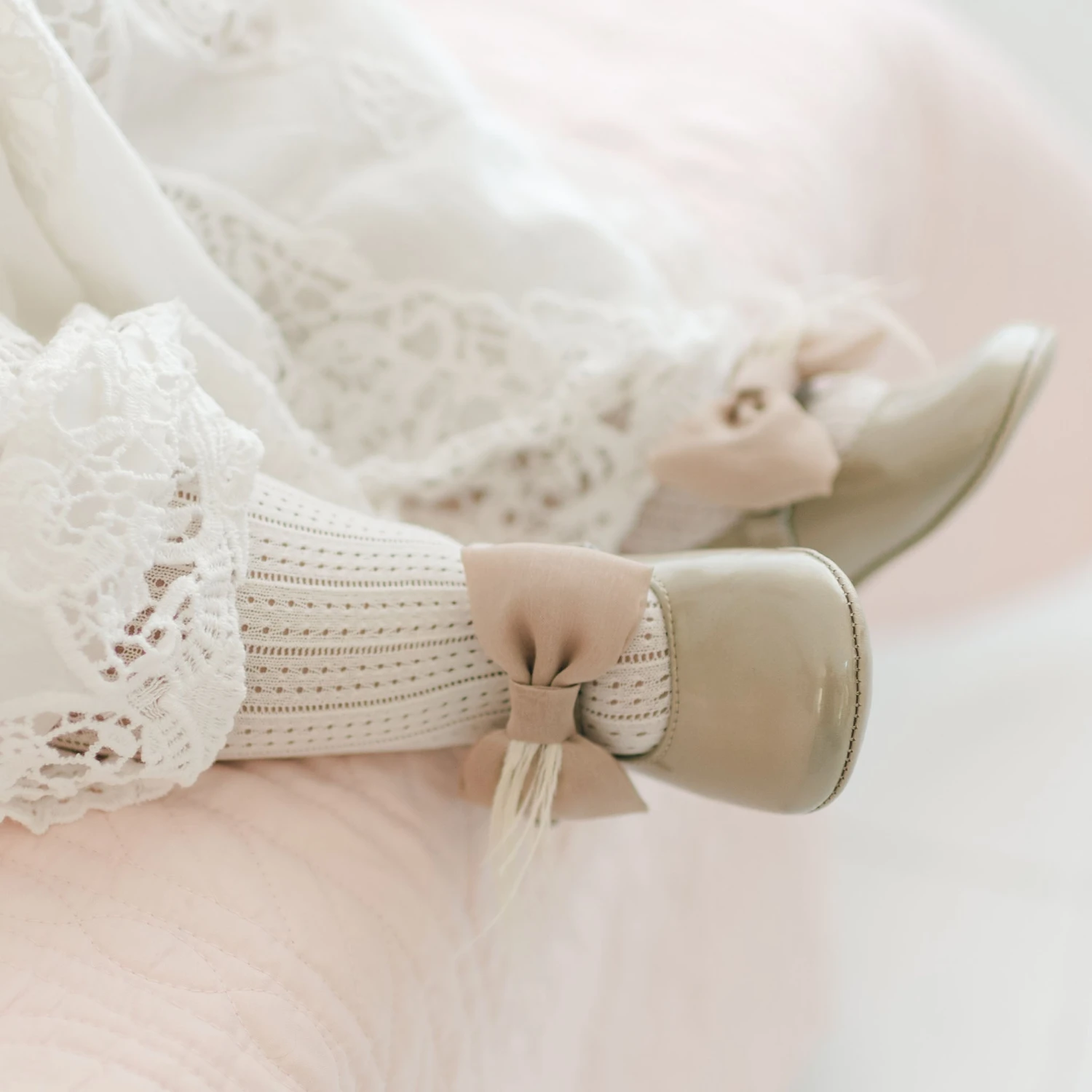 The Baby Beau & Belle Gold Patent Leather Mary Janes complete her outfit! These shoes are hand made for Baby Beau & Belle. They are made with gold patent leather with a soft velcro strap that features a coordinating champagne chiffon bow and feather, that is easily removable. Give her feet a special treat with the Baby Beau & Belle Mary Janes.