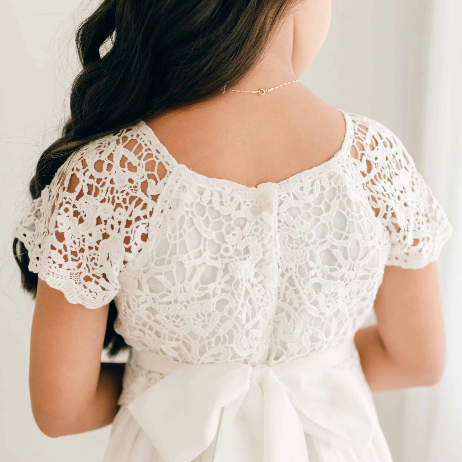 An elegant tea-length dress, the Grace Lace dress is hand-crafted down to the last detail. Made from a silk and cotton blend in ivory featuring a Venice inset for a detailed beauty not found on most girls dresses. A lace bodice with cap sleeves add to the uniqueness of the dress. Ties in back with a sash for a perfect fit. Finish off her look with the Grace Lace headband or bow clip and you’re set! Ideal for her communion, family photos, or as a flower girl dress.