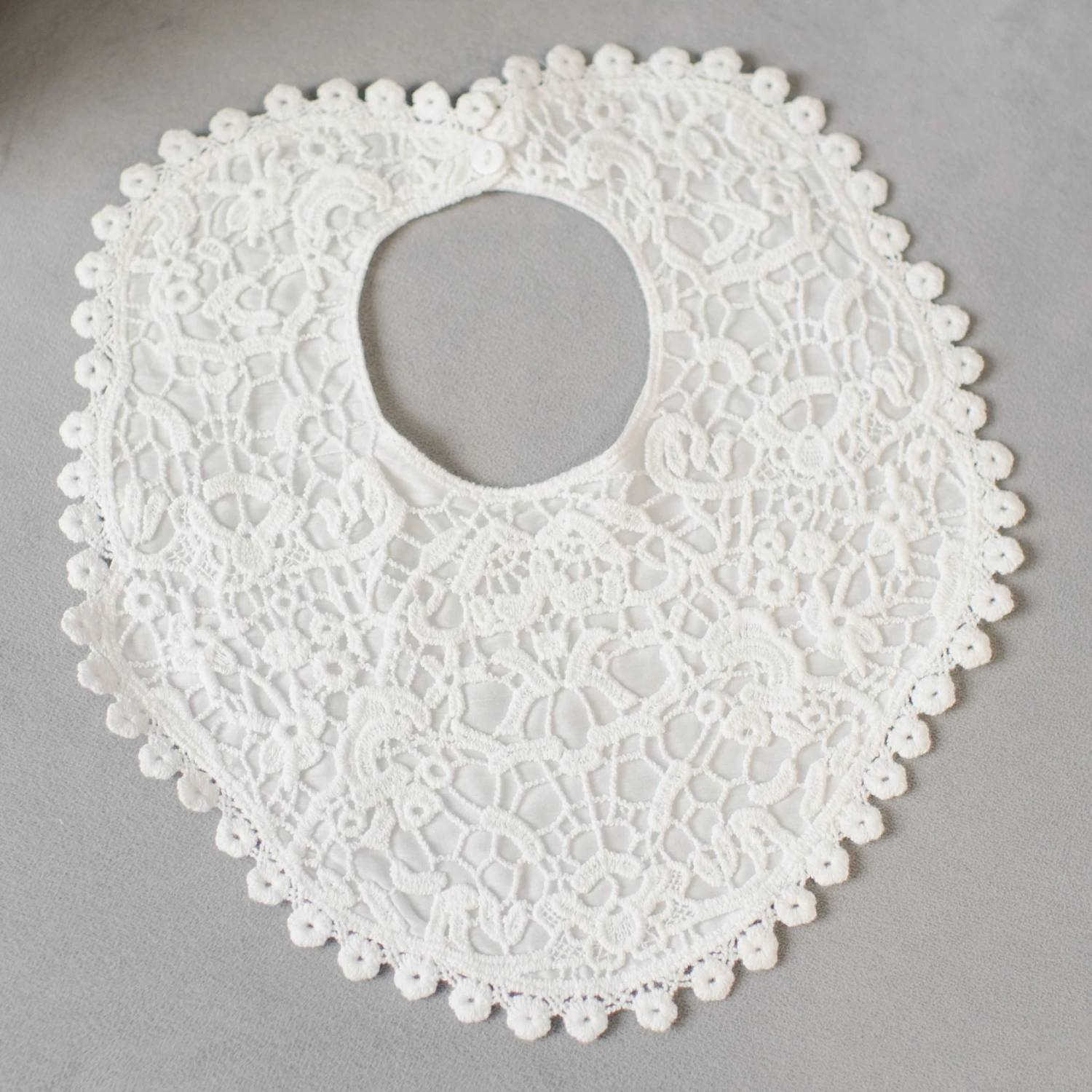 The Grace Lace Bib is the perfect match to the full length Christening gown. Designed with a silk and cotton blend lining and cotton lace inset, cotton lace accents the edge and secures with a summary. Also makes a great gift that can match to any outfit.