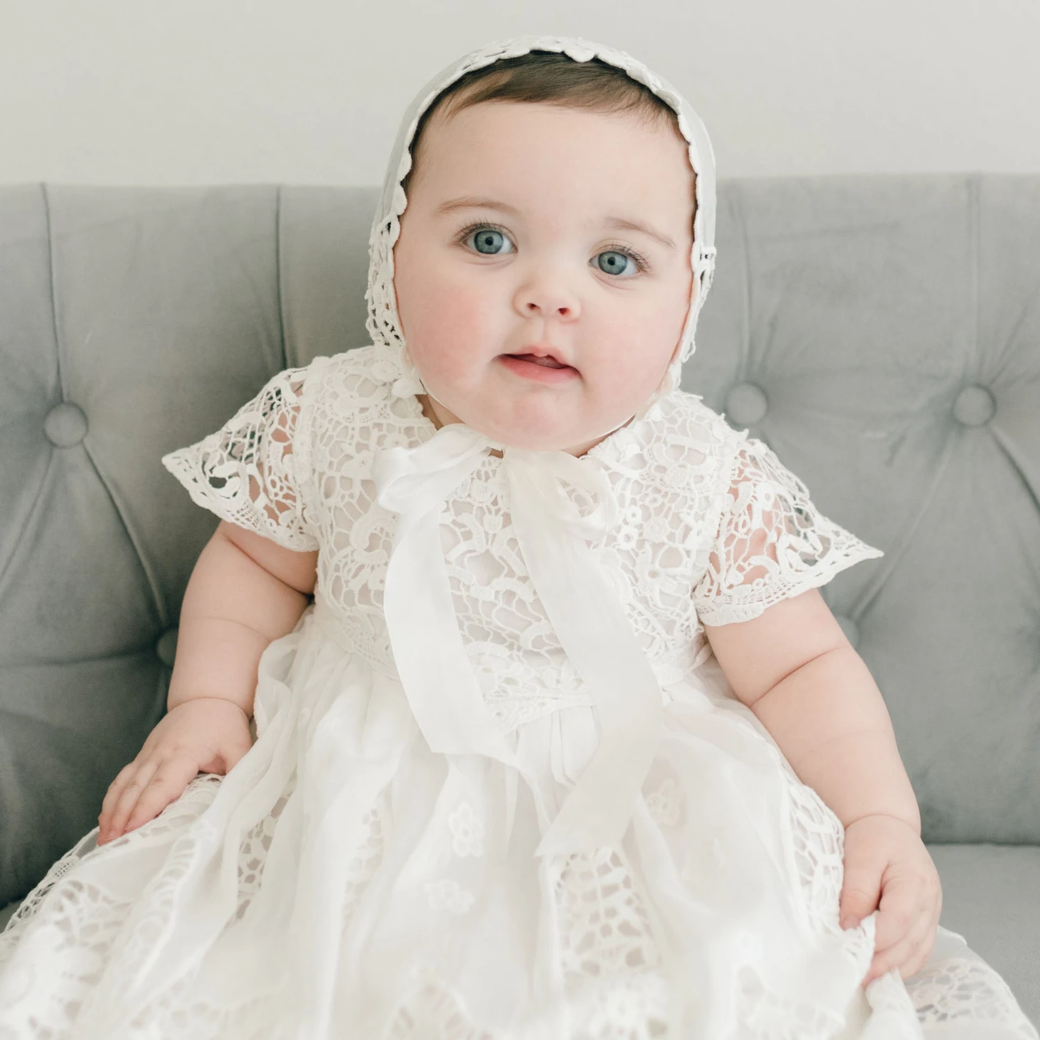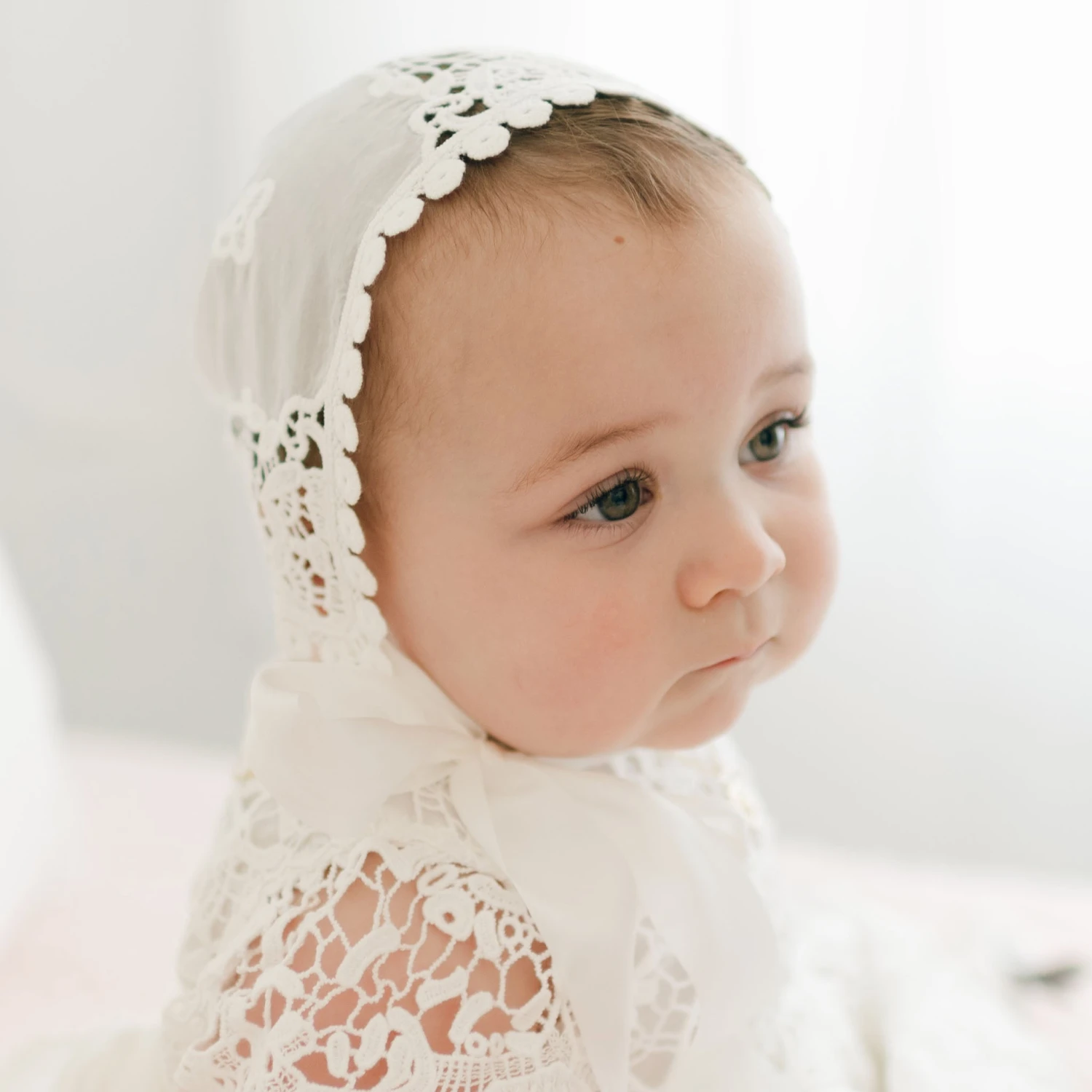 An absolutely beautiful bonnet for your little girl’s christening day. This lace bonnet is uniquely designed with richly embroidered light ivory lace and cotton floral edge lace at the back. It is a fitted style for a traditional feel that will have friends thinking it was passed down in your family for generations. The keyhole in the back is adjustable for a near custom fit to your little one- just tie it tighter or relax the ribbon for a more loose fit. The silk ribbon ties under her chin allow for a comfortable fit, and add a beautiful bow as well.