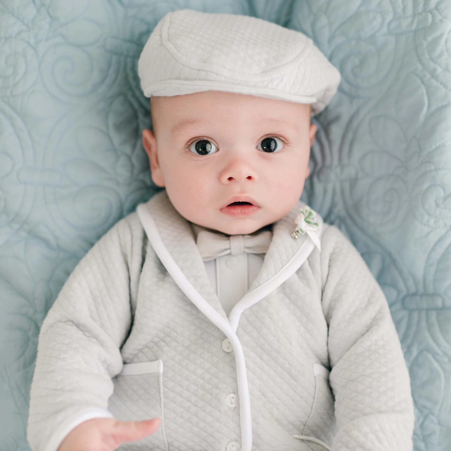Introducing our Grayson 3-Piece Suit for your newest addition! Made from soft quilted cotton and French terry, this baby boy suit features unique textures not commonly seen in newborn dresswear. The folded collar, functional pockets, and pleated front creases on the pants give your little one a regal appearance, fit for a stylish prince. Complete his look with the newsboy hat, booties, and blanket – perfect for weddings, special occasions, and adorable photo ops. From bringing baby home to first birthday celebrations and more, your little one will feel cozy and dapper in the Grayson baby boy suit!