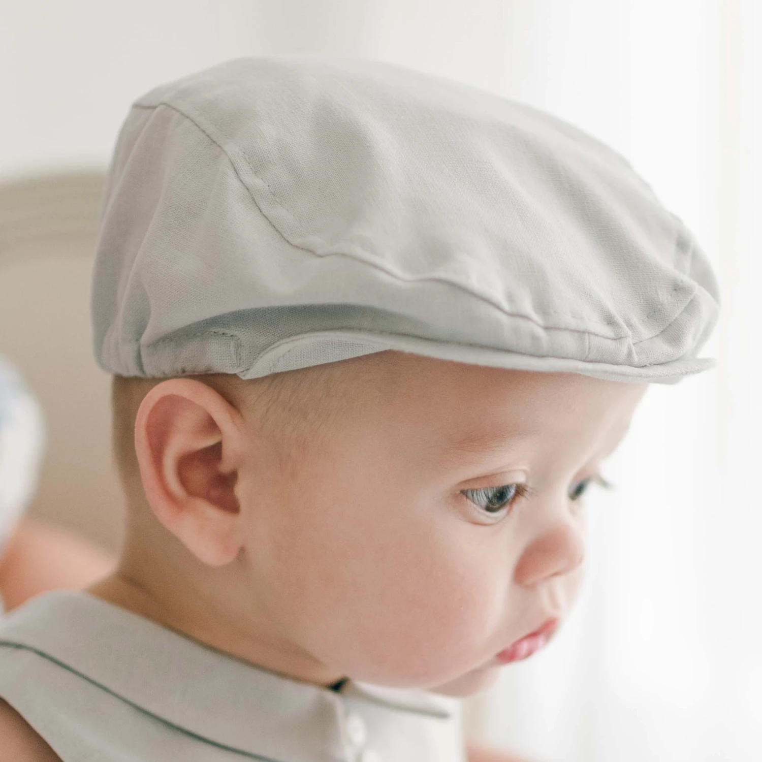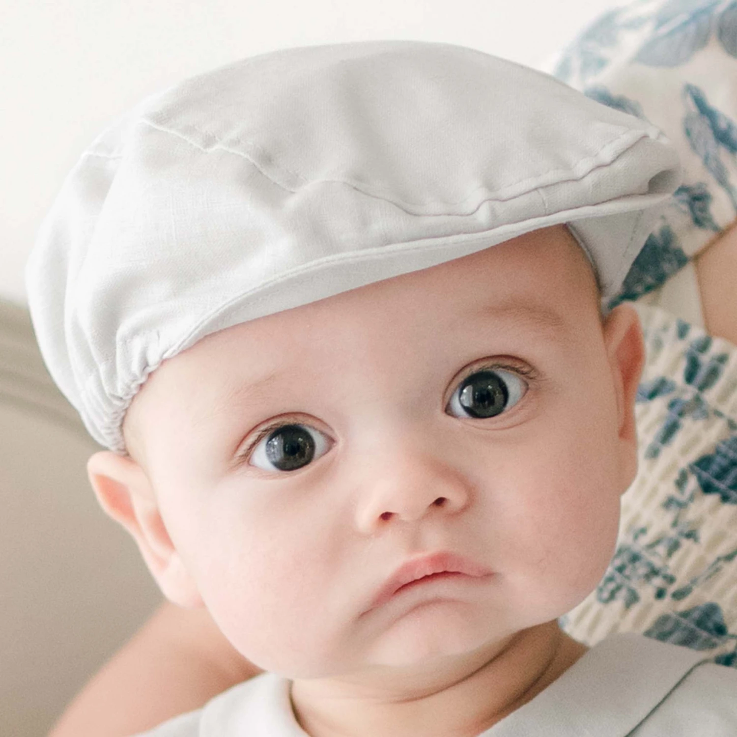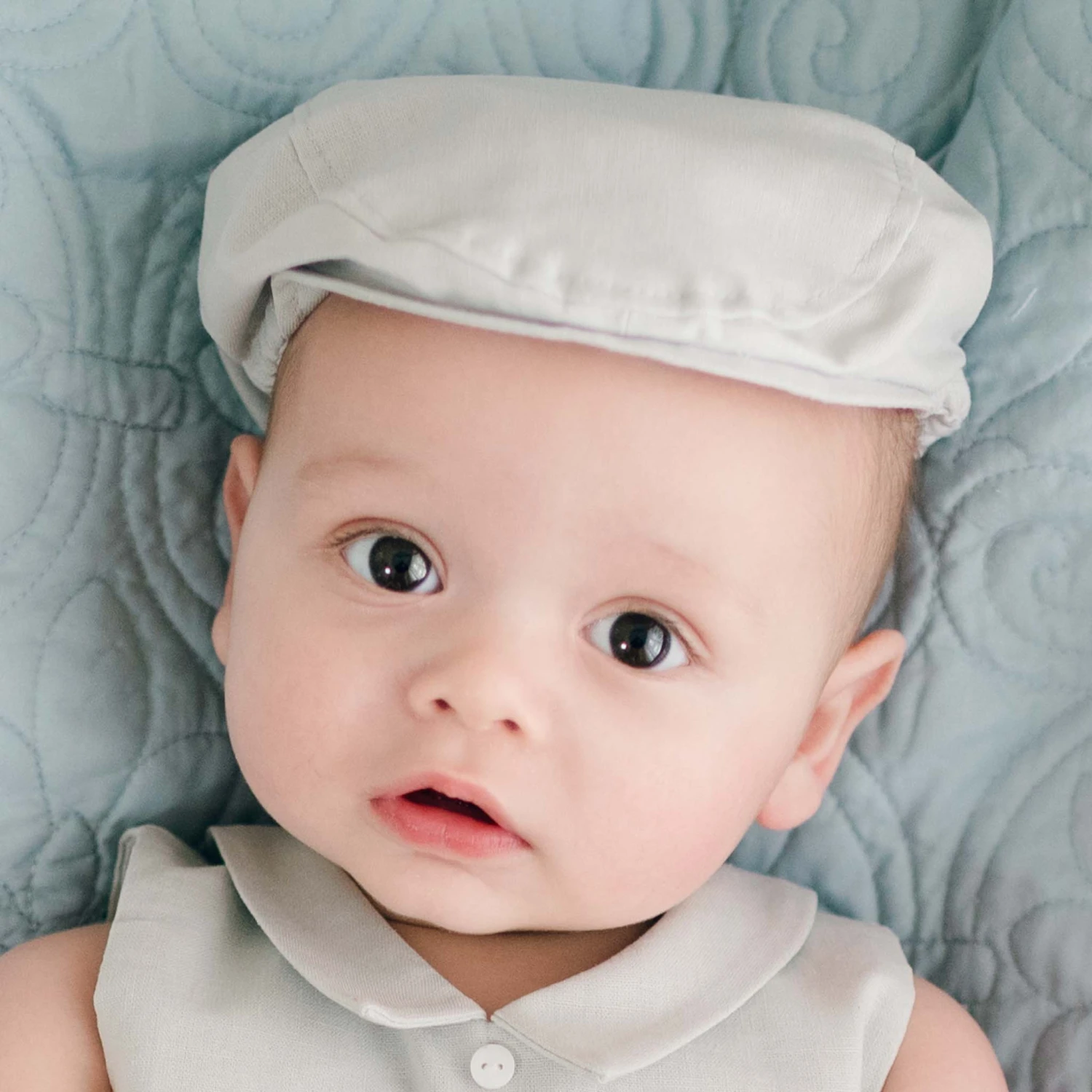 The perfect pairing with his Grayson linen romper! Using the same grey linen used to make the Grayson romper, this newsboy style hat is the perfect match to wear all day. Fully lined and featuring a soft elastic band around the back half to ensure a snug and comfortable fit that he will be able to wear all day.